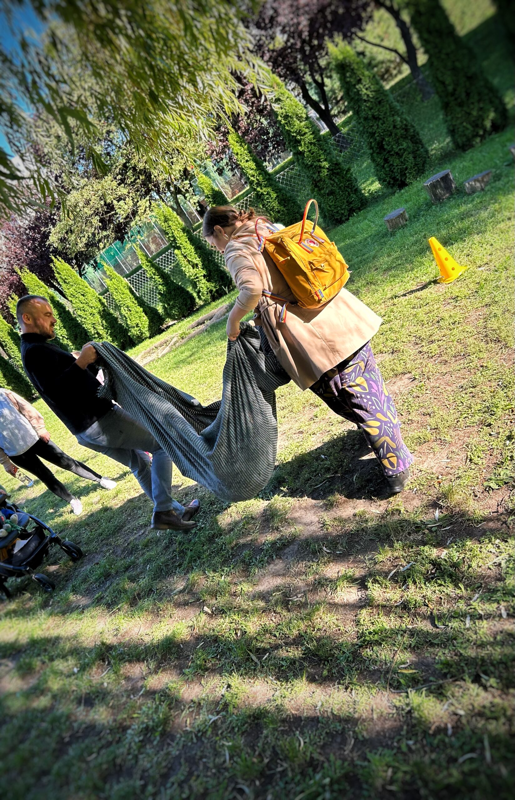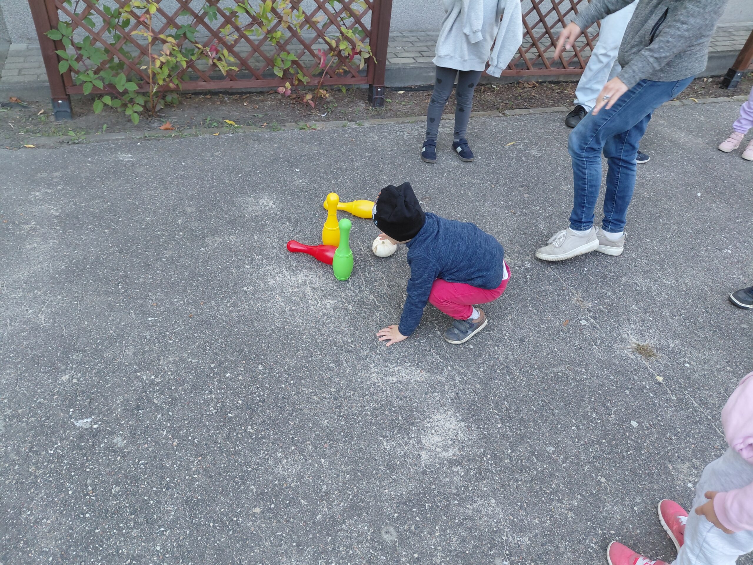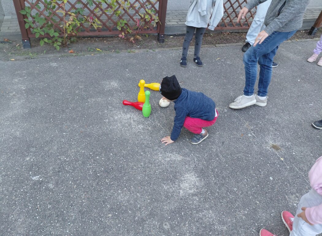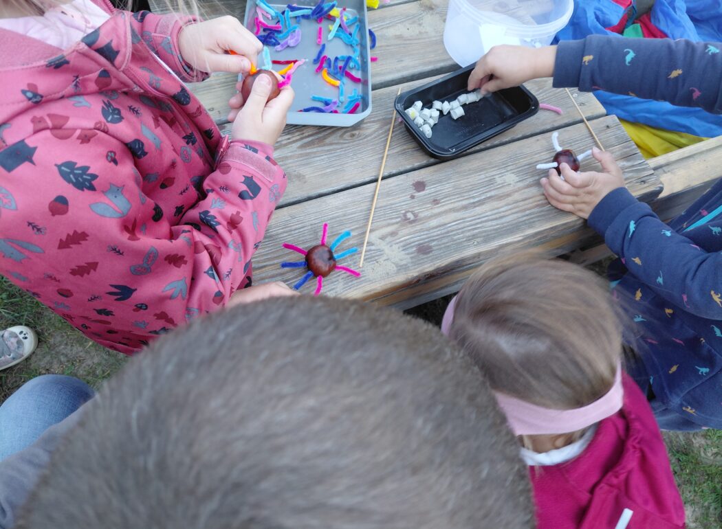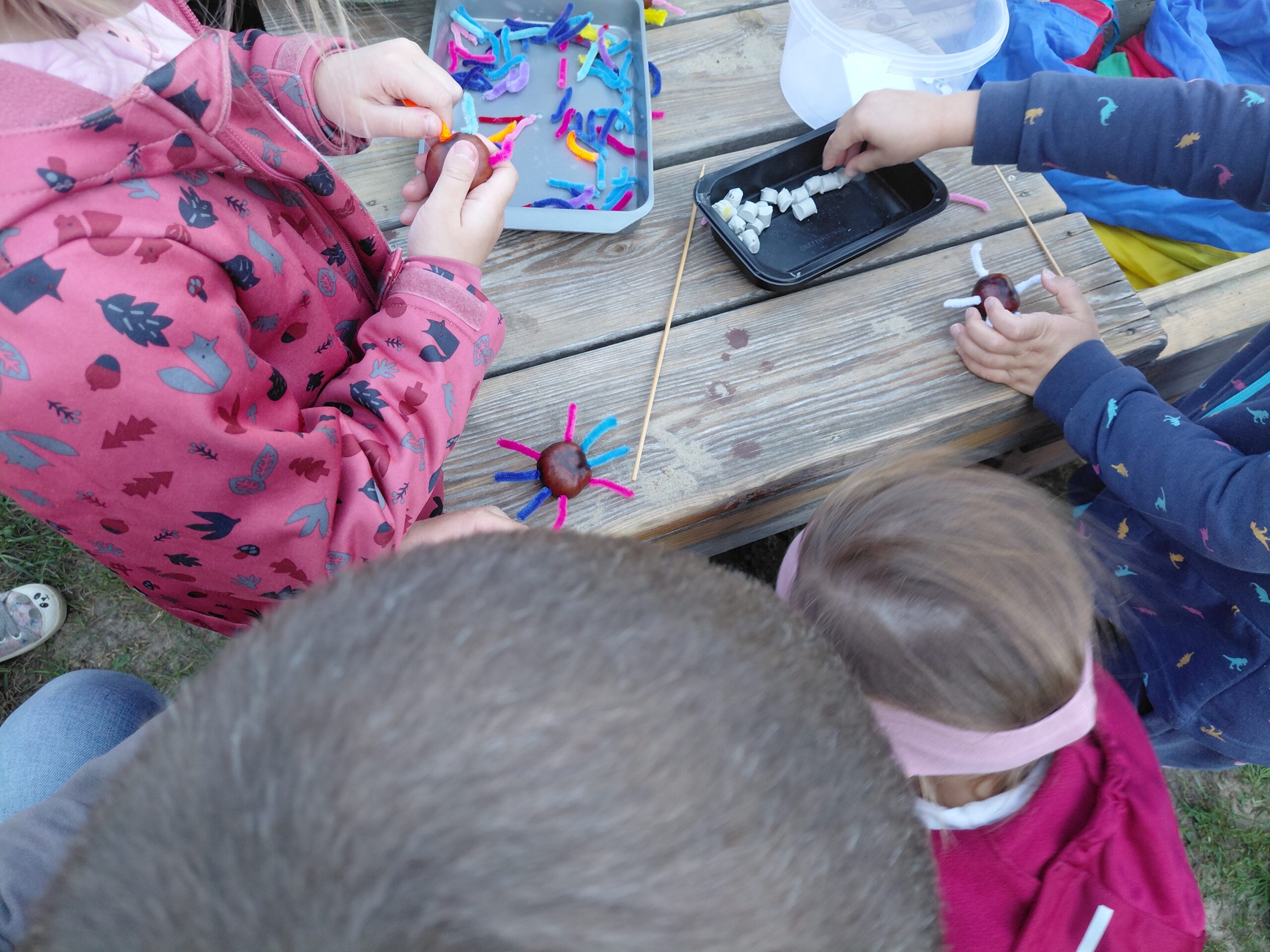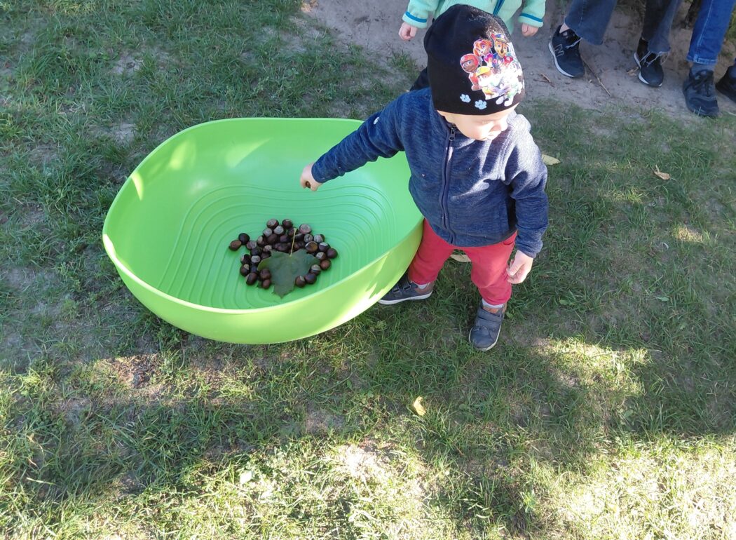 Z okazji nadejścia jesieni, razem z paniami Nauczycielkami zaprosiliśmy rodziców na jesienne zabawy w ogrodzie przedszkolnym. Całymi rodzinami wykonywaliśmy następujące zadania: graliśmy dynią w jesienne kręgle, pokonywaliśmy slalom z szyszką na łyżce, skakaliśmy jak zajączki po jesiennym polu, pomagaliśmy napełnić dziuple wiewiórki kasztanami, przenosiliśmy „kupki liści” (dzieci) w kocu. Na koniec wykonaliśmy w ramach pamiątki, jesiennego pajączka z kasztana. Wszyscy świetnie się bawiliśmy, zarówno mali jak i duzi. Jesień została oficjalnie przywitana.
