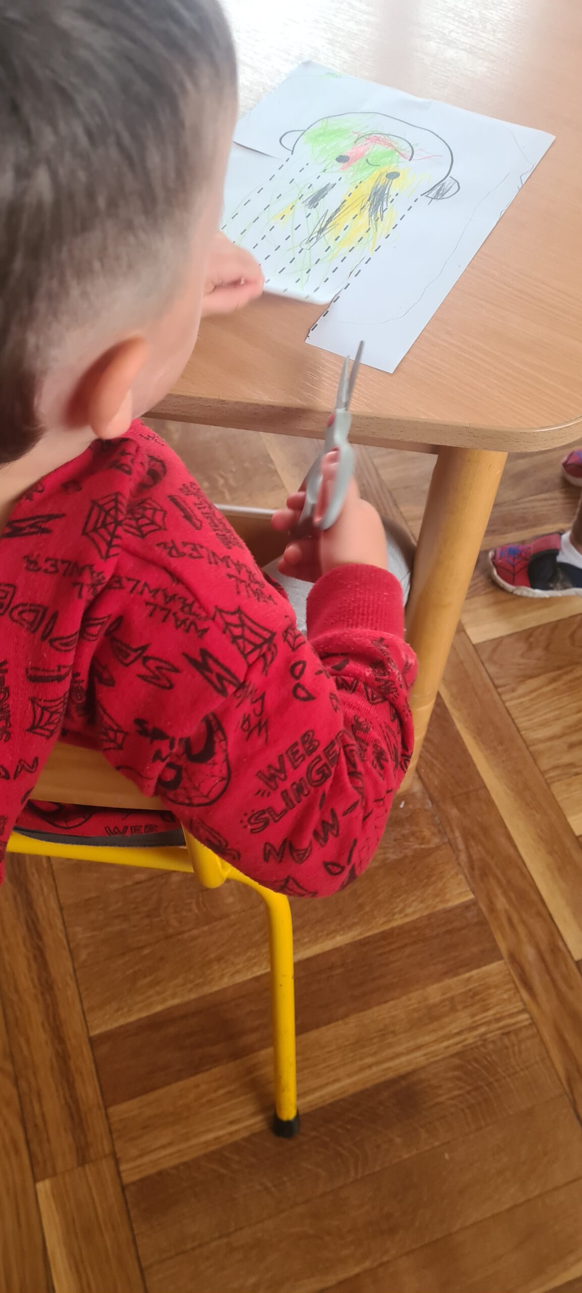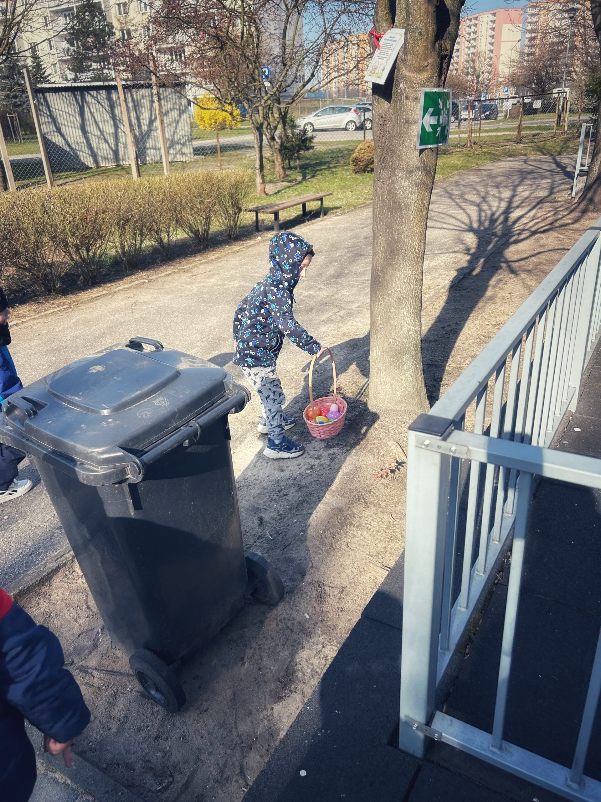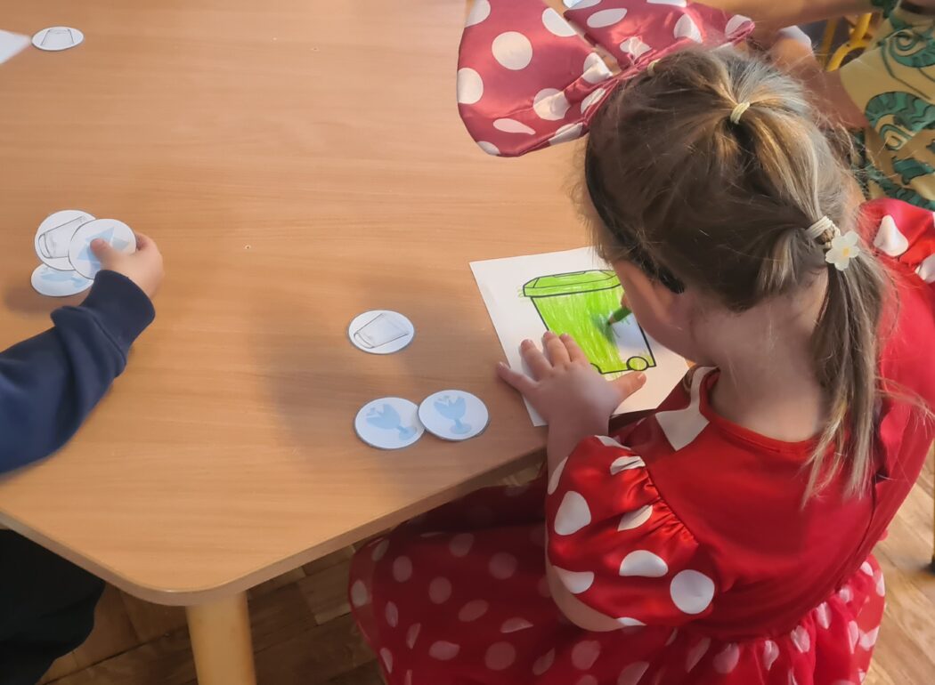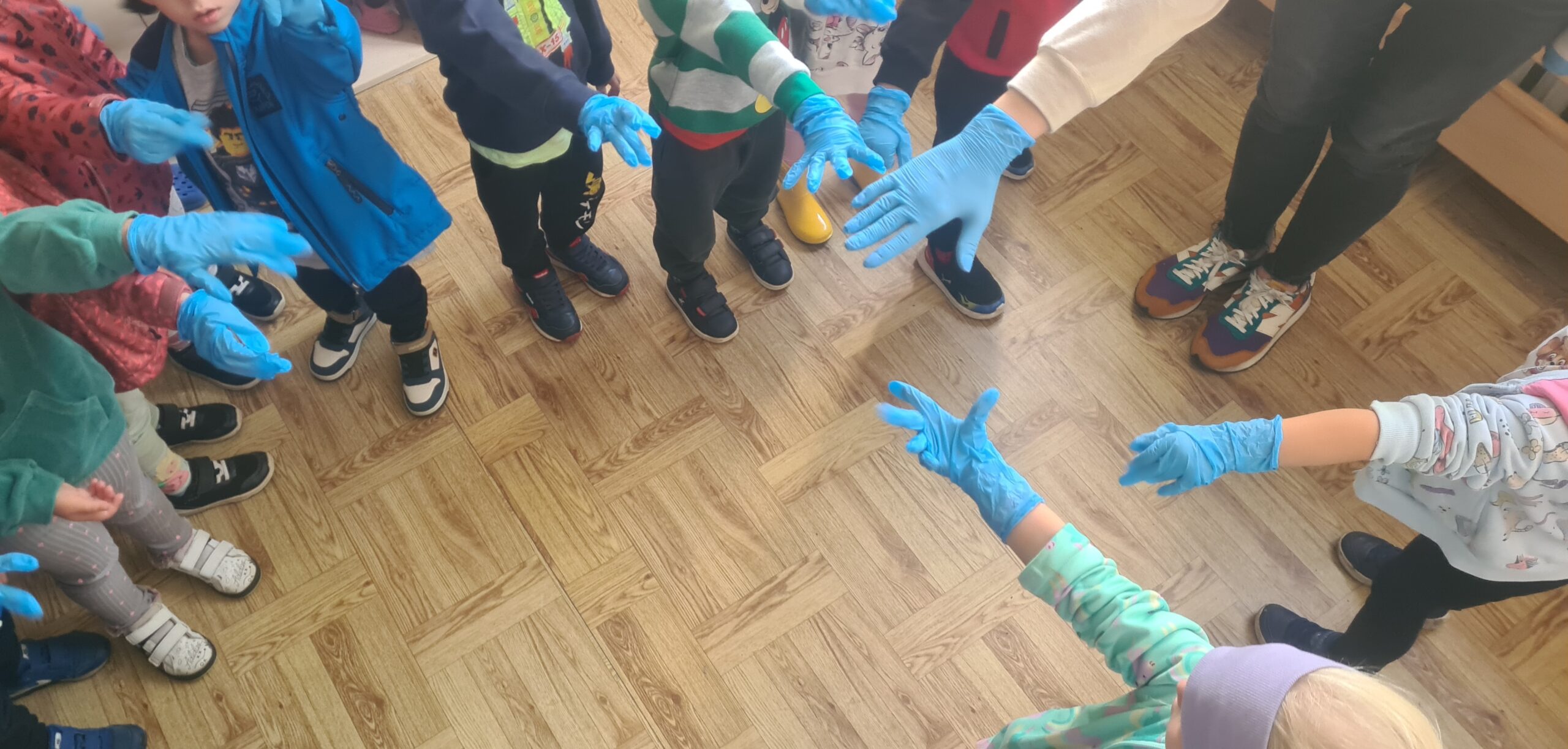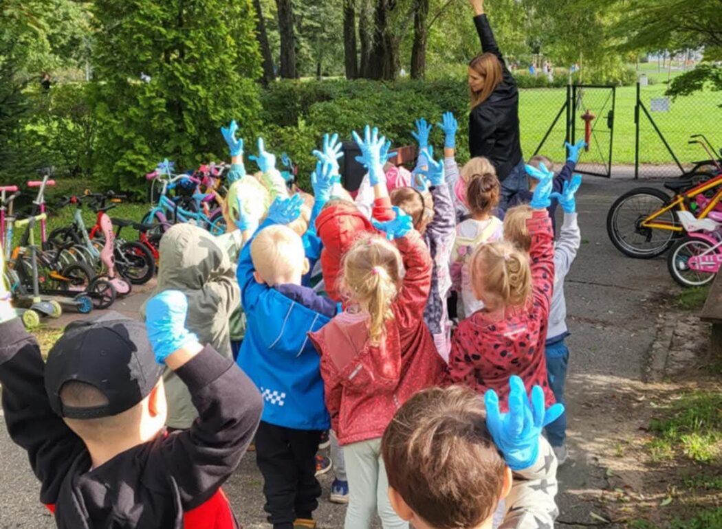 Dziś ubraliśmy rękawice i ruszyliśmy sprzątać okolice przedszkola. Okazało się, że to zadanie wymagało dużej uważności, ponieważ mieszkańcy naszego osiedla dbają o czystość. Po powrocie obejrzeliśmy teatrzyk pacynkowy „Papierek po cukierku” i używając czterech kroków empatycznej komunikacji omówiliśmy go. Przypomnieliśmy sobie też kolory koszy na śmieci i wykonaliśmy pracę plastyczną.