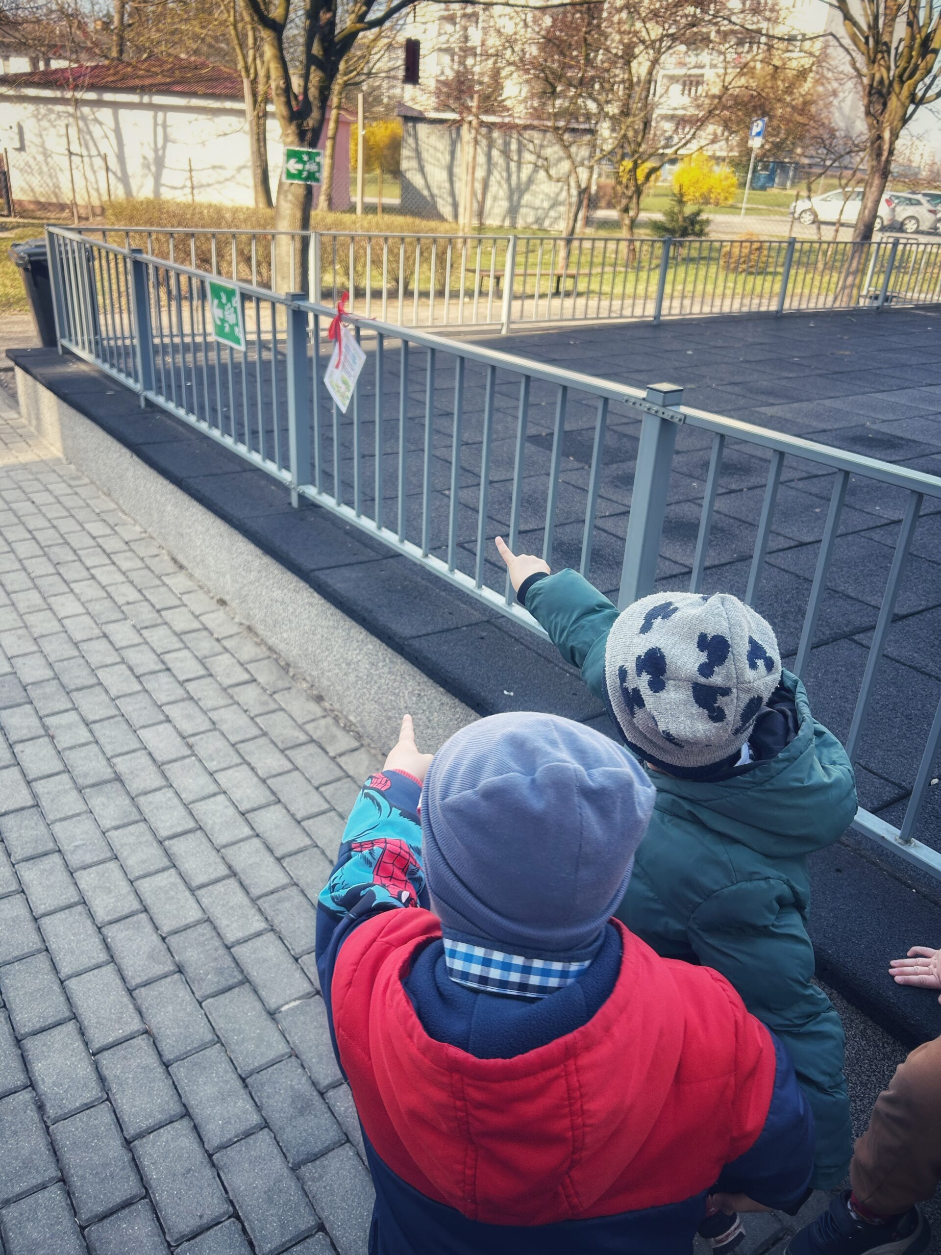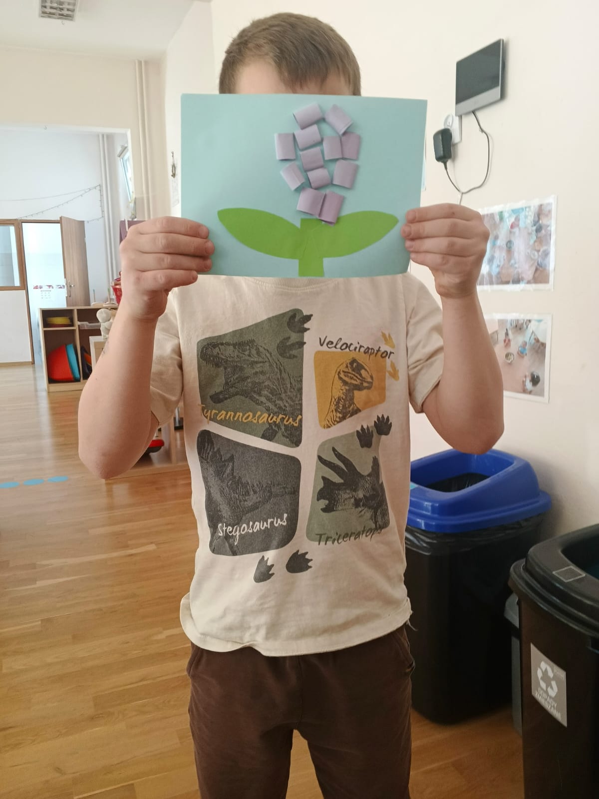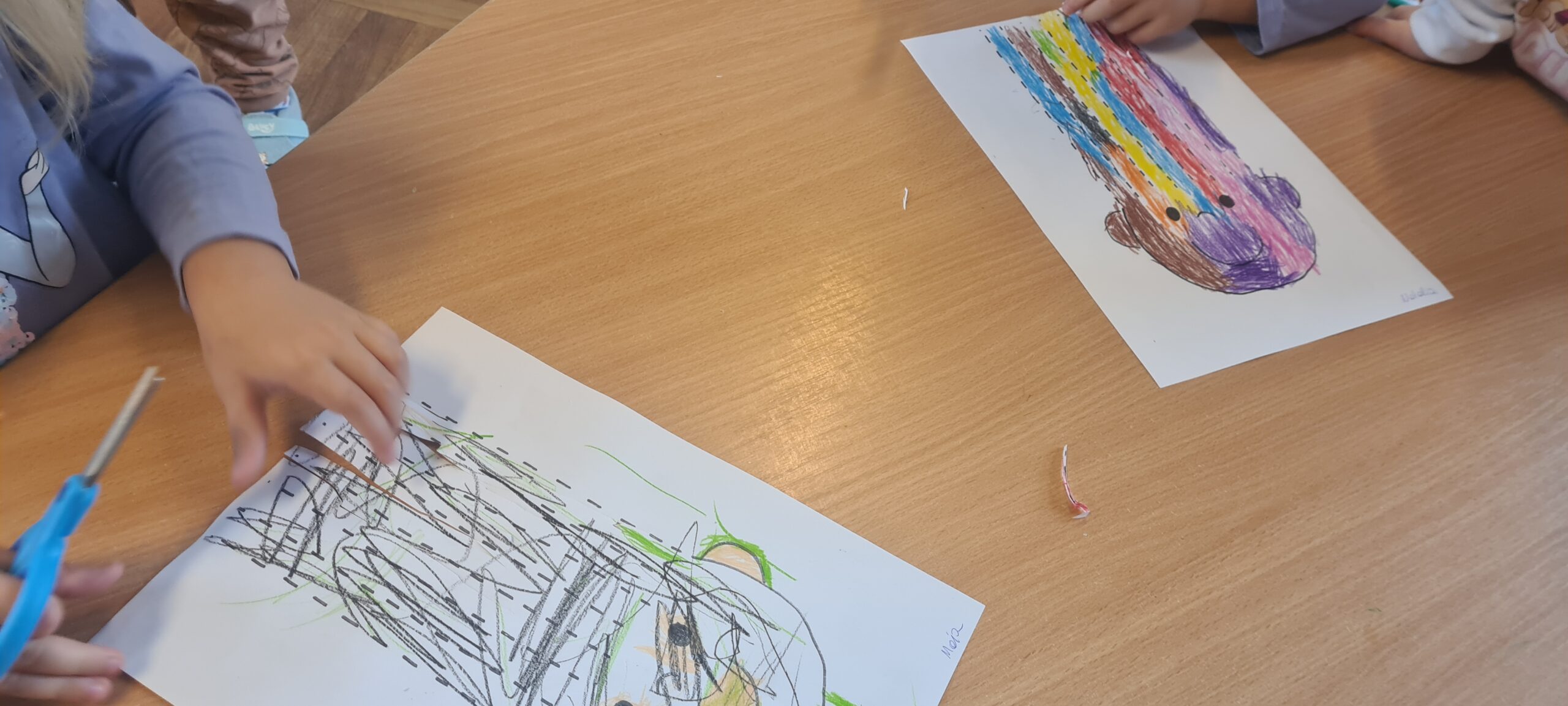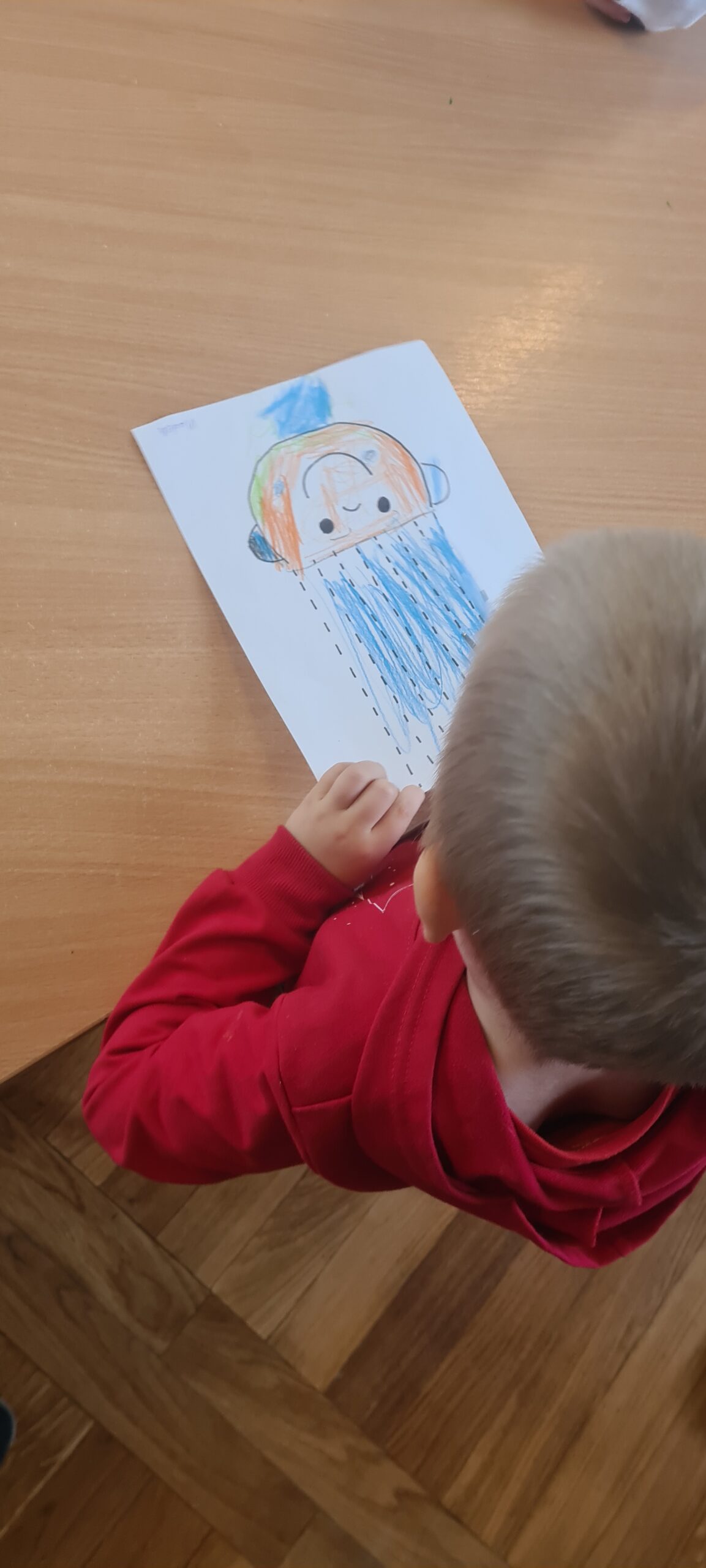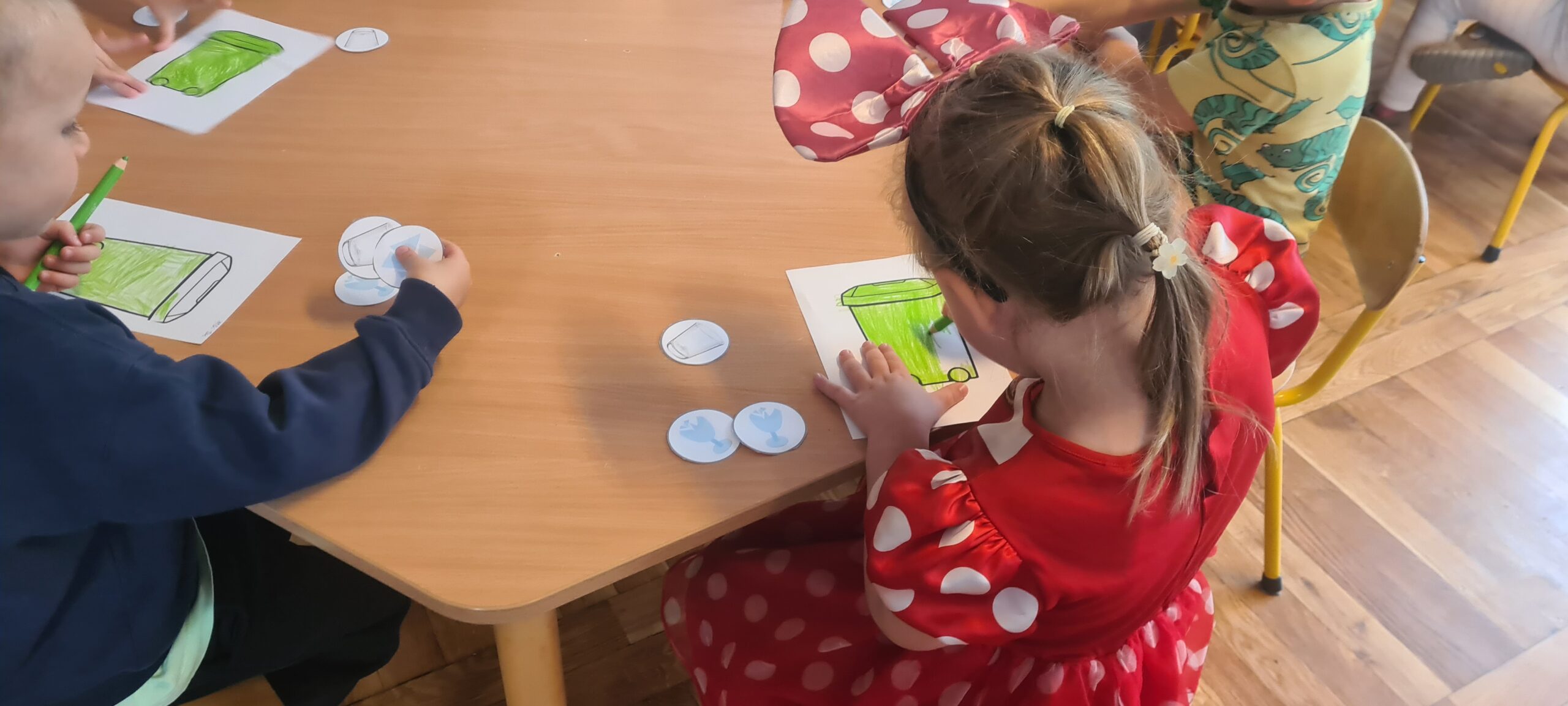 Dziś ubraliśmy rękawice i ruszyliśmy sprzątać okolice przedszkola. Okazało się, że to zadanie wymagało dużej uważności, ponieważ mieszkańcy naszego osiedla dbają o czystość. Po powrocie obejrzeliśmy teatrzyk pacynkowy „Papierek po cukierku” i używając czterech kroków empatycznej komunikacji omówiliśmy go. Przypomnieliśmy sobie też kolory koszy na śmieci i wykonaliśmy pracę plastyczną.