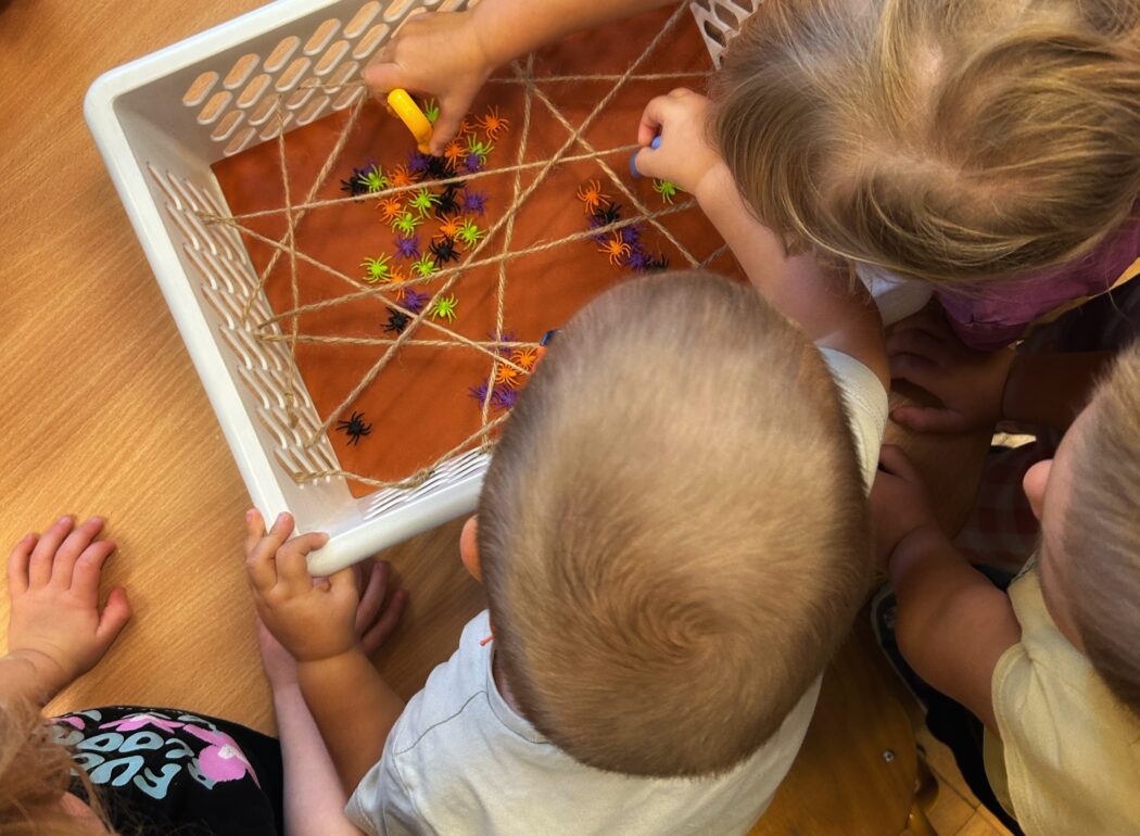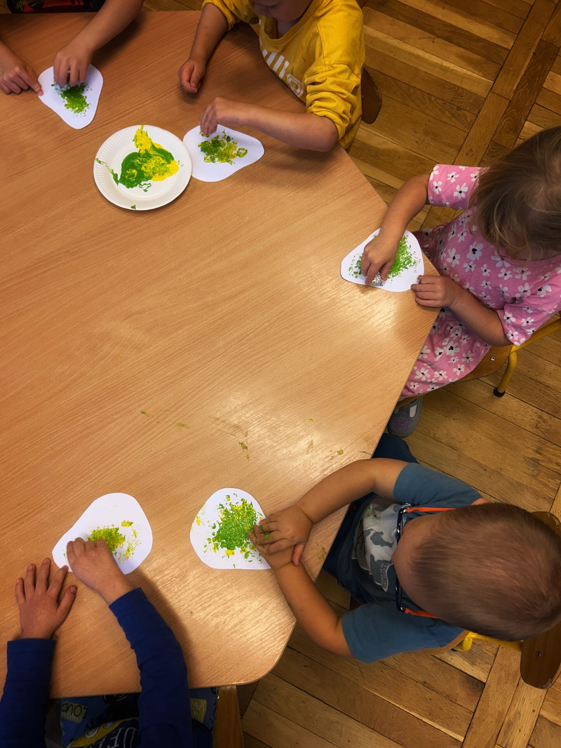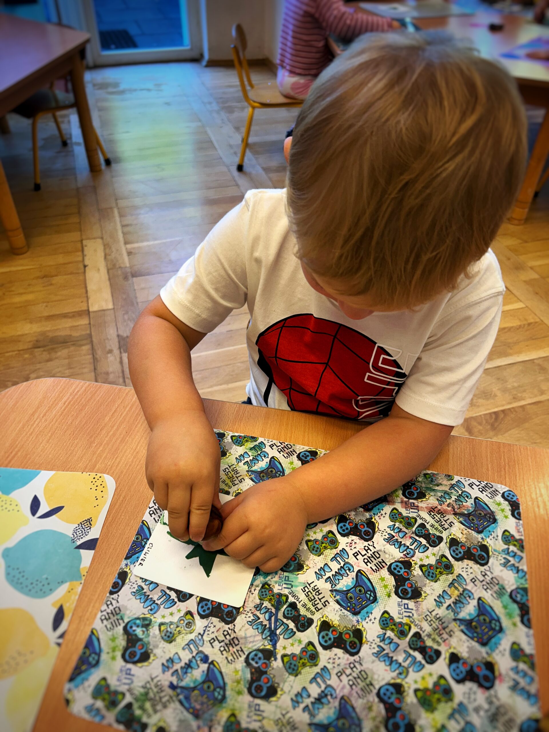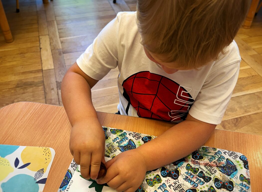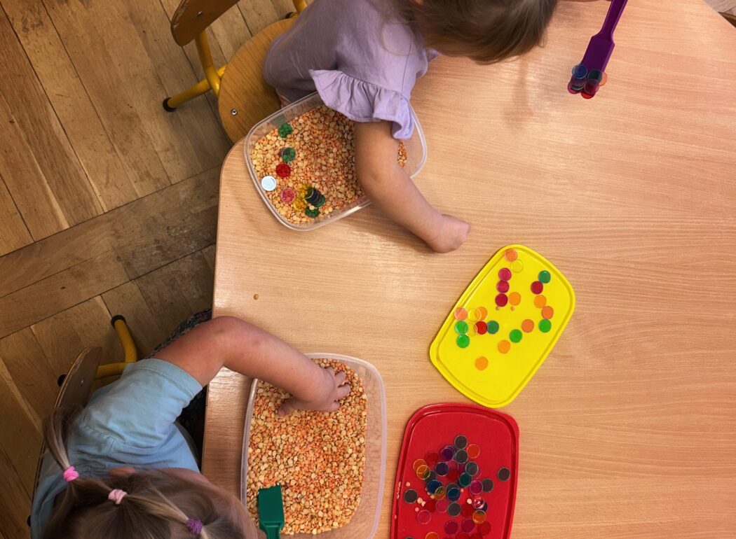 W ostatnim czasie nasze rączki mają sporo pracy. Wyciąganie pajączków za pomocą pęsety, tworzenie jesiennej korony drzew z wykorzystaniem ciastoliny i guzików, wyszukiwanie magnetycznych kółek w grochu i soczewicy, malowanie owoców folią aluminiową, klejenie, tworzenie kompozycji z różnych naklejek itp. Wszystko po to by rozwijać motorykę małą, koordynację ruchowa, sprawność palców i dłoni, ćwiczyć koncentrację, cierpliwość i dokładność, a także samodzielność.