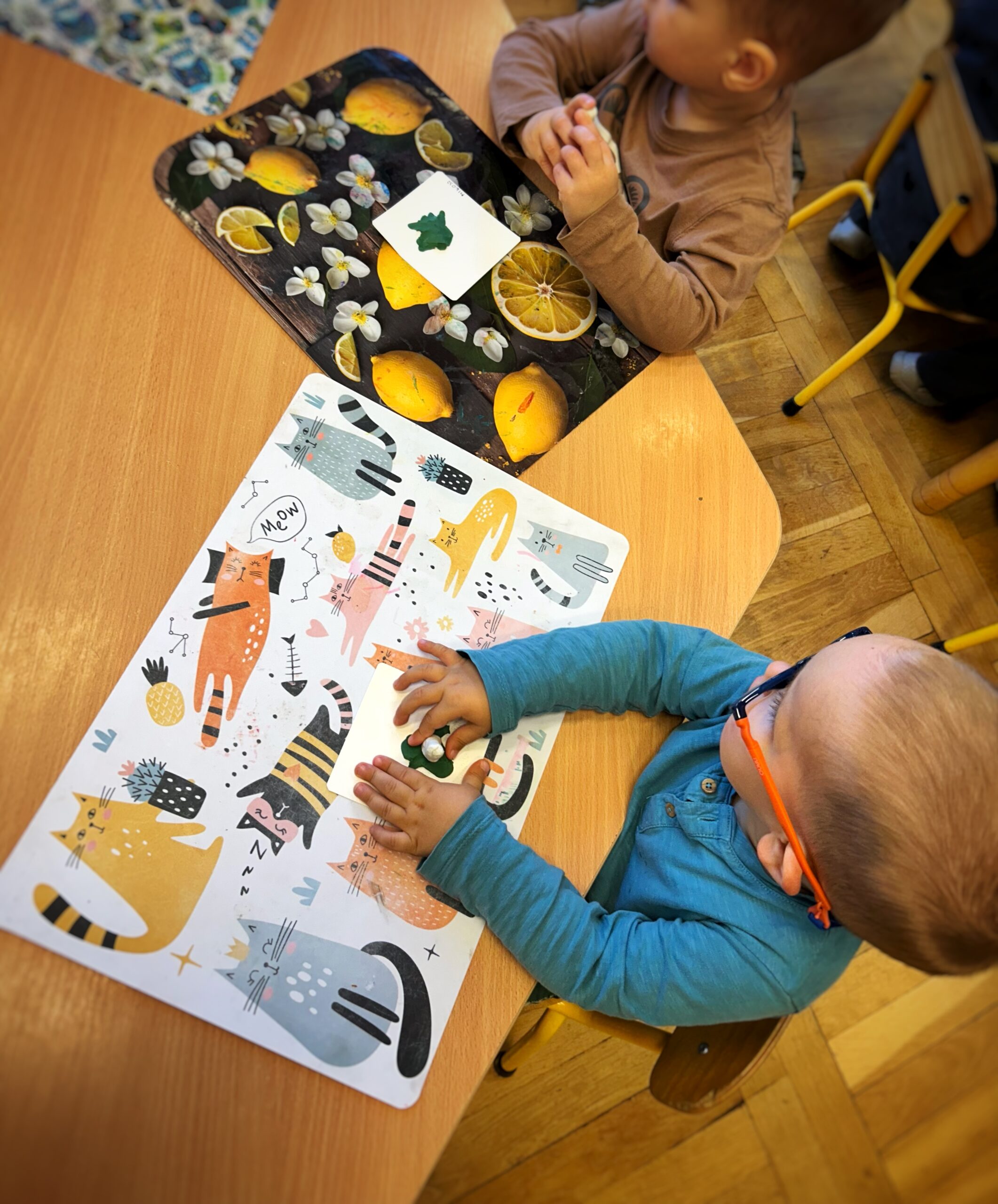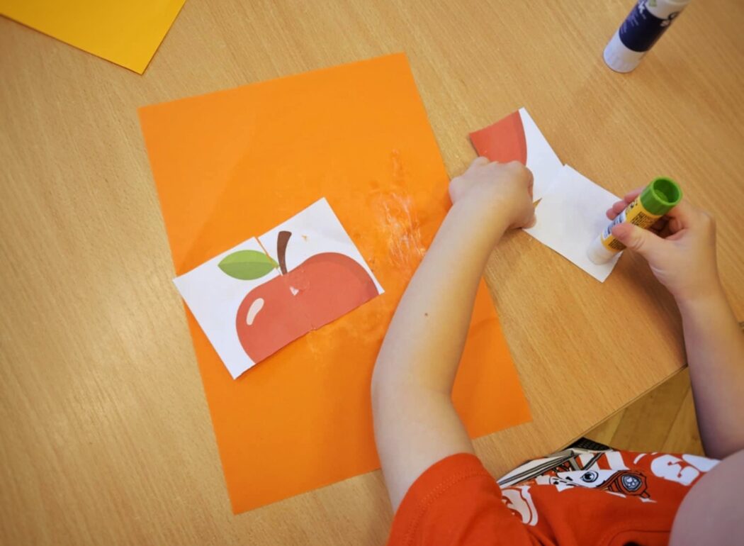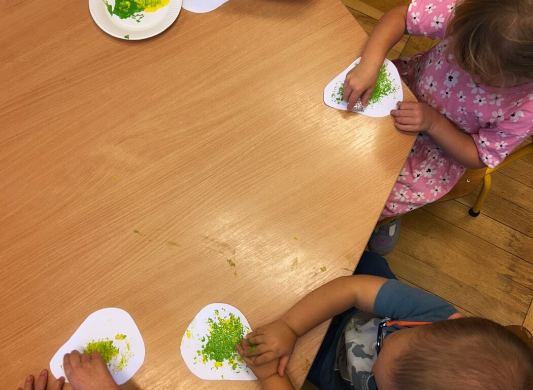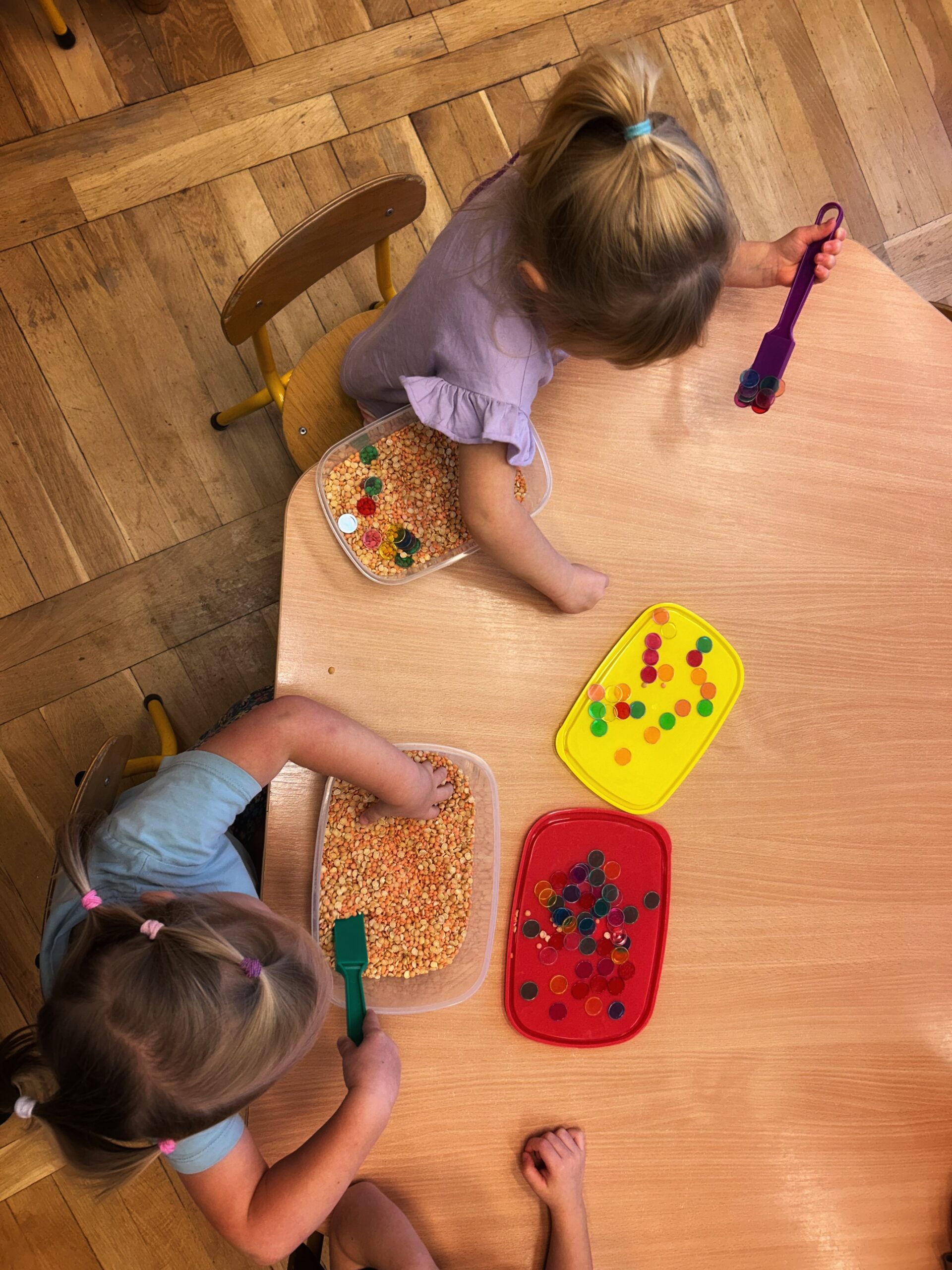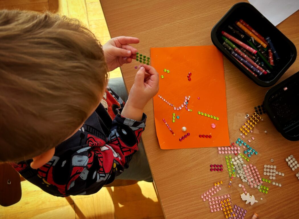 W ostatnim czasie nasze rączki mają sporo pracy. Wyciąganie pajączków za pomocą pęsety, tworzenie jesiennej korony drzew z wykorzystaniem ciastoliny i guzików, wyszukiwanie magnetycznych kółek w grochu i soczewicy, malowanie owoców folią aluminiową, klejenie, tworzenie kompozycji z różnych naklejek itp. Wszystko po to by rozwijać motorykę małą, koordynację ruchowa, sprawność palców i dłoni, ćwiczyć koncentrację, cierpliwość i dokładność, a także samodzielność.