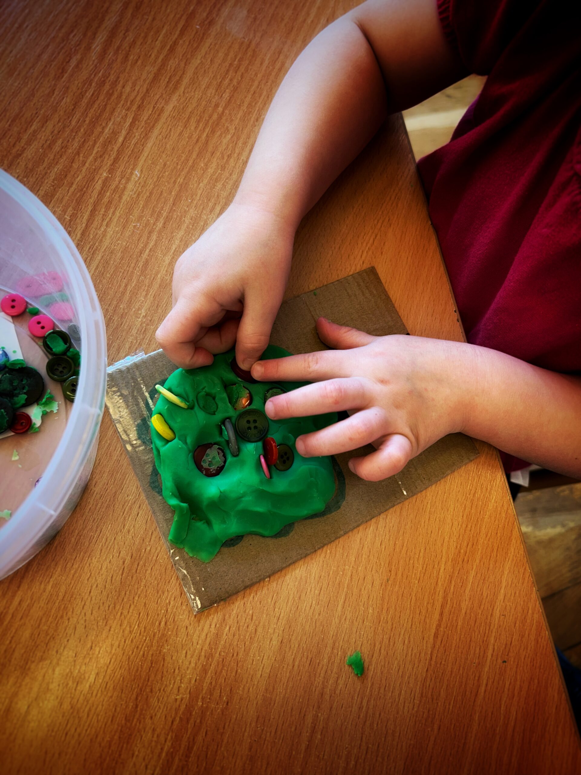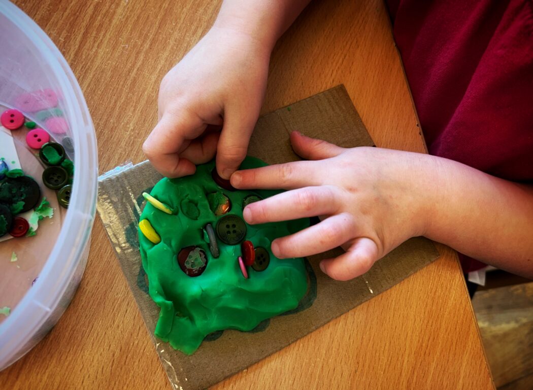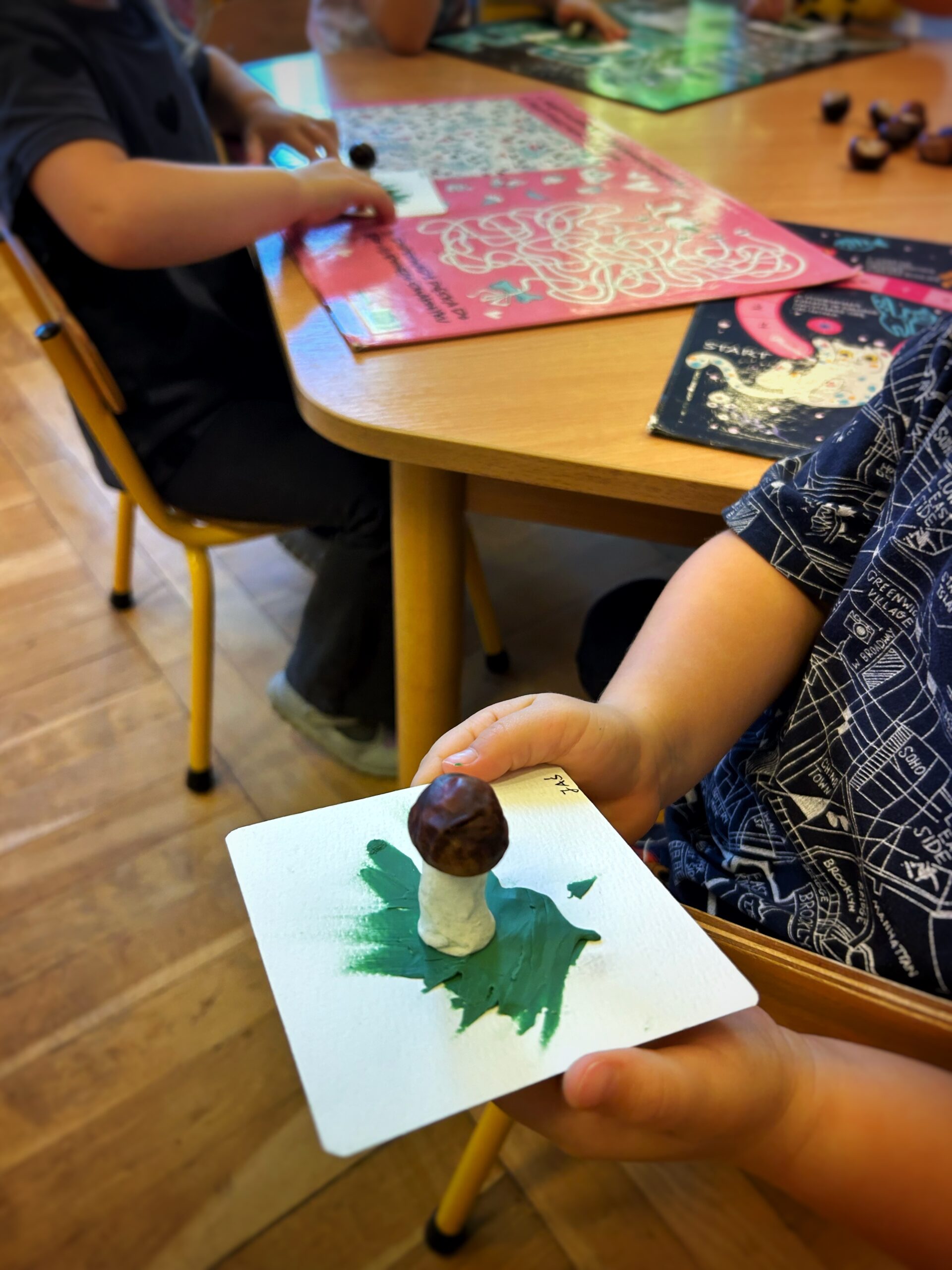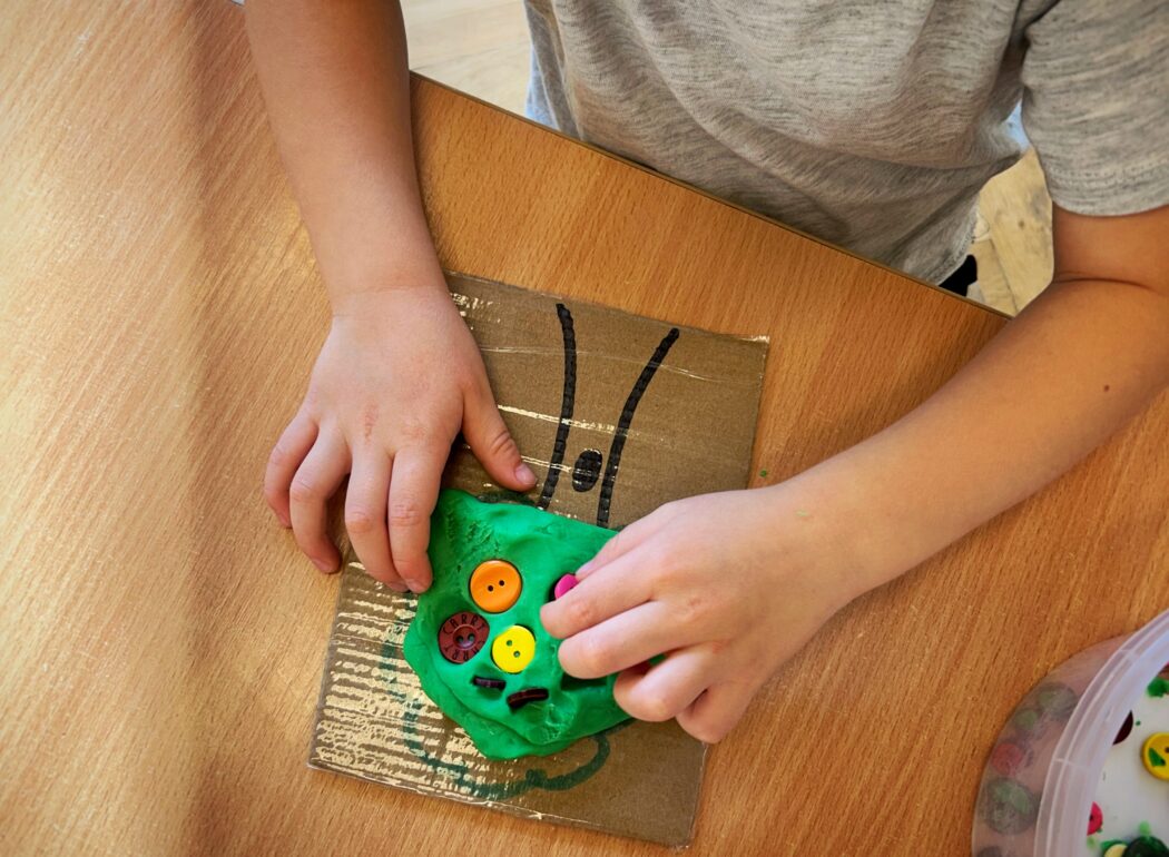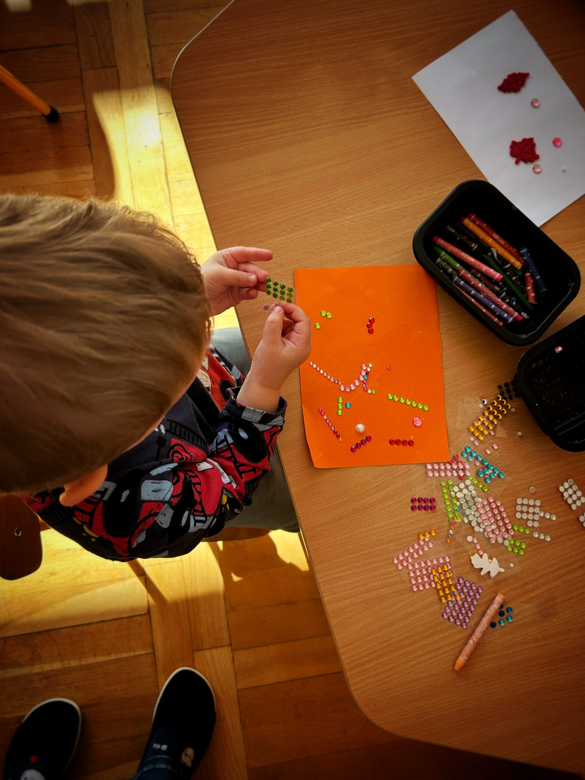 W ostatnim czasie nasze rączki mają sporo pracy. Wyciąganie pajączków za pomocą pęsety, tworzenie jesiennej korony drzew z wykorzystaniem ciastoliny i guzików, wyszukiwanie magnetycznych kółek w grochu i soczewicy, malowanie owoców folią aluminiową, klejenie, tworzenie kompozycji z różnych naklejek itp. Wszystko po to by rozwijać motorykę małą, koordynację ruchowa, sprawność palców i dłoni, ćwiczyć koncentrację, cierpliwość i dokładność, a także samodzielność.
