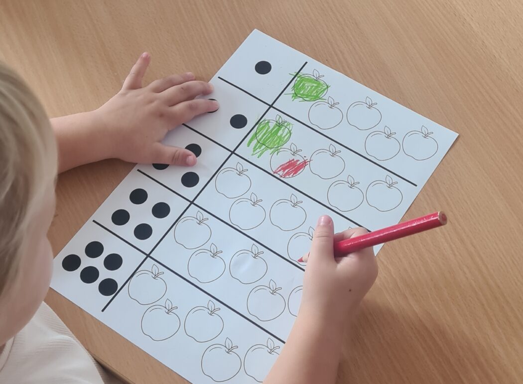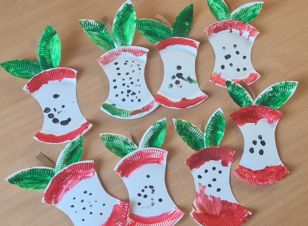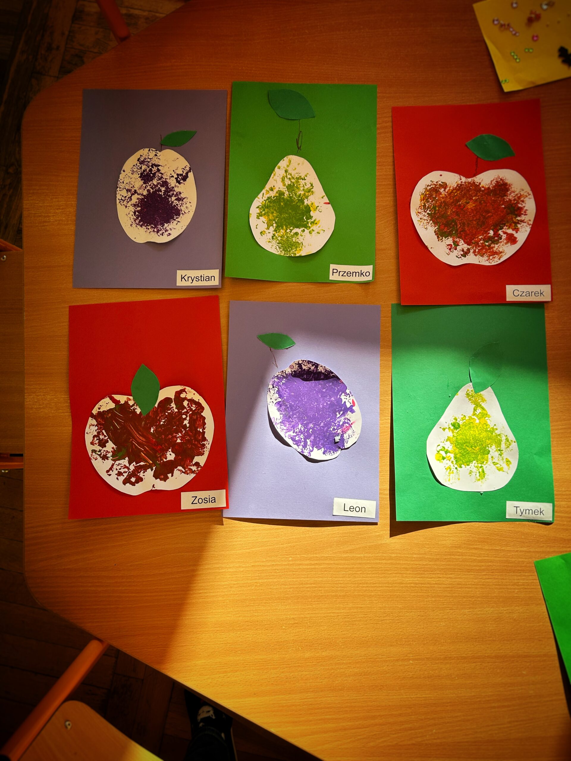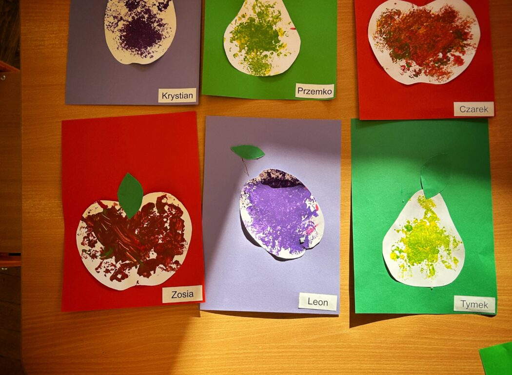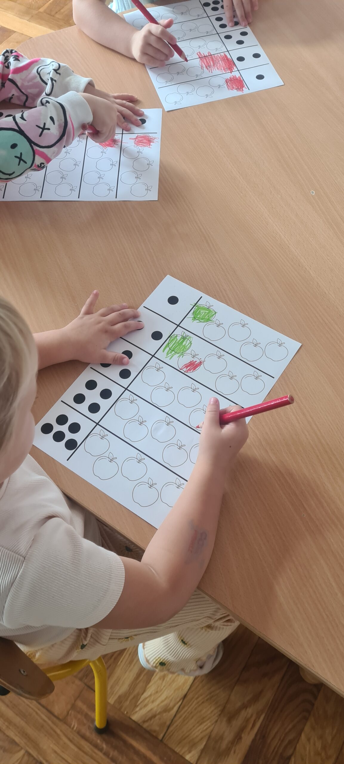 Z okazji Dnia Jabłka poznaliśmy historię gwiazdki, która chcąc być blisko dzieci zamieszkała w jabłku. Następnie rozmawialiśmy o właściwościach jabłka. Zagraliśmy też w grę ” Ktoś mi zabrał jabłko”. Na dywanie ustaliliśmy, co to znaczy ” tyle samo” , przeliczaliśmy i porównywaliśmy liczebność zbiorów. Zdobyte umiejętności utrwaliliśmy wykonując kartę pracy- kolorowaliśmy tyle jabłek po prawej stronie, ile kropek było po lewej. A popołudniu wesoło malowaliśmy i powstały ogryzki.