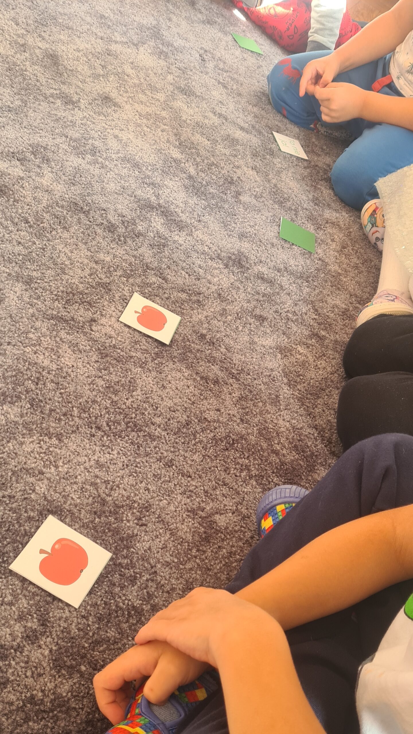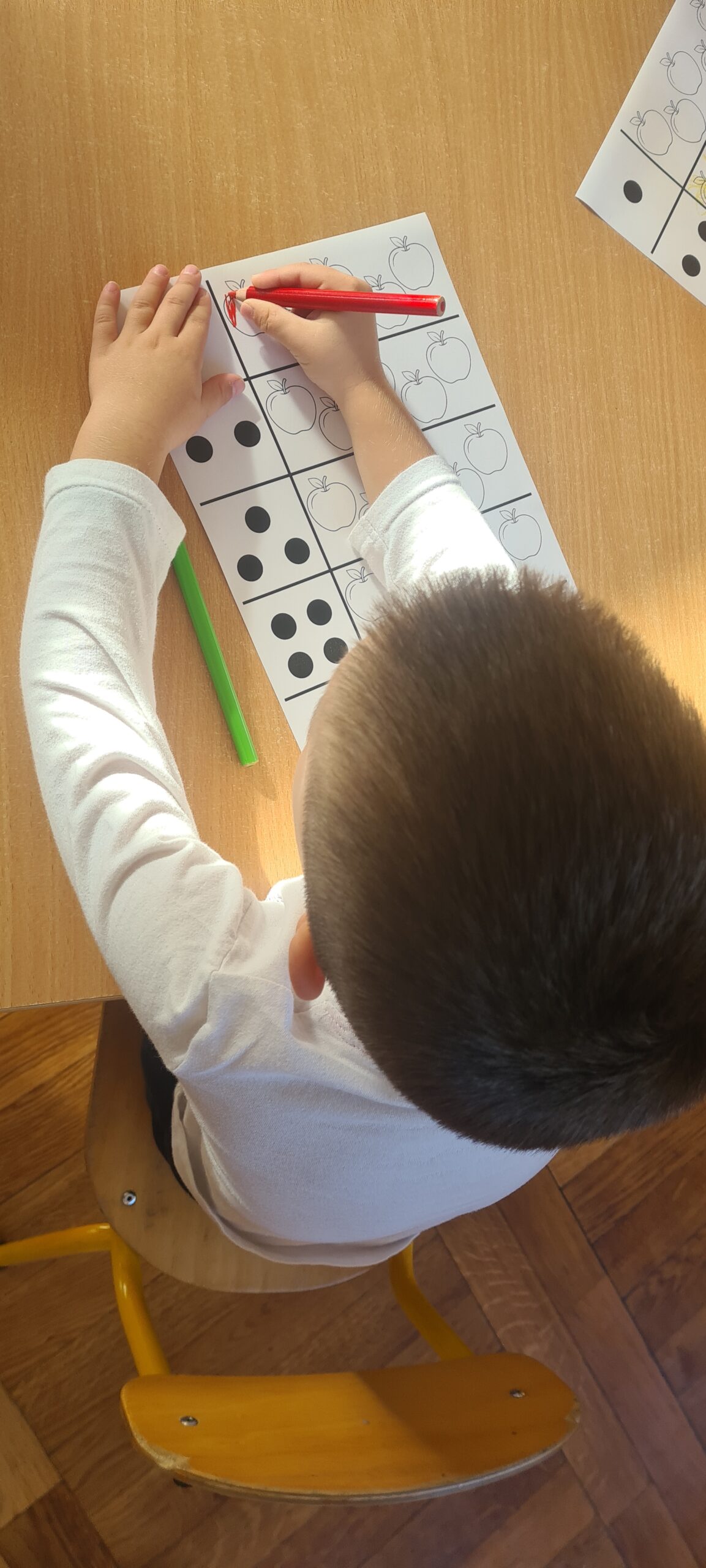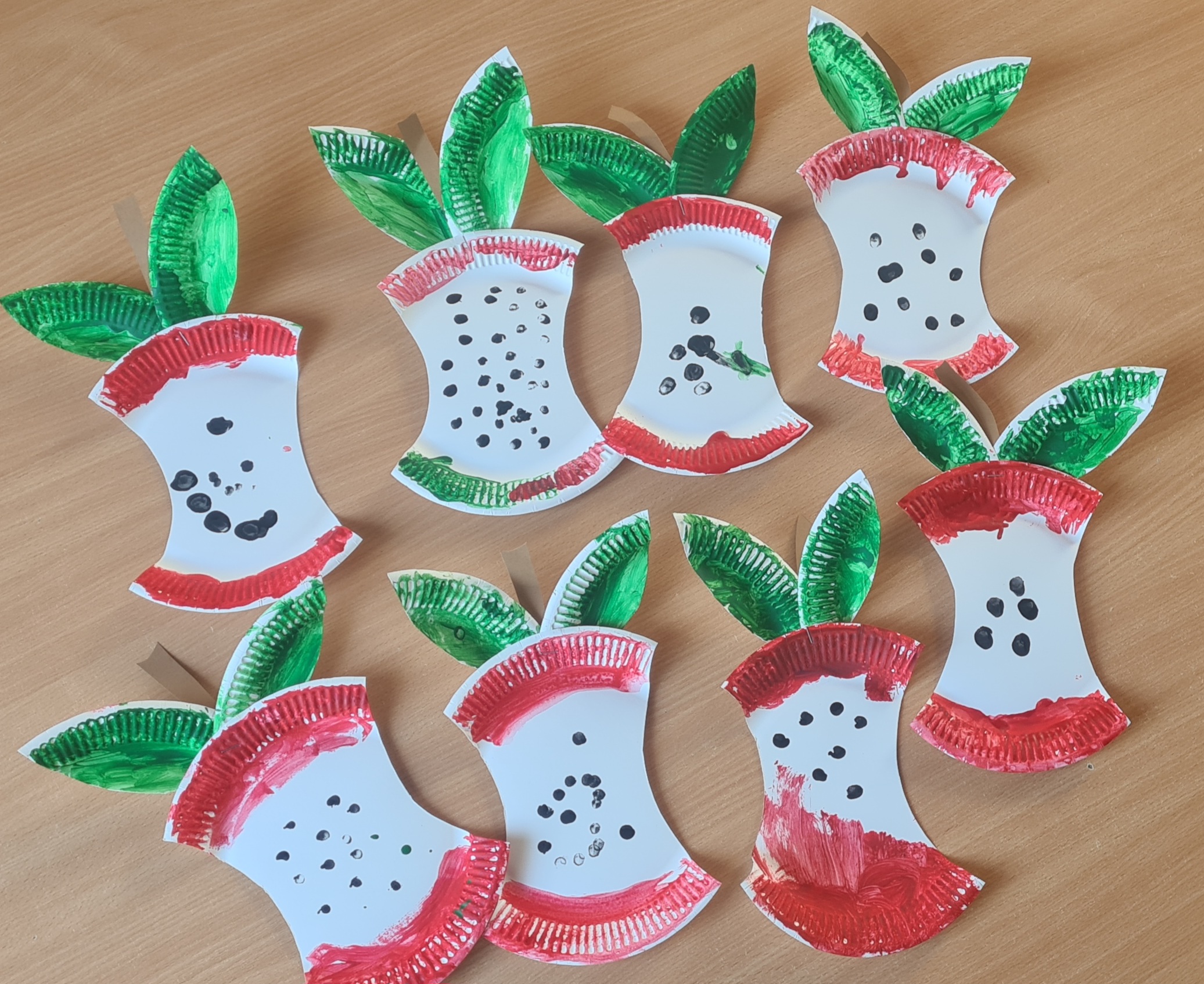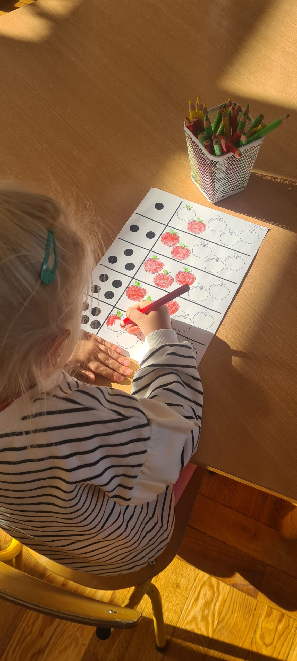 Z okazji Dnia Jabłka poznaliśmy historię gwiazdki, która chcąc być blisko dzieci zamieszkała w jabłku. Następnie rozmawialiśmy o właściwościach jabłka. Zagraliśmy też w grę ” Ktoś mi zabrał jabłko”. Na dywanie ustaliliśmy, co to znaczy ” tyle samo” , przeliczaliśmy i porównywaliśmy liczebność zbiorów. Zdobyte umiejętności utrwaliliśmy wykonując kartę pracy- kolorowaliśmy tyle jabłek po prawej stronie, ile kropek było po lewej. A popołudniu wesoło malowaliśmy i powstały ogryzki.