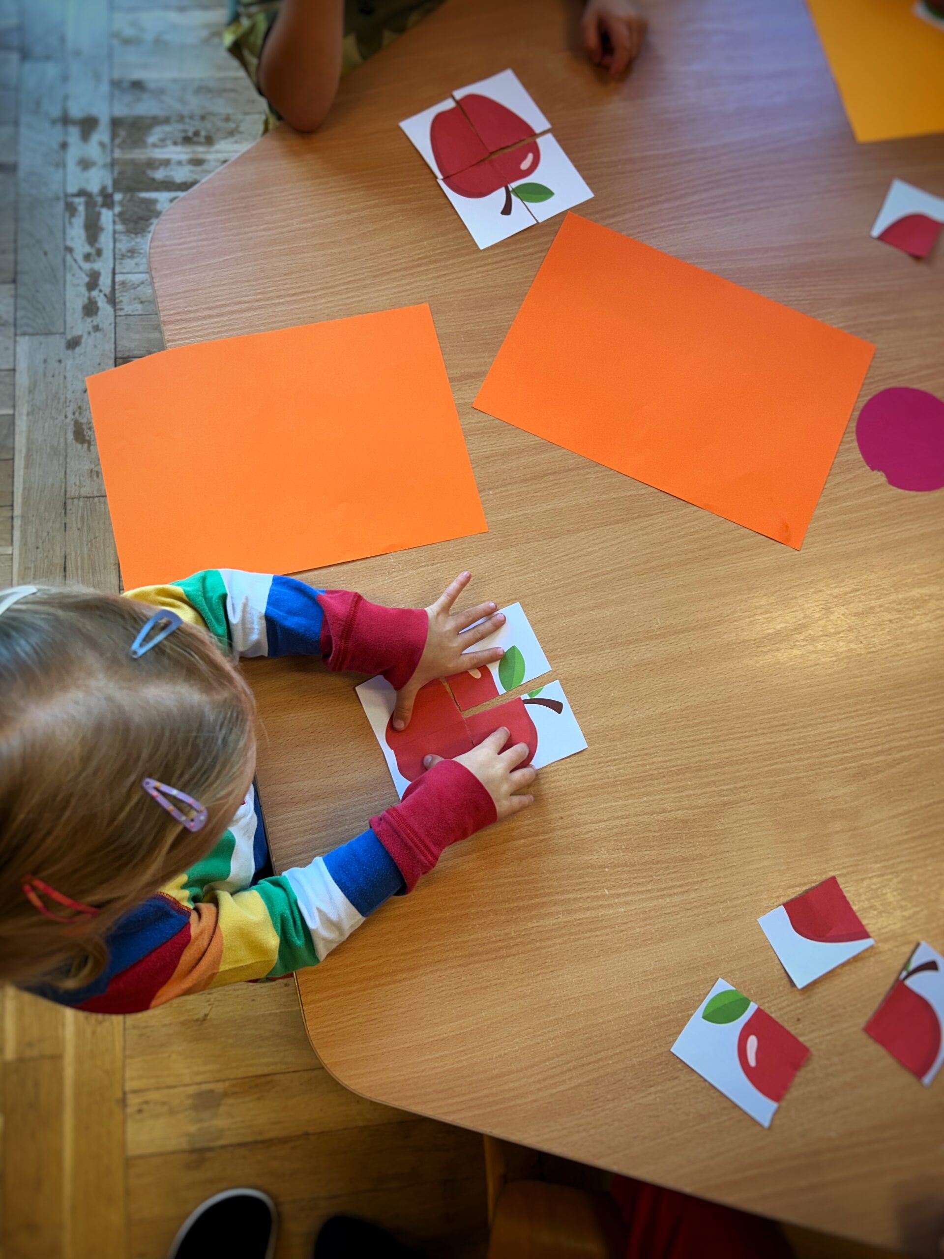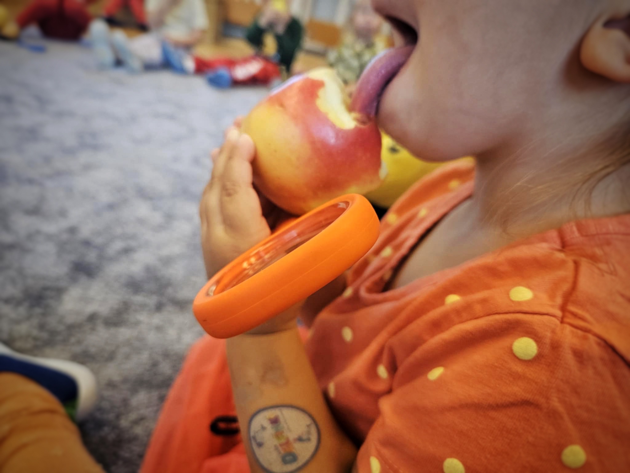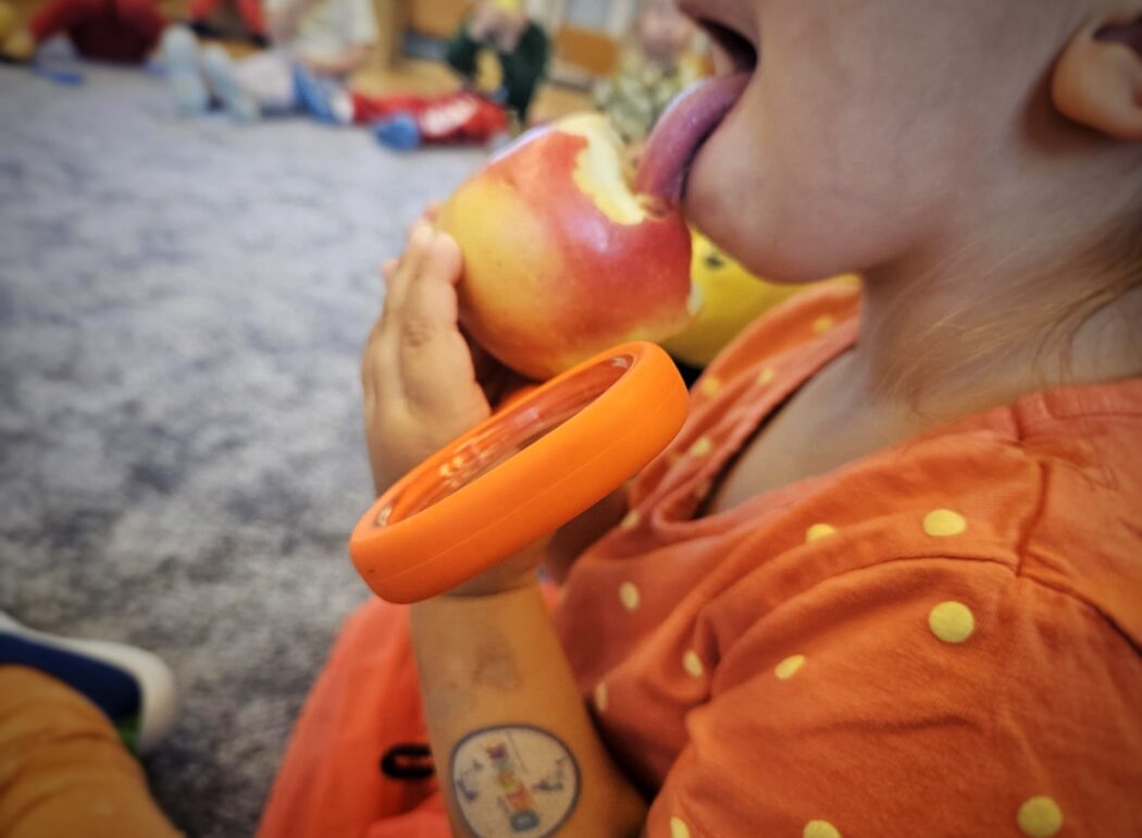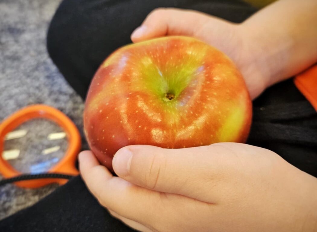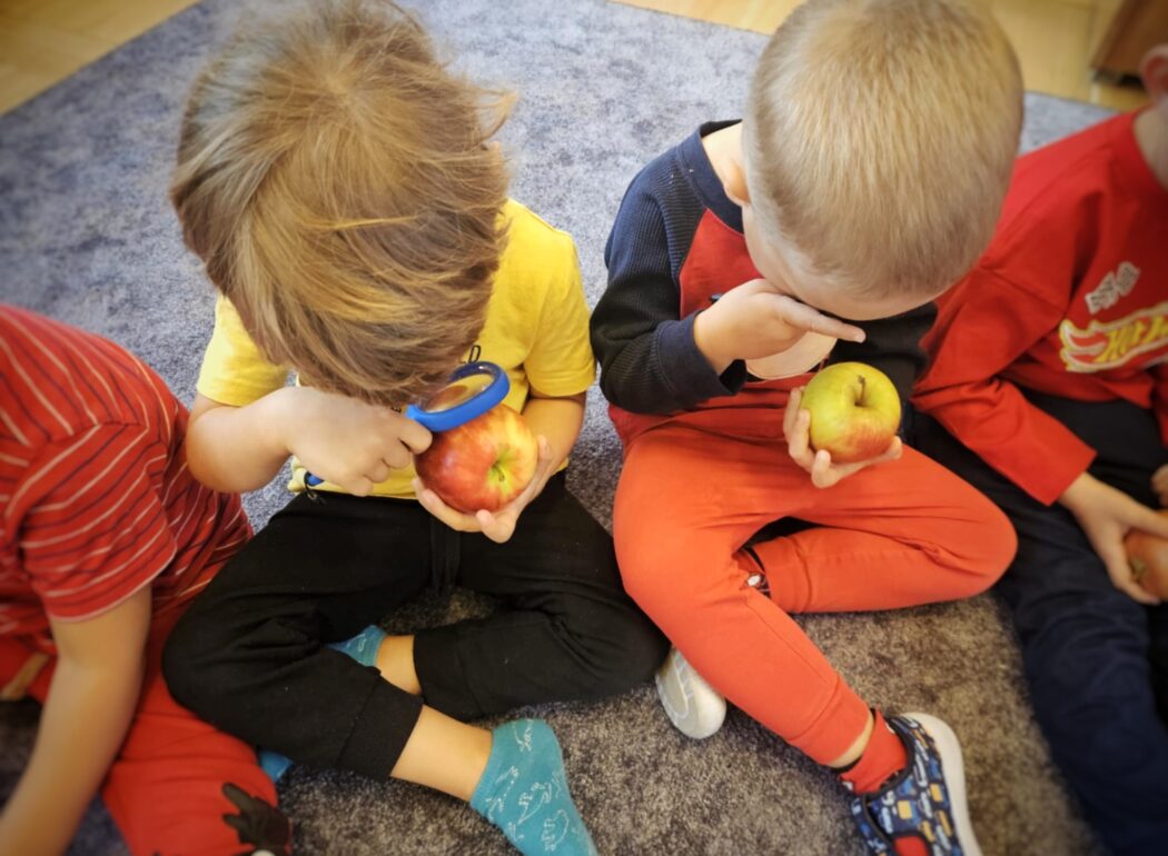Z okazji Dnia Jabłka sala Stokrotek zamieniła się w niewielki sad. Ubraliśmy się w jabłuszkowe kolory i świętowaliśmy. Zaczęliśmy od wspólnego tańca przy piosence „Małe, czerwone jabłuszko”. Następnie uzbrojeni w lupy zamieniliśmy się w małych naukowców i badaliśmy jabłka naszymi zmysłami. Staraliśmy się znaleźć odpowiedź na pytanie czym jest jabłko, i świetnie sobie z tym poradziliśmy („je się je”, „gryzie”, „owoc”). Dowiedzieliśmy się jak powstaje jabłko i jak nazywa się drzewo na którym rośnie ten owoc. Na koniec poćwiczyliśmy nasze umiejętności analityczne i motoryczne składając pocięty na kawałki obrazek i przyklejając go na kartkę. Nawet w naszym menu tego dnia królowało jabłko – był jabłkowy dżem na śniadanie, sok jabłkowy na obiad i prażone jabłko na deser.
