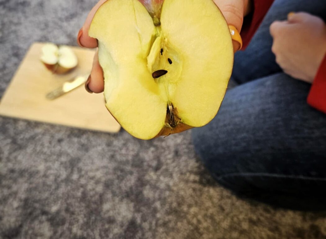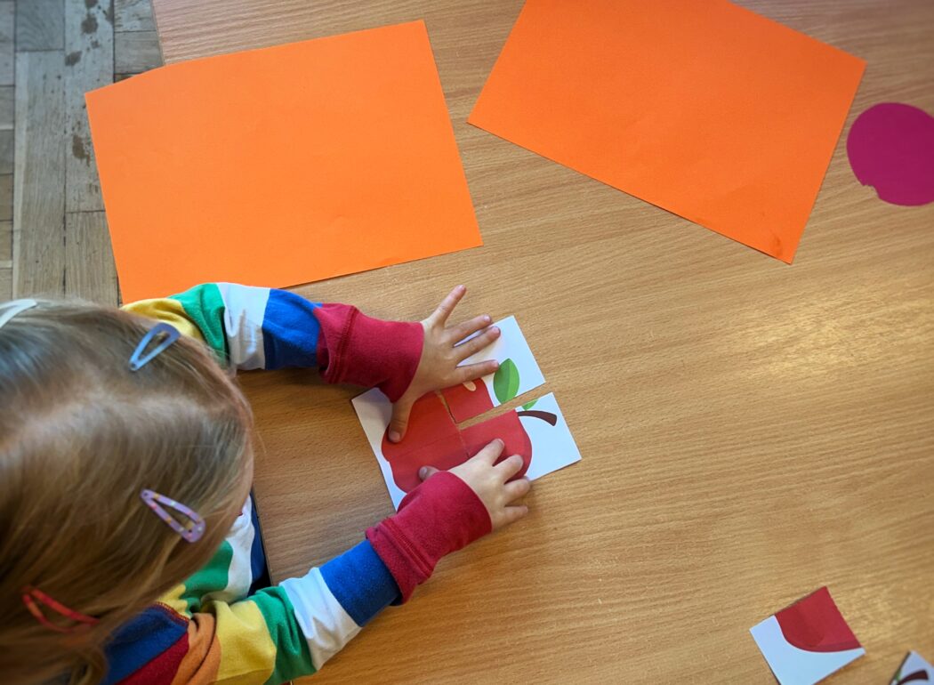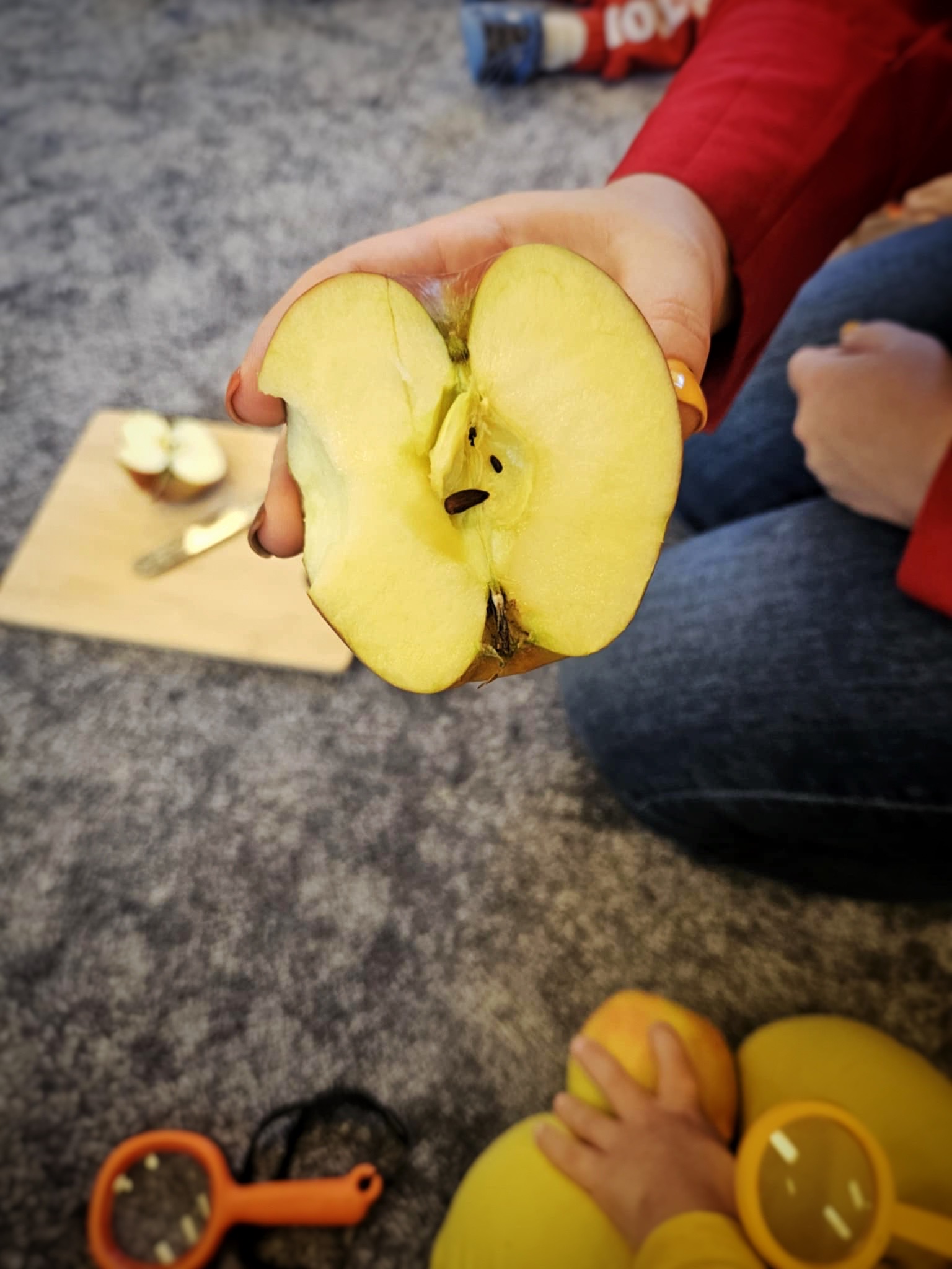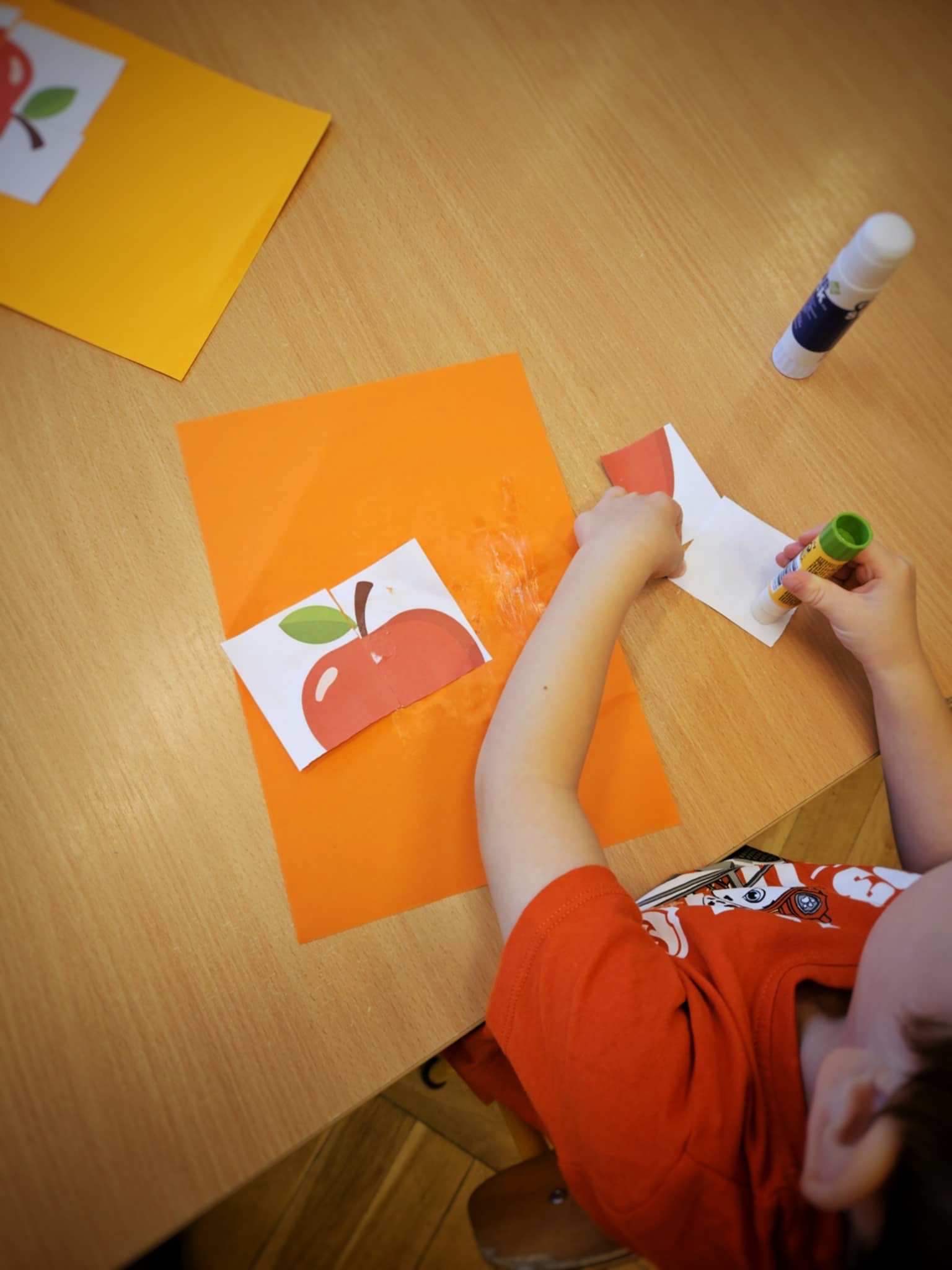 Z okazji Dnia Jabłka sala Stokrotek zamieniła się w niewielki sad. Ubraliśmy się w jabłuszkowe kolory i świętowaliśmy. Zaczęliśmy od wspólnego tańca przy piosence „Małe, czerwone jabłuszko”. Następnie uzbrojeni w lupy zamieniliśmy się w małych naukowców i badaliśmy jabłka naszymi zmysłami. Staraliśmy się znaleźć odpowiedź na pytanie czym jest jabłko, i świetnie sobie z tym poradziliśmy („je się je”, „gryzie”, „owoc”). Dowiedzieliśmy się jak powstaje jabłko i jak nazywa się drzewo na którym rośnie ten owoc. Na koniec poćwiczyliśmy nasze umiejętności analityczne i motoryczne składając pocięty na kawałki obrazek i przyklejając go na kartkę. Nawet w naszym menu tego dnia królowało jabłko – był jabłkowy dżem na śniadanie, sok jabłkowy na obiad i prażone jabłko na deser.