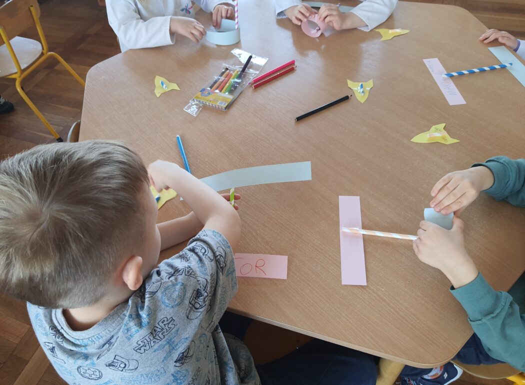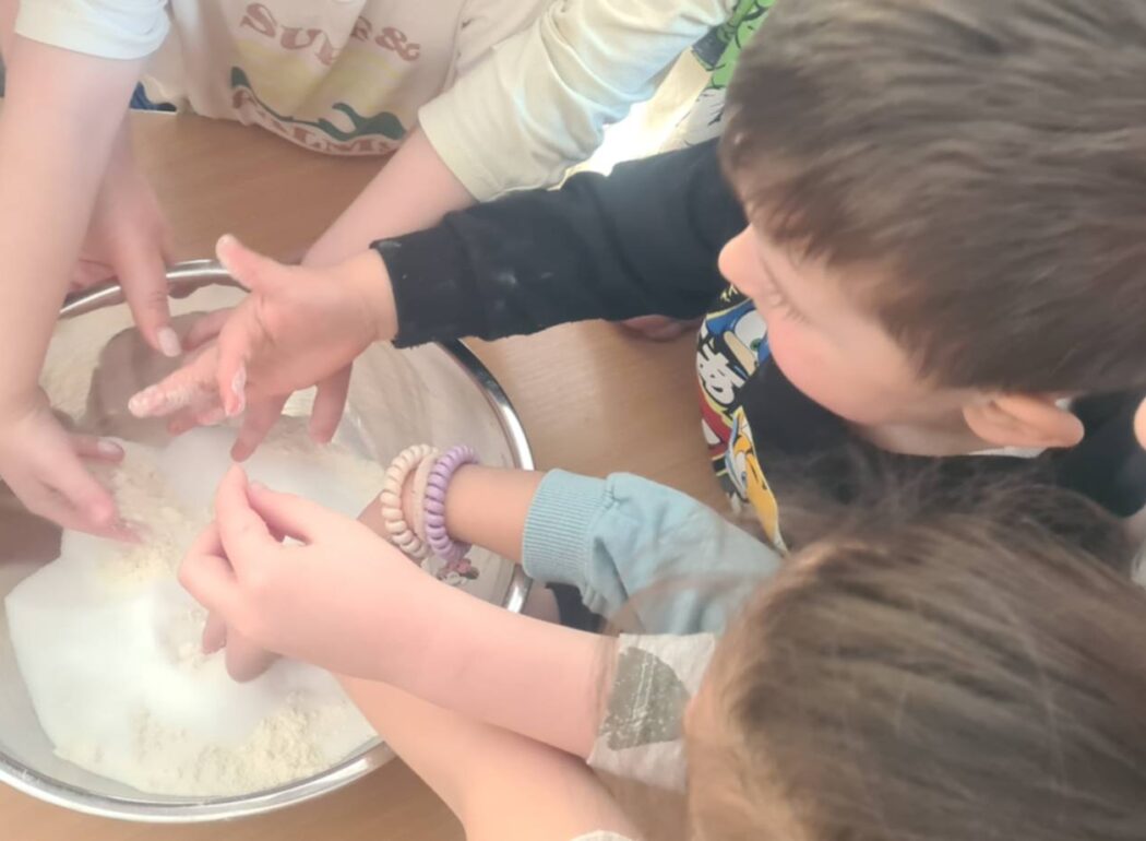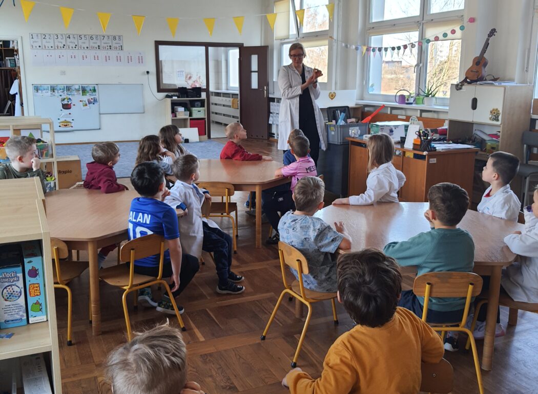 W trakcie zajęć wzięliśmy udział w doświadczeniu chemicznym polegającym na tworzeniu kryształków z siarczanu magnezu. Celem było rozbudzanie ciekawości poznawczej, obserwowanie zmian zachodzących w doświadczeniu oraz wprowadzenie pojęcia rozpuszczania substancji w wodzie. Doświadczenie sprawiło nam wiele radości, rozwijało umiejętność obserwacji, uczyło cierpliwości oraz zachęcało do zadawania pytań i formułowania prostych wniosków w trakcie trwania doświadczenia.
