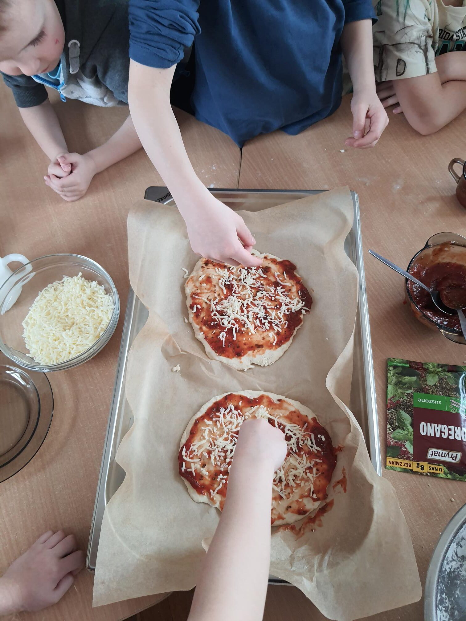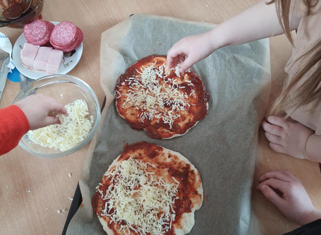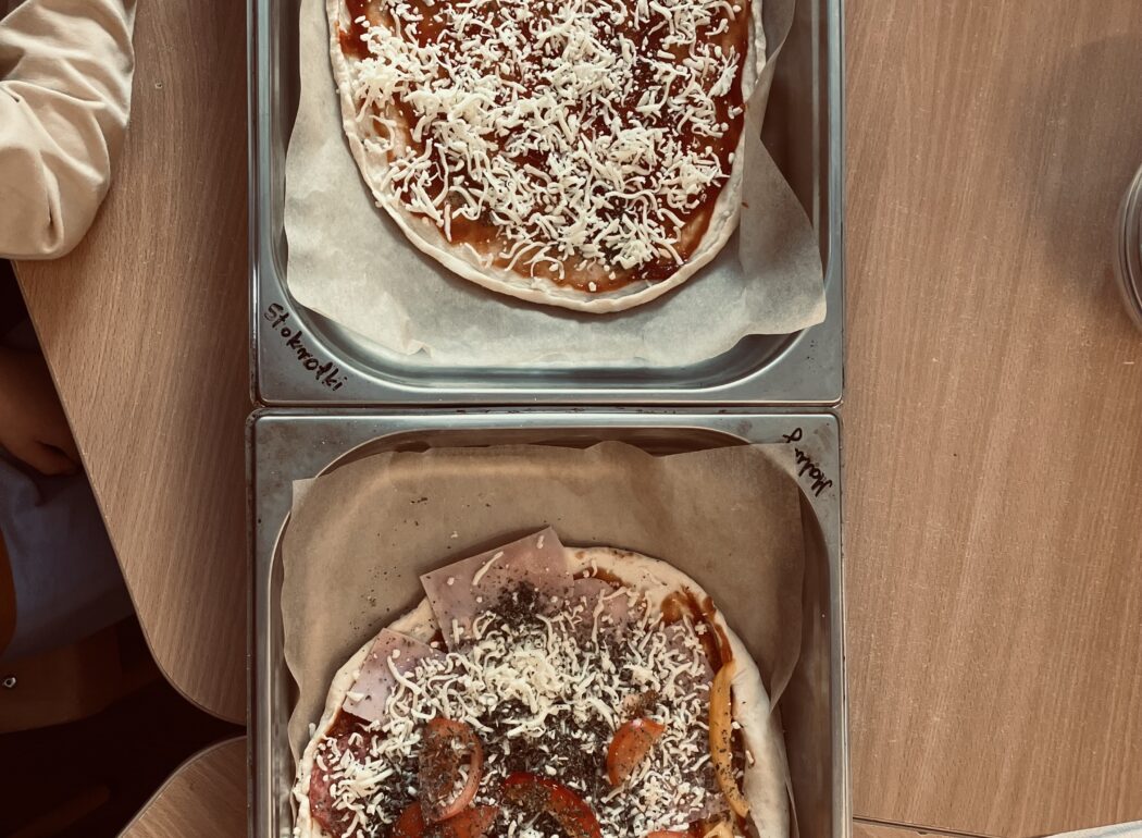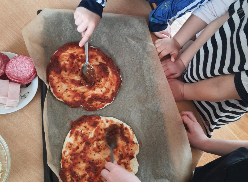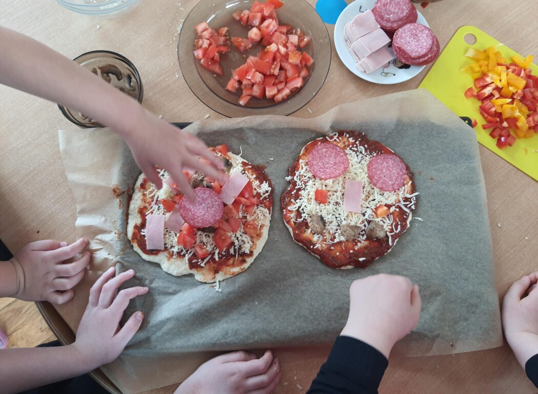 Zajęcia kulinarne u nas, to kreatywne warsztaty, podczas których samodzielnie wyrobiliśmy ciasto, smarowaliśmy je sosem i komponowaliśmy pizze z ulubionych składników (ser, szynka, pieczarki, pomidor, papryka, salami). Zajęcia nauczyły nas współpracy i zakończyły się ucztą. Kuchcikowo, to idealne połączenie zabawy sensorycznej z edukacją żywieniową. Po pizzy nie został nawet ślad, zniknęła błyskawicznie.