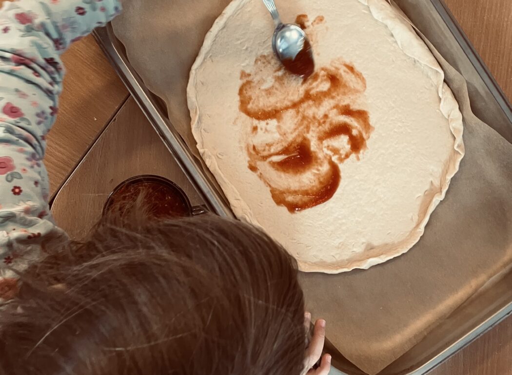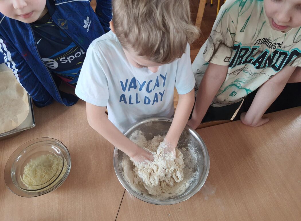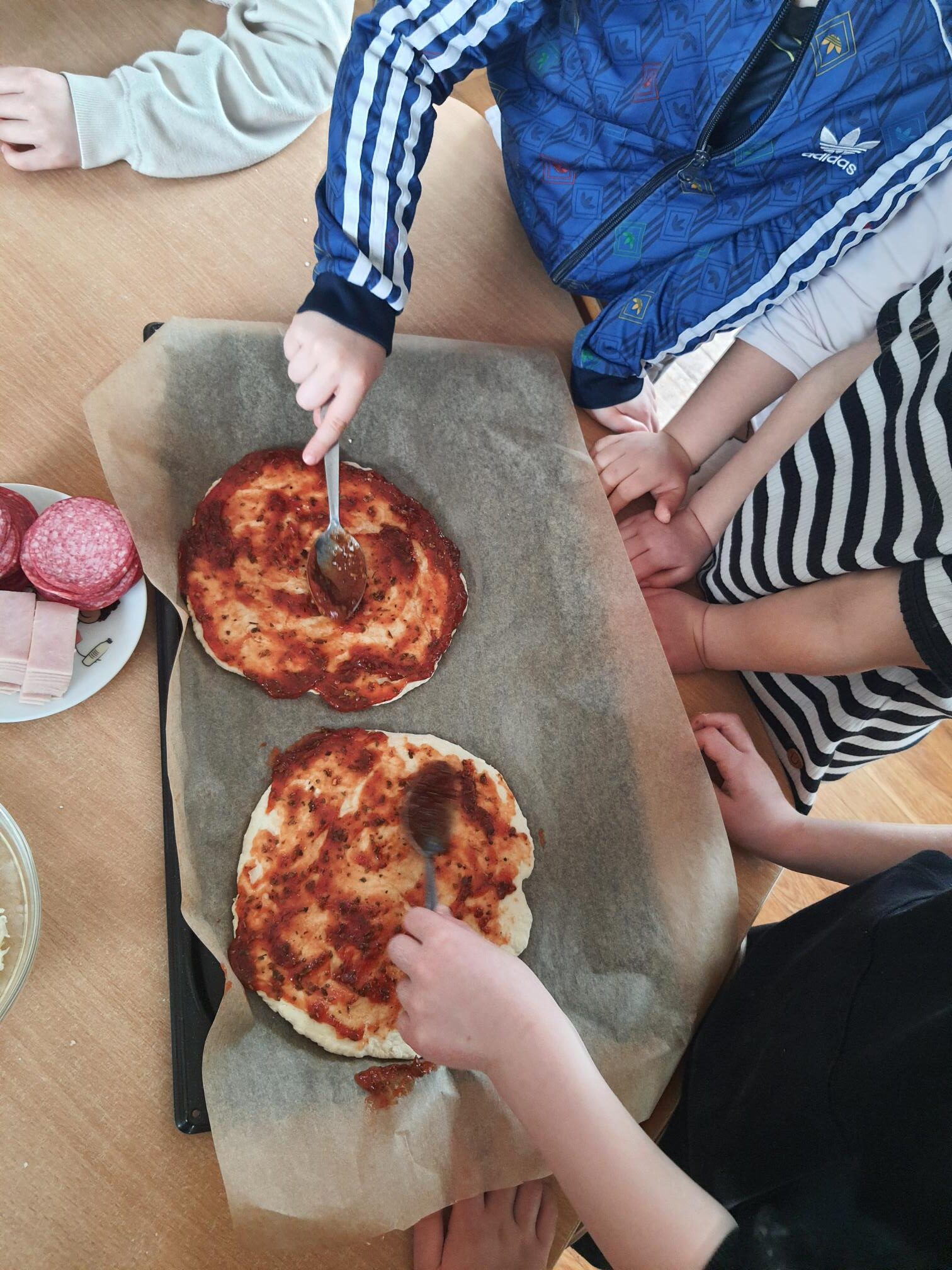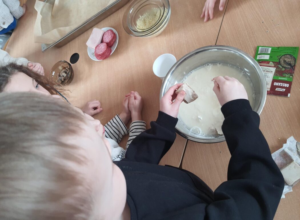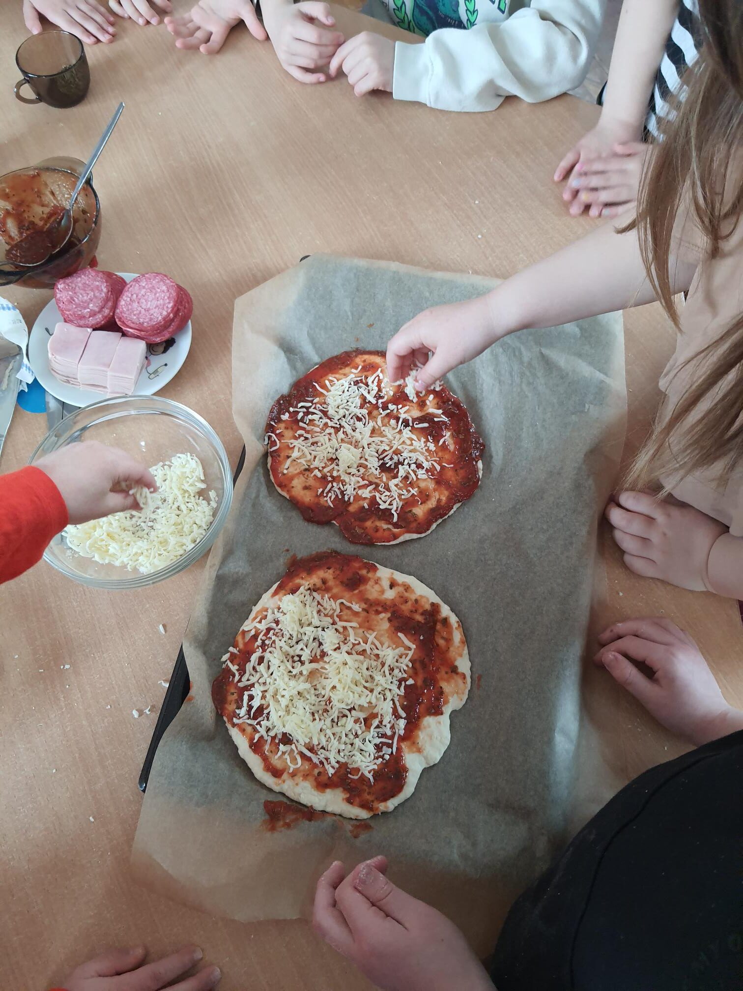 Zajęcia kulinarne u nas, to kreatywne warsztaty, podczas których samodzielnie wyrobiliśmy ciasto, smarowaliśmy je sosem i komponowaliśmy pizze z ulubionych składników (ser, szynka, pieczarki, pomidor, papryka, salami). Zajęcia nauczyły nas współpracy i zakończyły się ucztą. Kuchcikowo, to idealne połączenie zabawy sensorycznej z edukacją żywieniową. Po pizzy nie został nawet ślad, zniknęła błyskawicznie.
