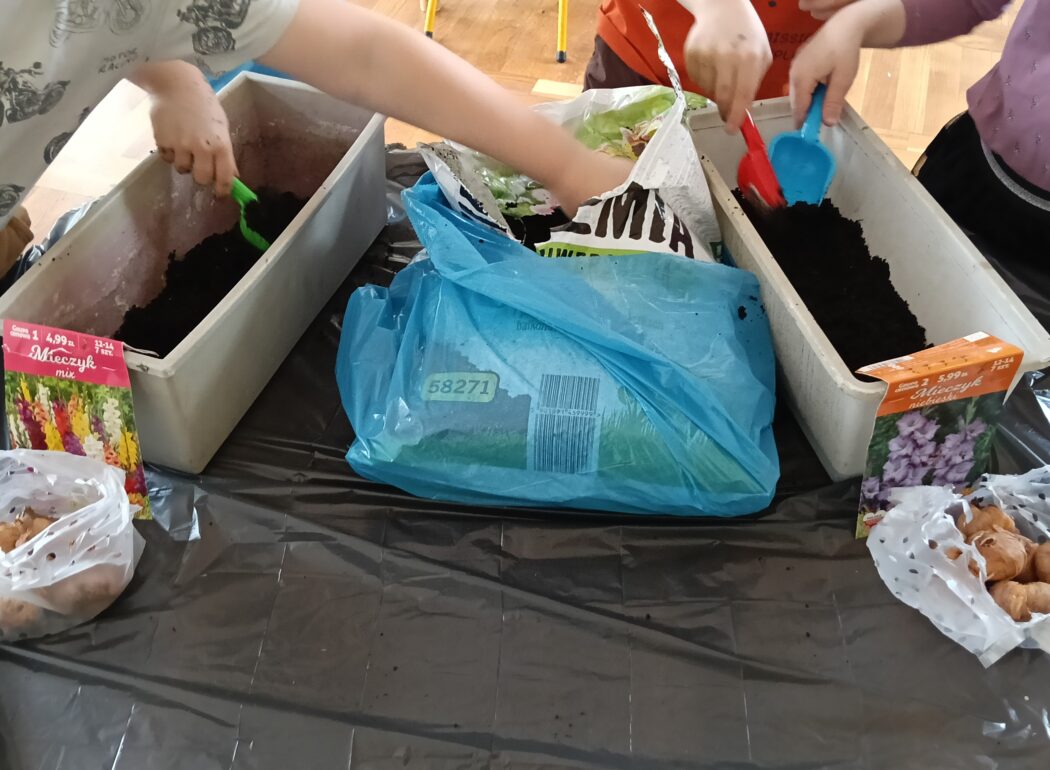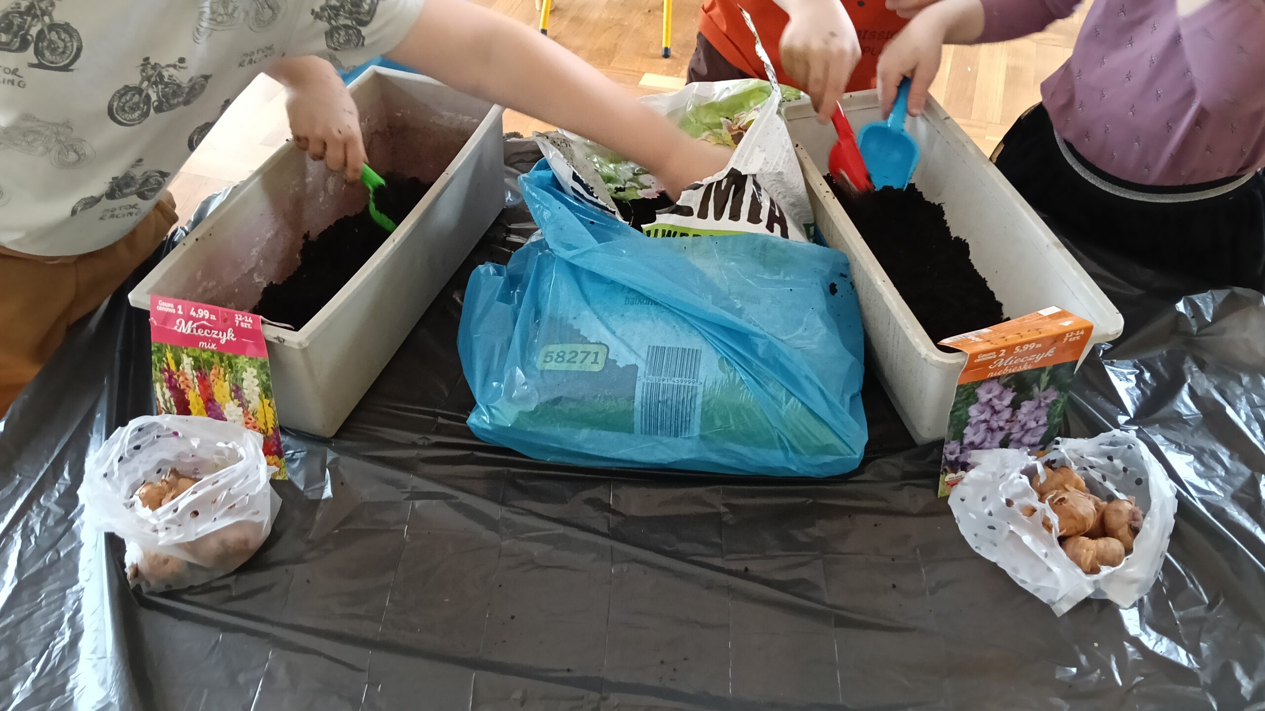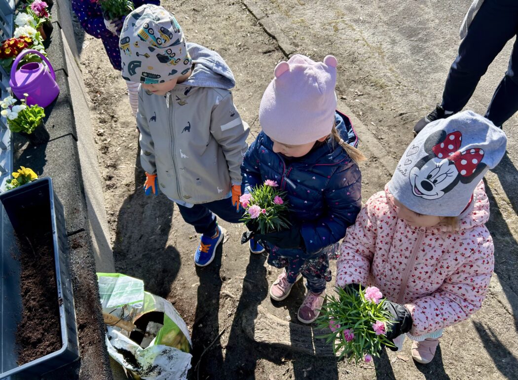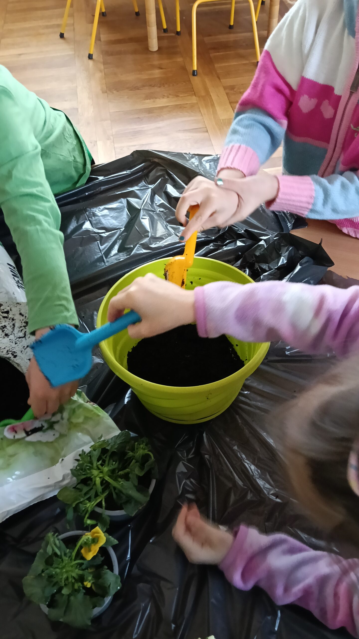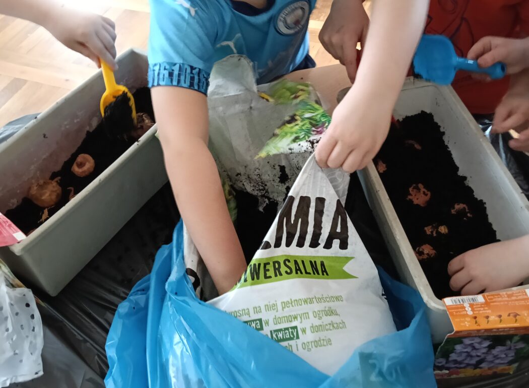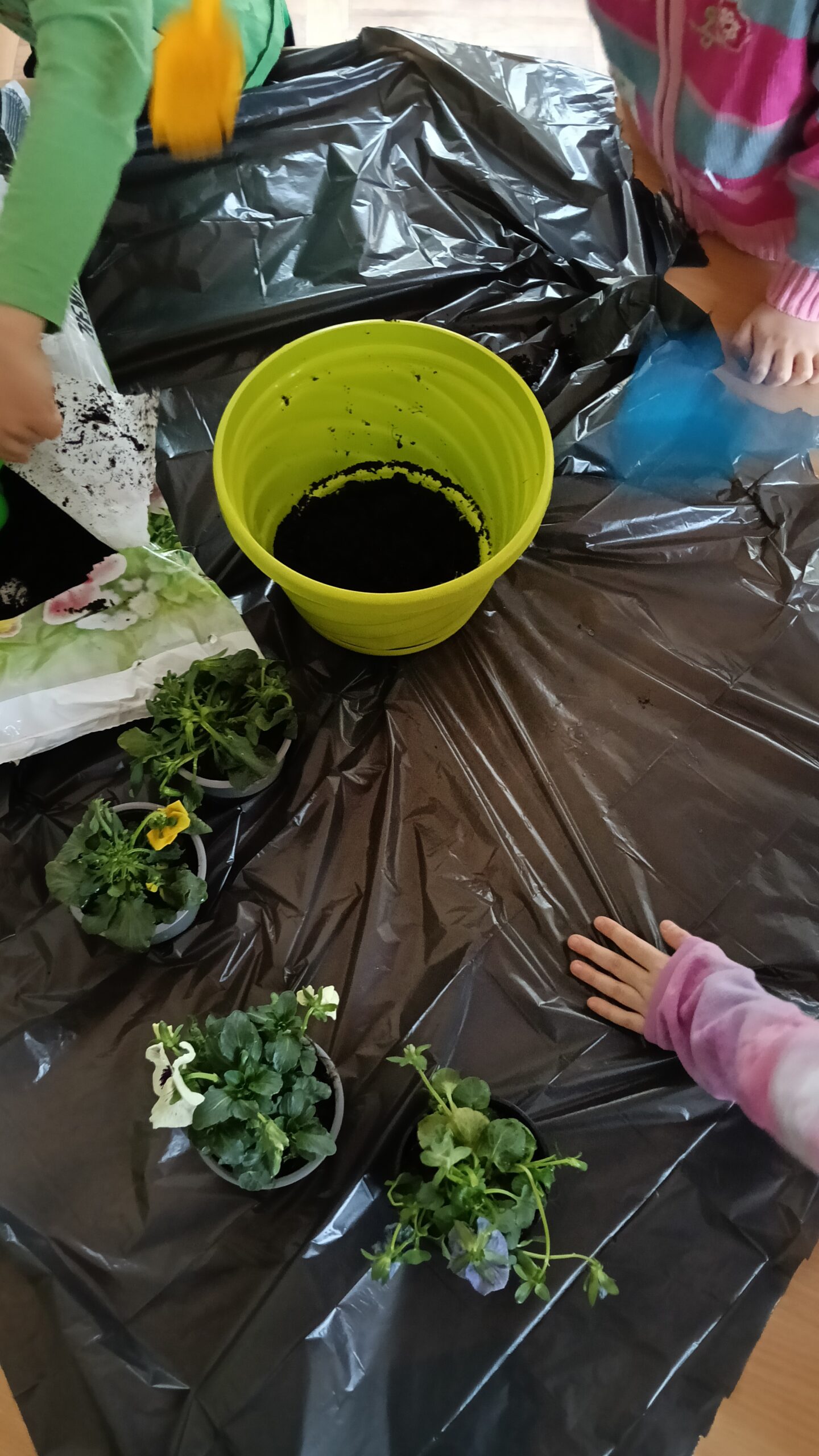 Przy okazji utrwaliliśmy nazwy różnych kwiatów i nauczyliśmy się, jak o nie dbać. Potem sami sadziliśmy roślinki do ziemi. Bardzo nam się to podobało!