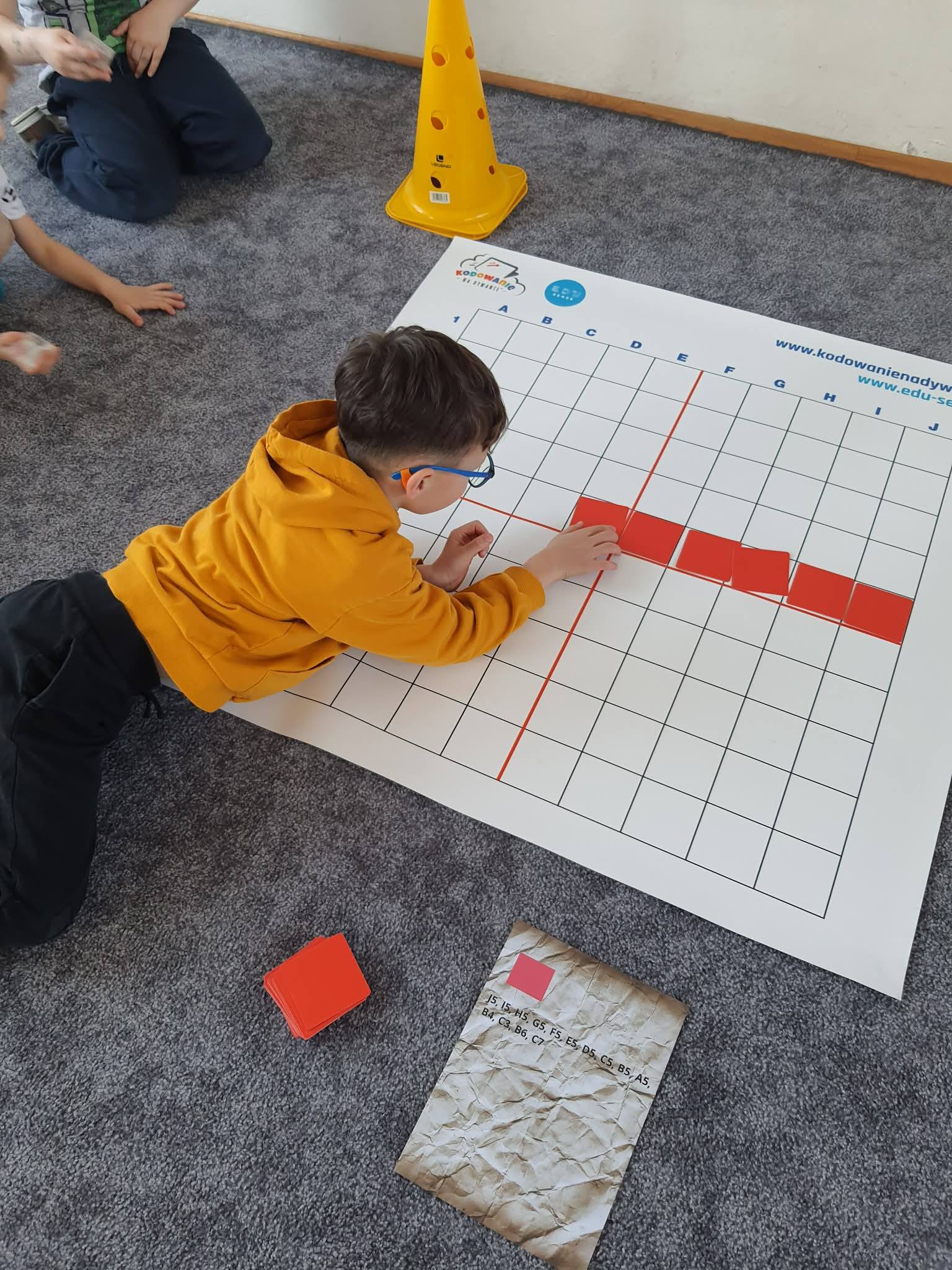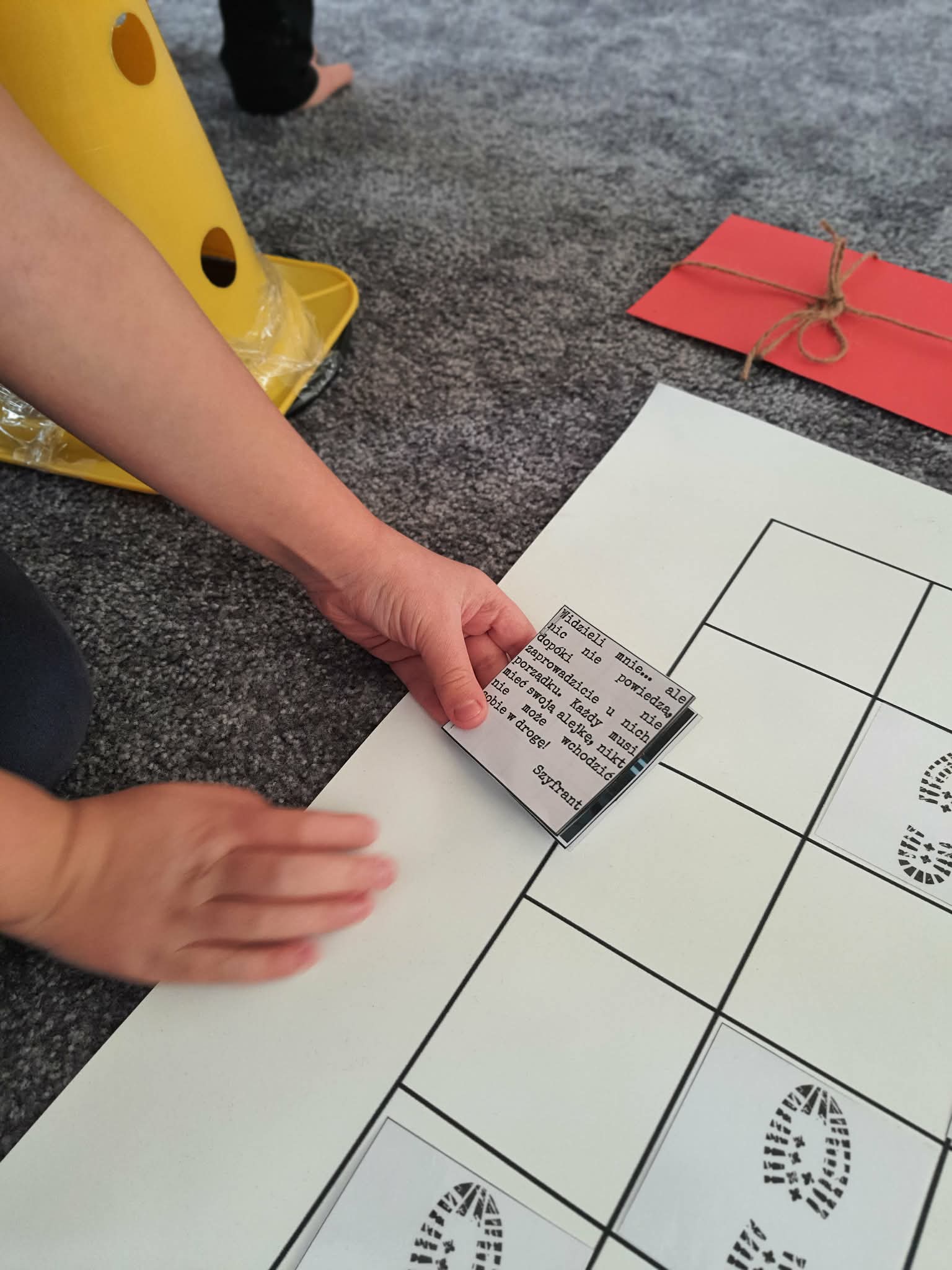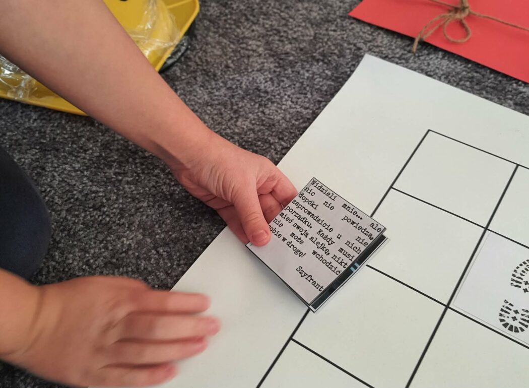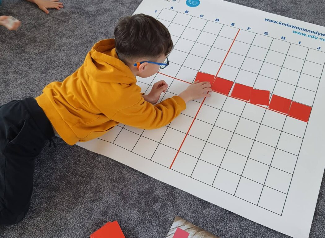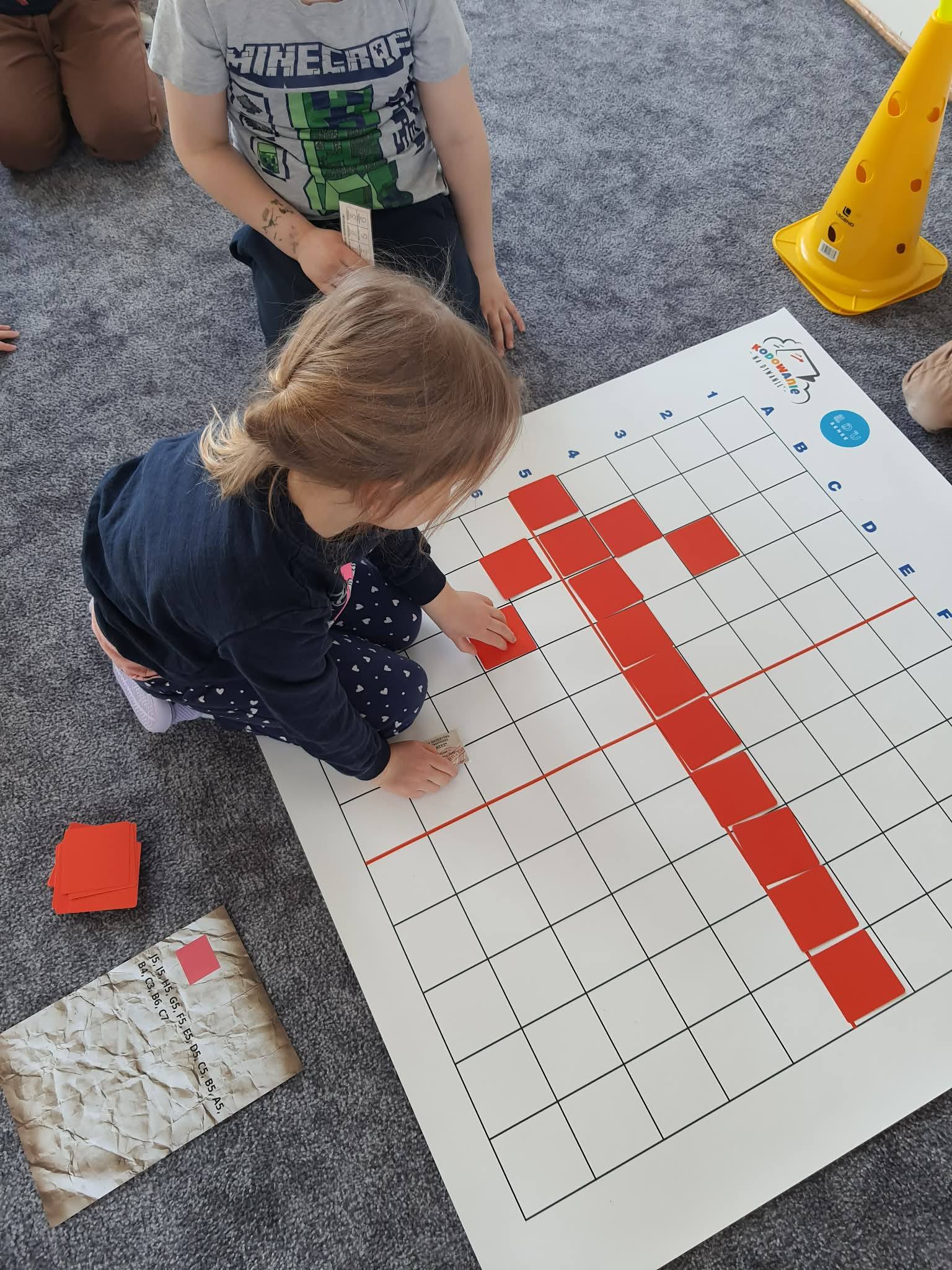 Nocne tropienie: Dzieci z niezwykłym skupieniem odczytywały współrzędne z „czarnej mapy” i odtwarzały trasę ucieczki Szyfranta na macie do kodowania.