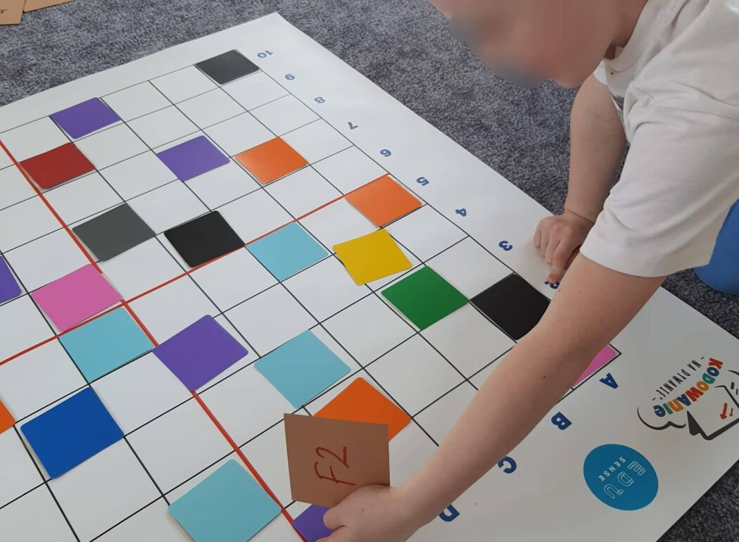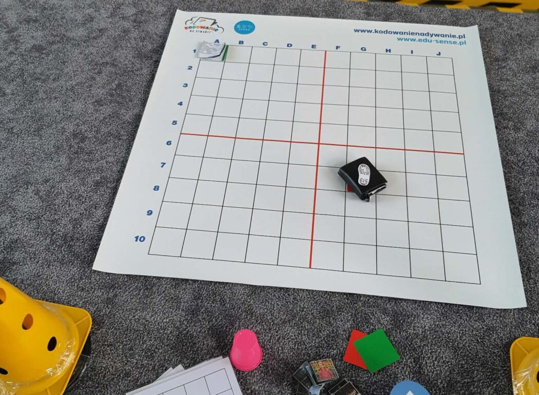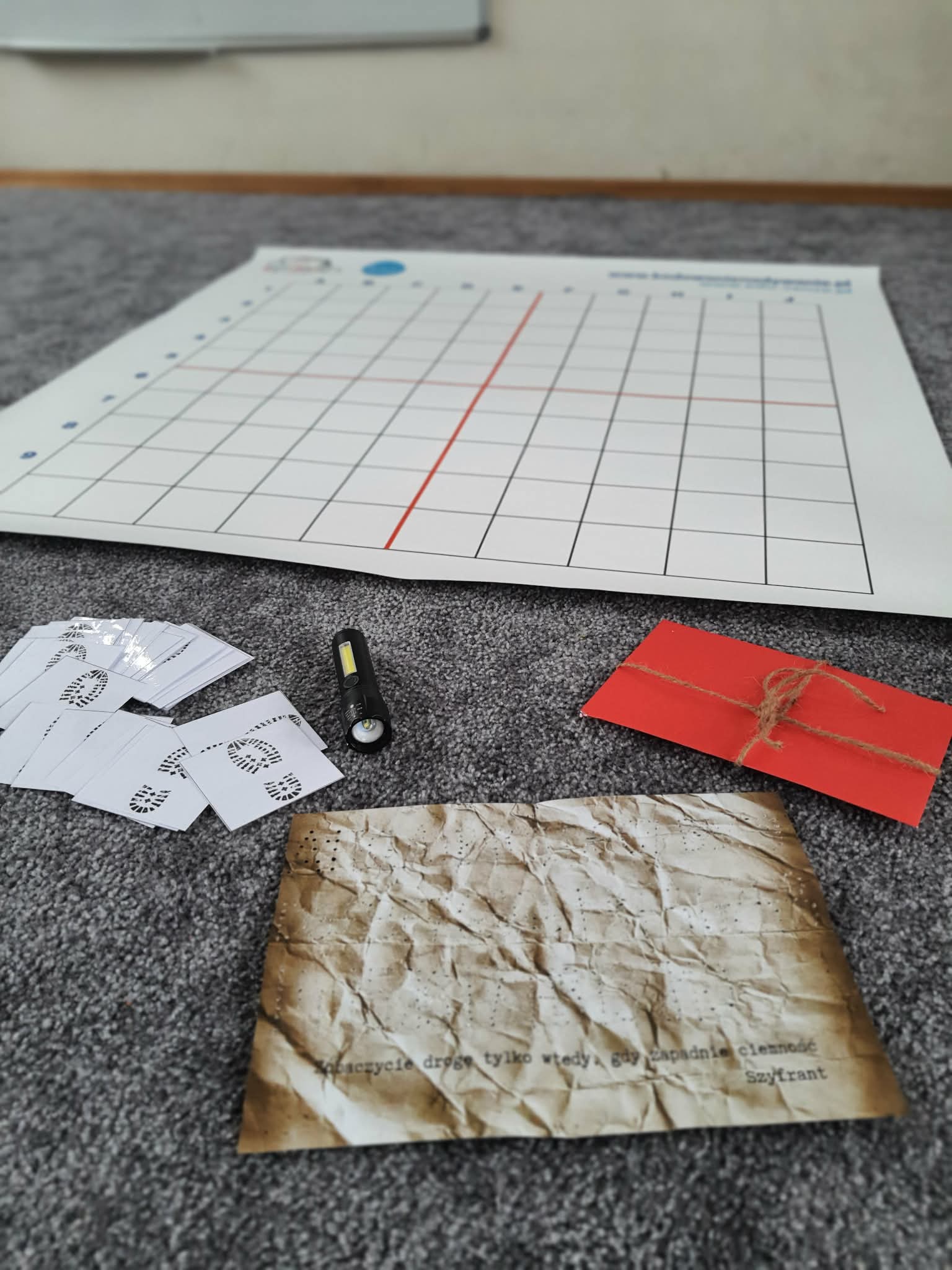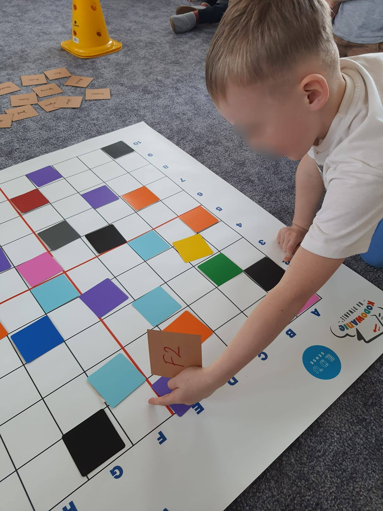 Nocne tropienie: Dzieci z niezwykłym skupieniem odczytywały współrzędne z „czarnej mapy” i odtwarzały trasę ucieczki Szyfranta na macie do kodowania.