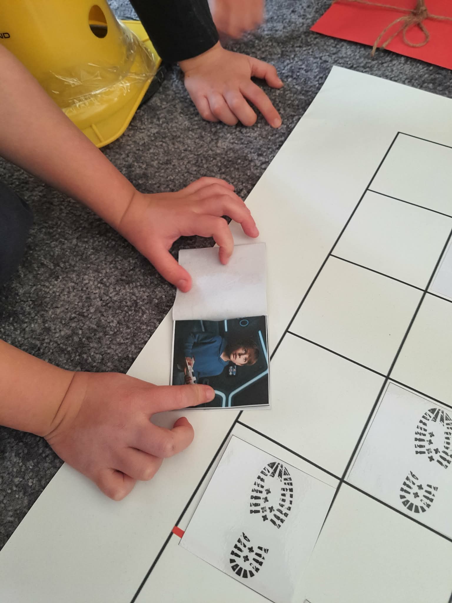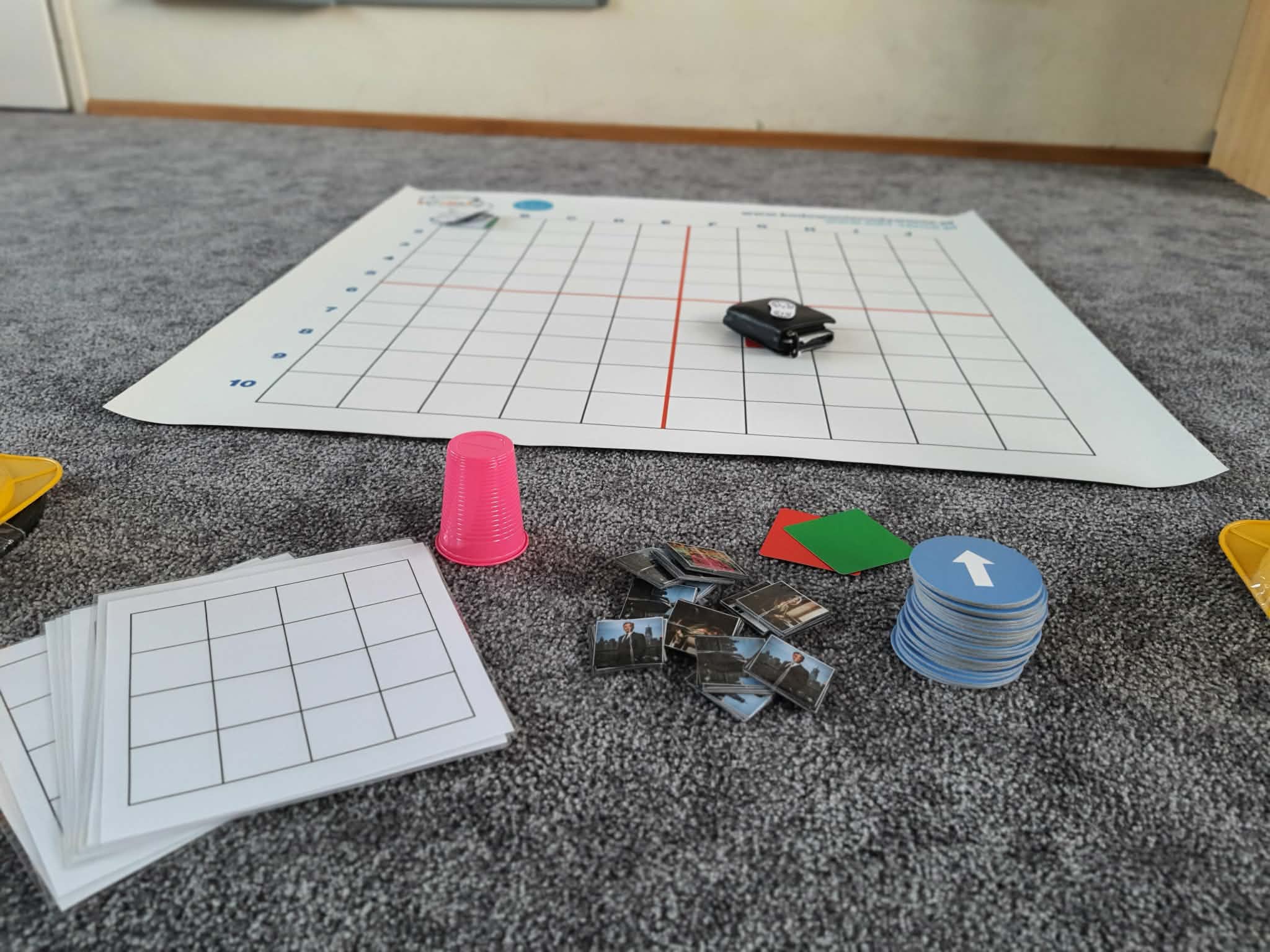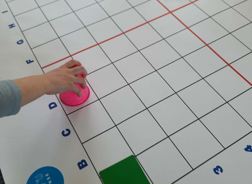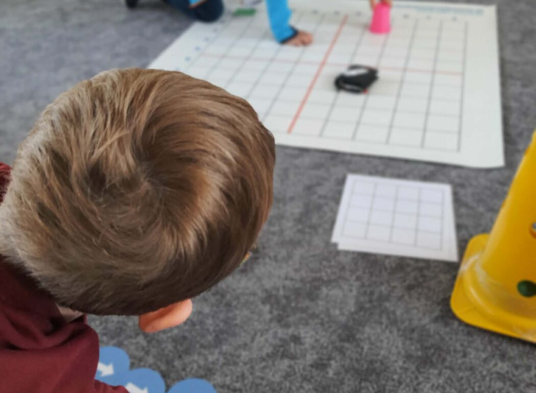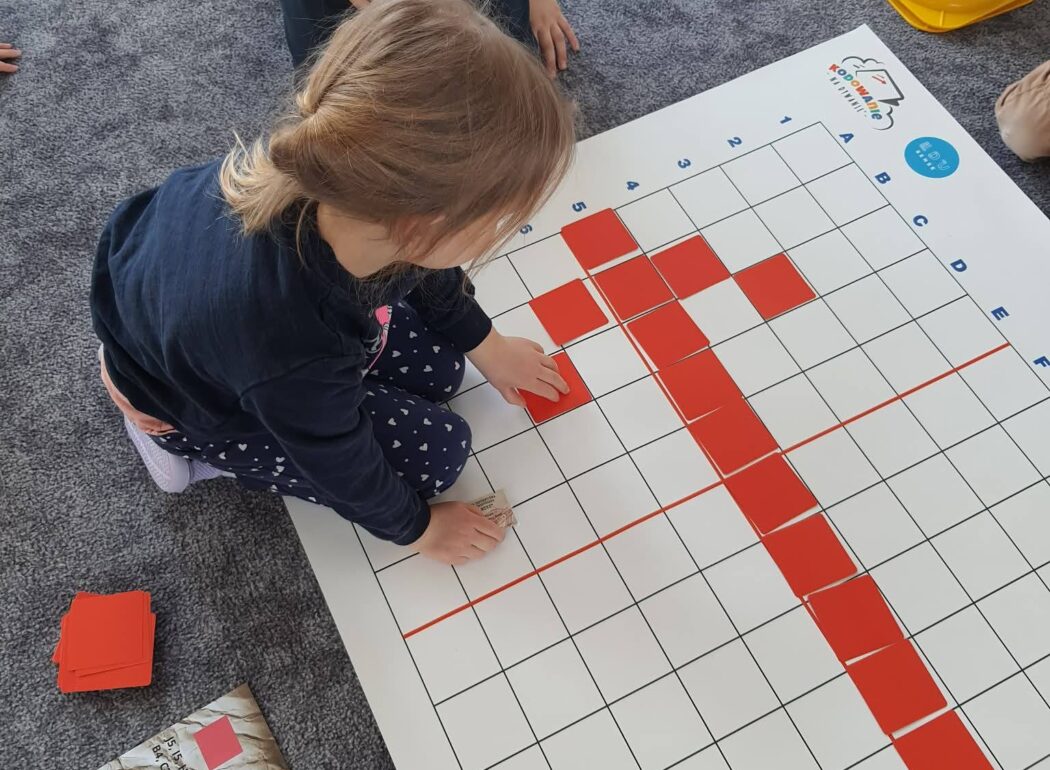 Nocne tropienie: Dzieci z niezwykłym skupieniem odczytywały współrzędne z „czarnej mapy” i odtwarzały trasę ucieczki Szyfranta na macie do kodowania.