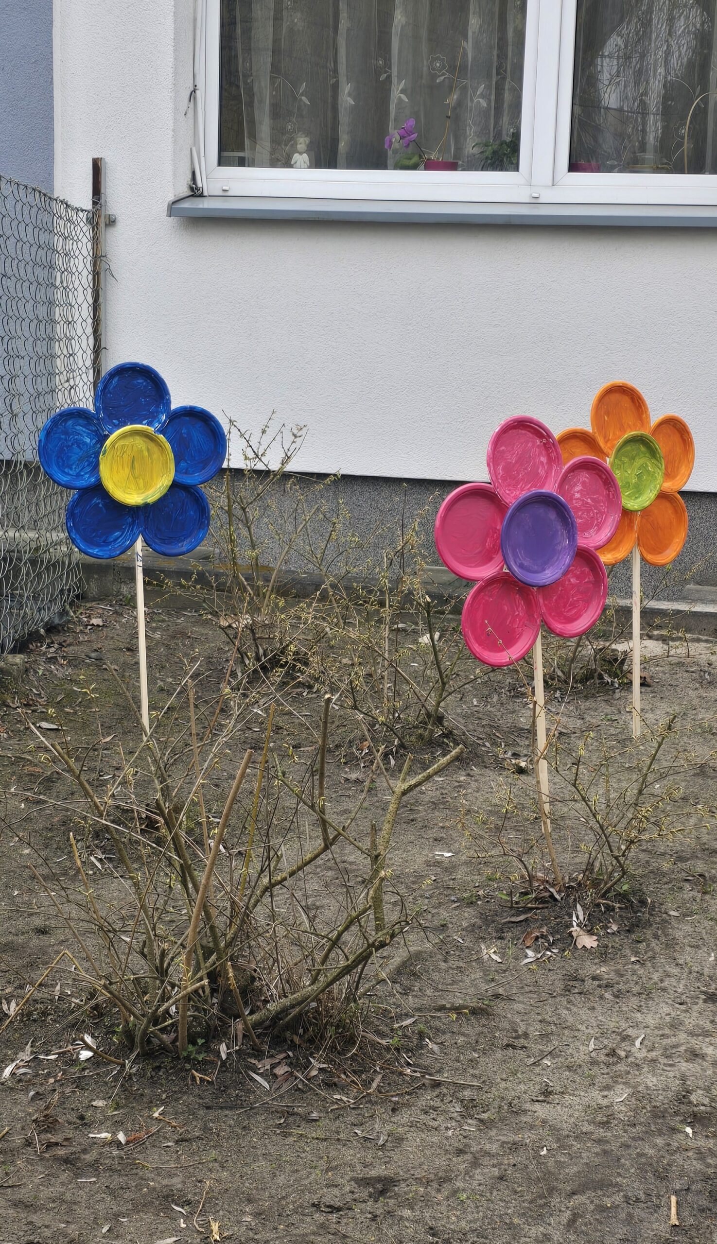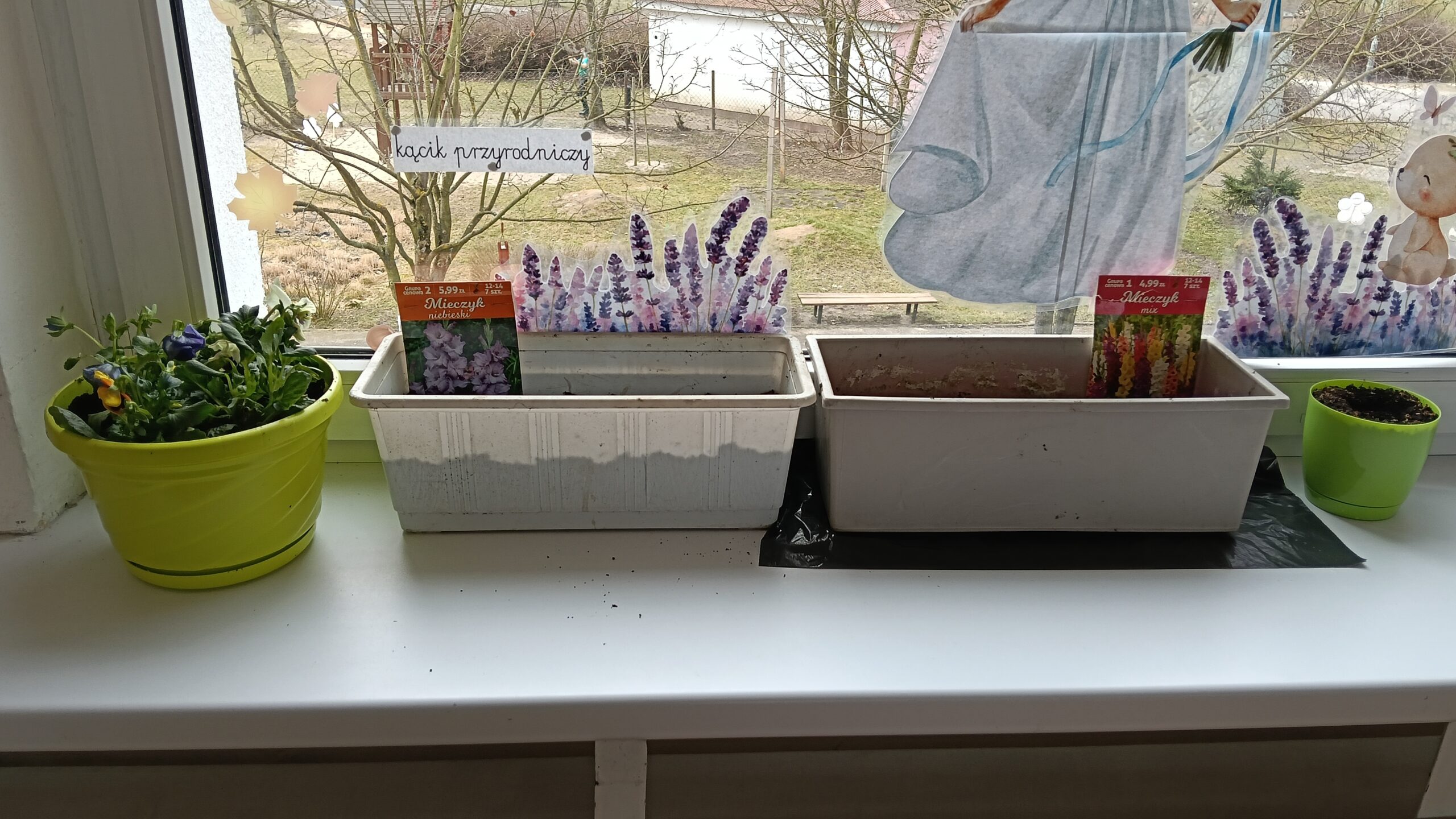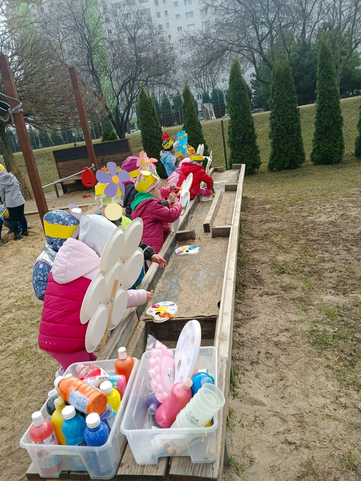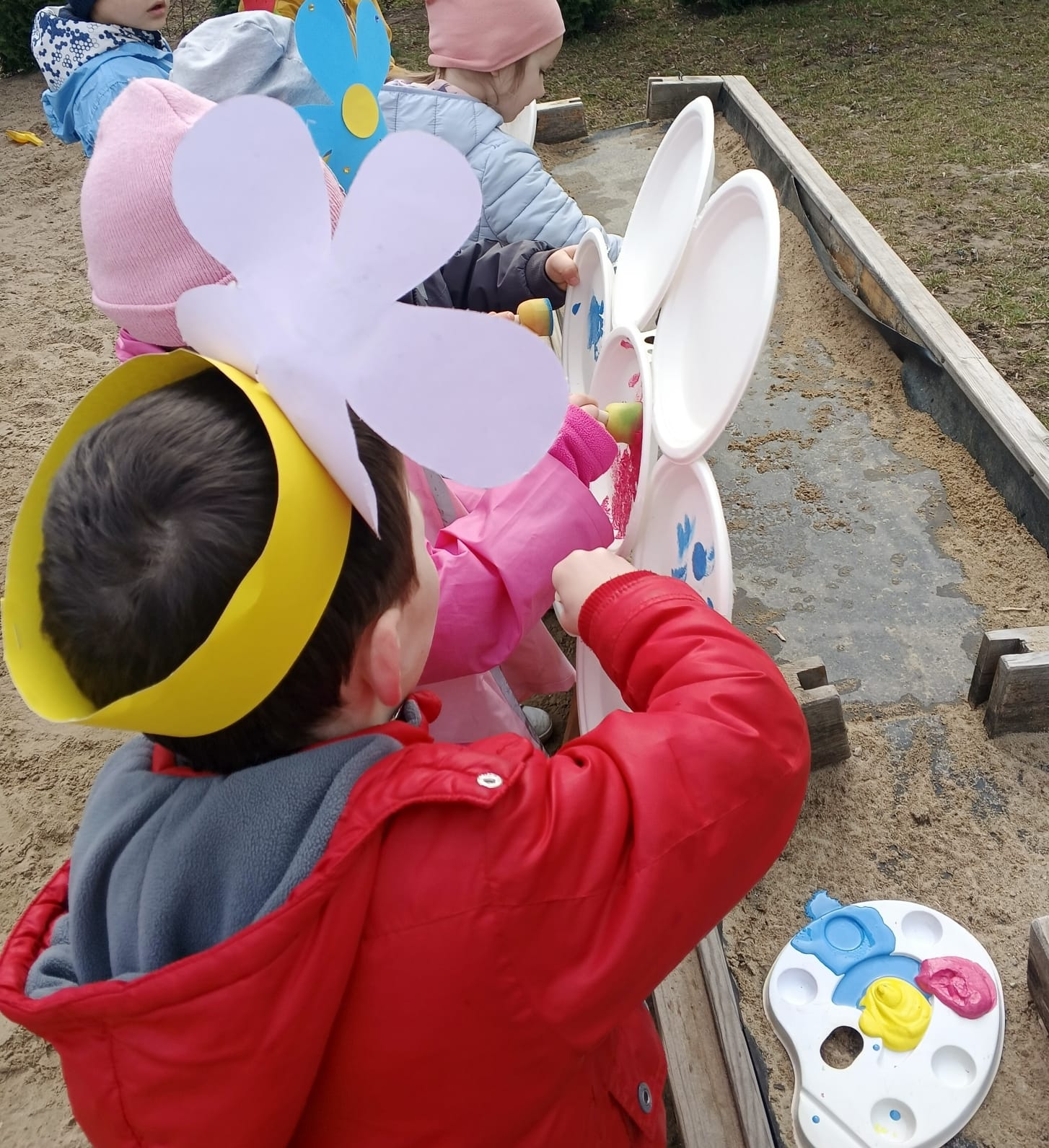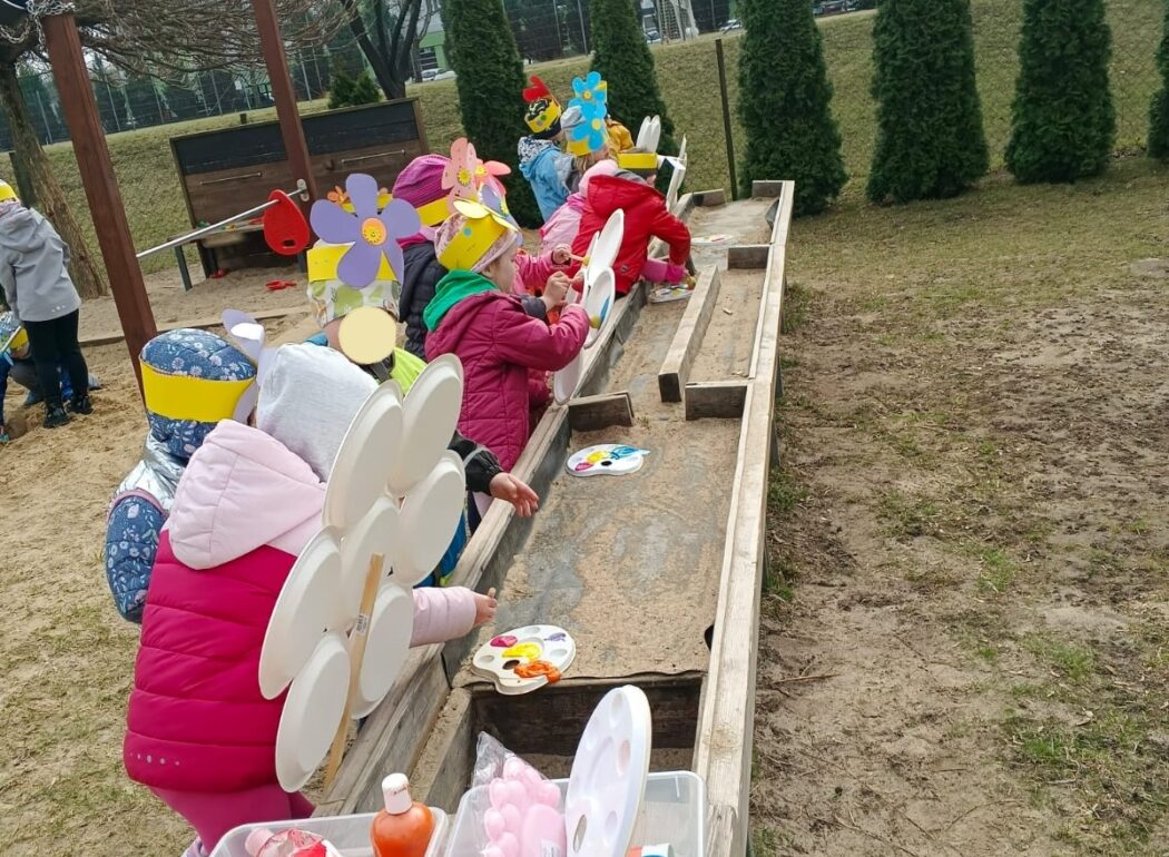 Na powitanie Pani Wiosny zaaranżowaliśmy w sali wiosenny kącik przyrodniczy. Zasadziliśmy w korytkach świeże kwiaty oraz cebulki, które, mamy nadzieję, wyrosną w mgnieniu oka.Po powrocie z wiosennego pochodu przyszedł też czas na malowanie papierowych kwiatów, które „kwitną” już w naszym ogrodzie.