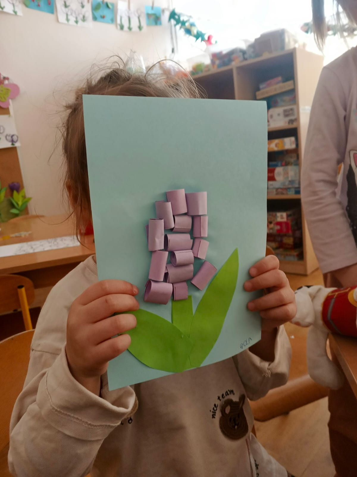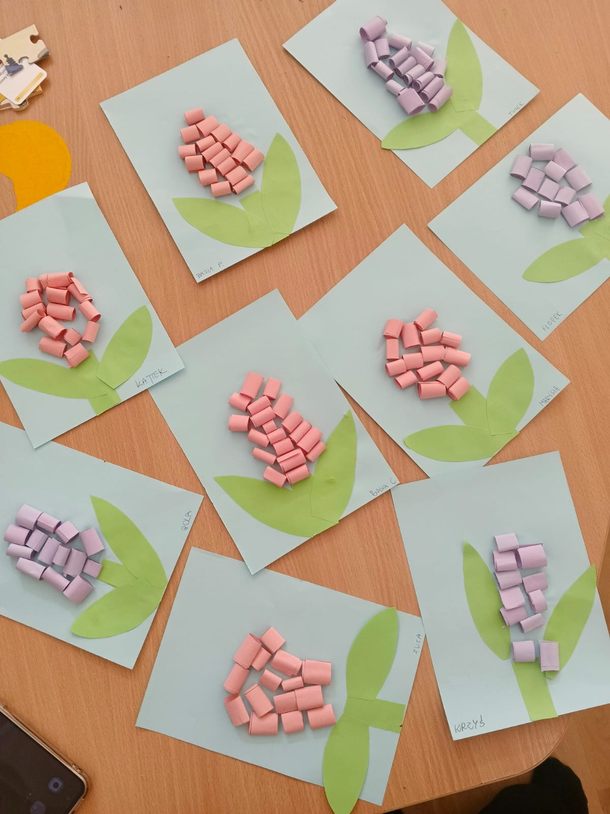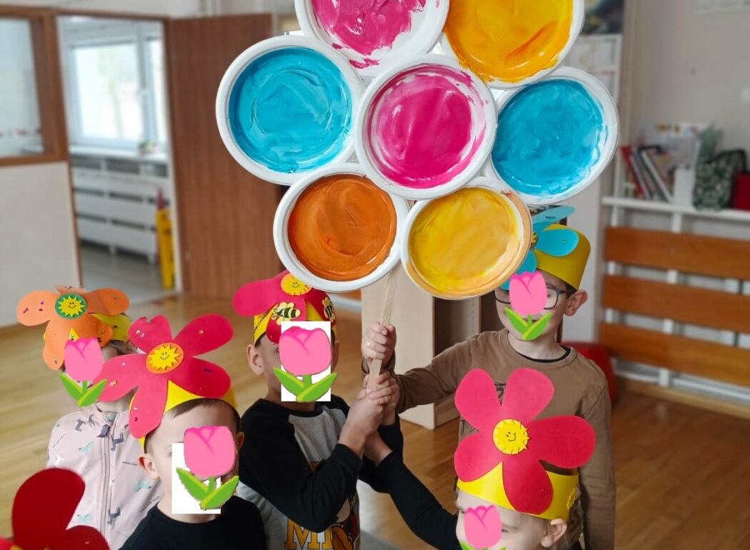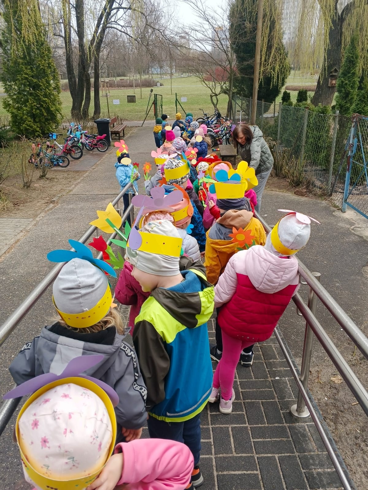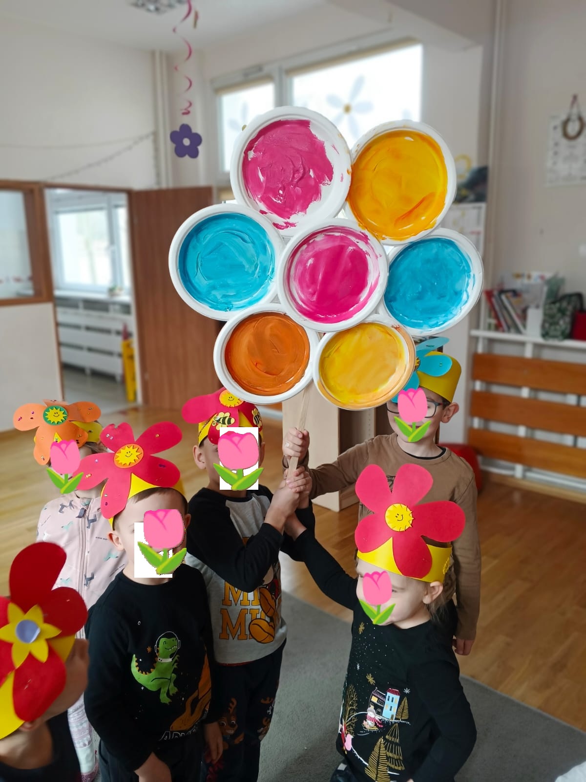 Na powitanie Pani Wiosny zaaranżowaliśmy w sali wiosenny kącik przyrodniczy. Zasadziliśmy w korytkach świeże kwiaty oraz cebulki, które, mamy nadzieję, wyrosną w mgnieniu oka.Po powrocie z wiosennego pochodu przyszedł też czas na malowanie papierowych kwiatów, które „kwitną” już w naszym ogrodzie.