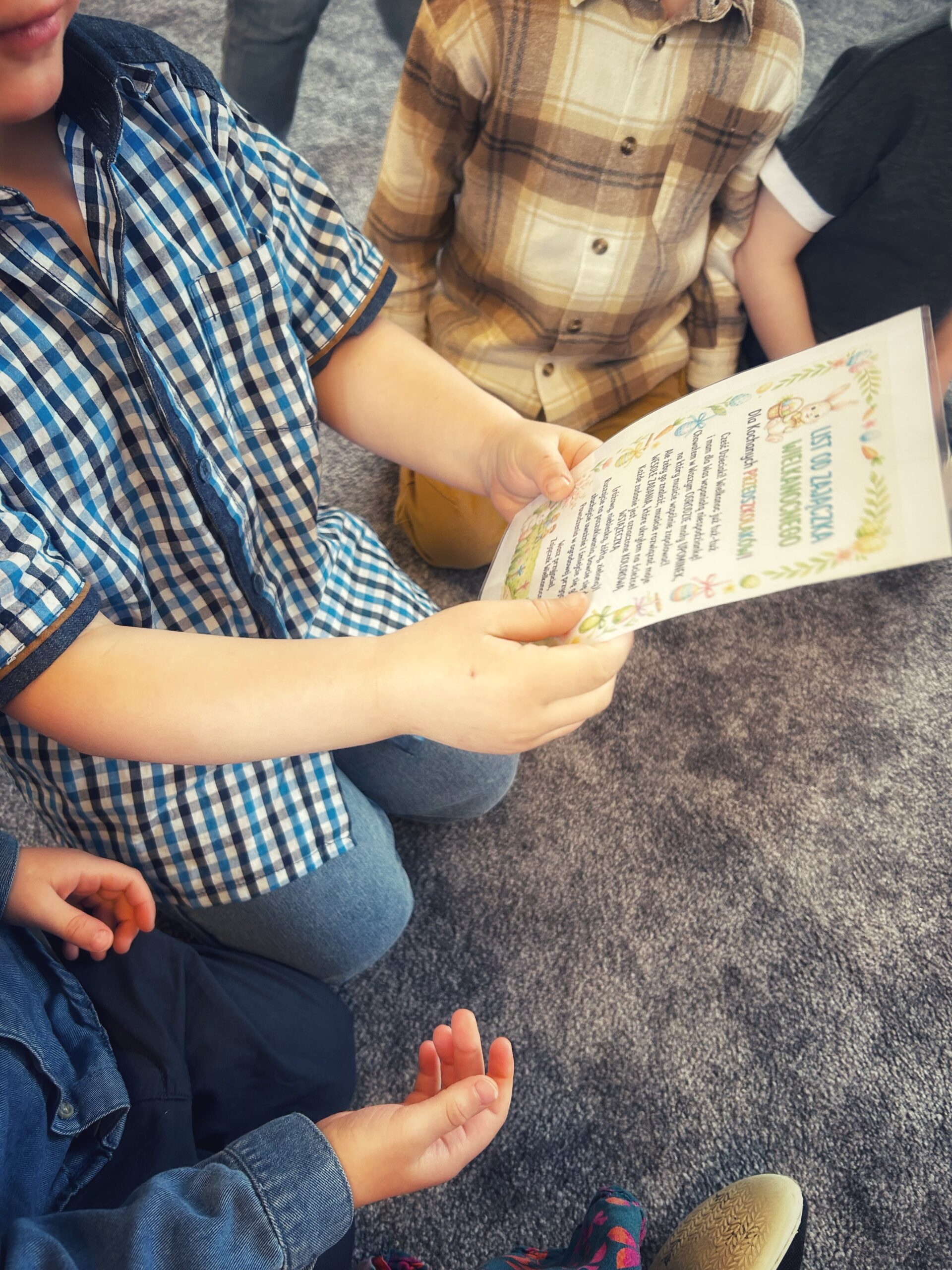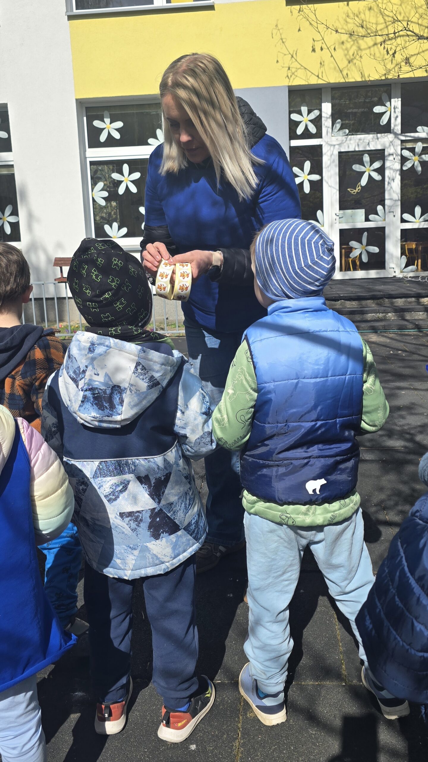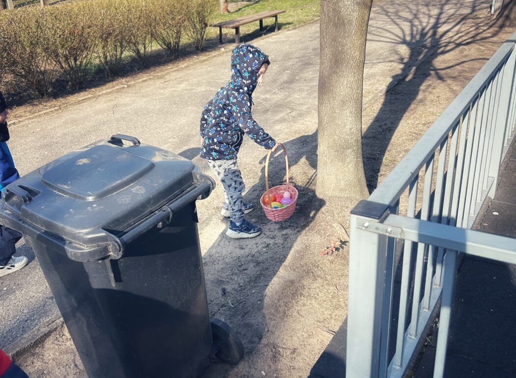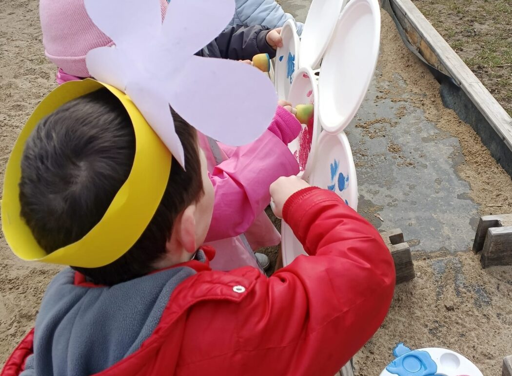 Gdy brzuszki były już pełne, a nastroje wyśmienite, nagle usłyszeliśmy głośne pukanie do drzwi. Zaintrygowani pobiegliśmy sprawdzić, kto to i znaleźliśmy tajemniczy list – list od Wielkanocnego Zajączka zachęcający do poszukiwania upominków w naszym ogrodzie. Jednak aby je zdobyć, musieliśmy rozwiązać kilka zadań i wziąć udział w wielkanocnej grze terenowej. Czym prędzej ruszyliśmy na poszukiwania. Każde zadanie było inną, radosną przygodą.