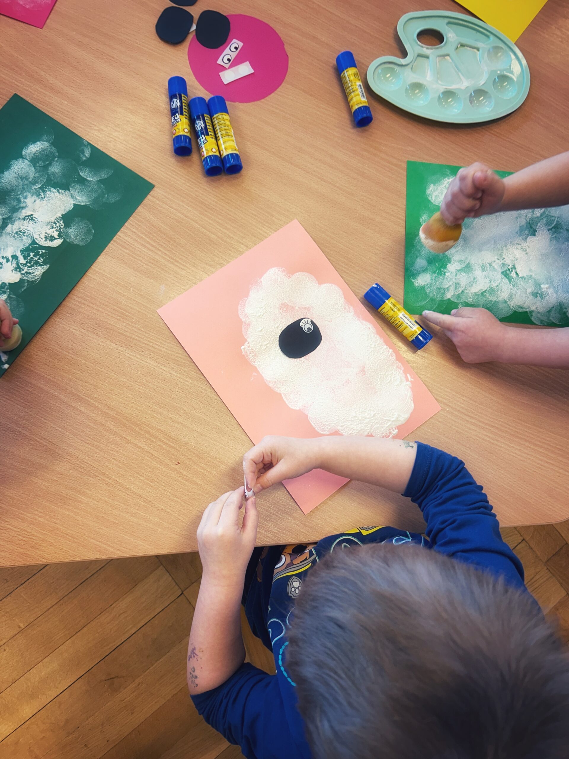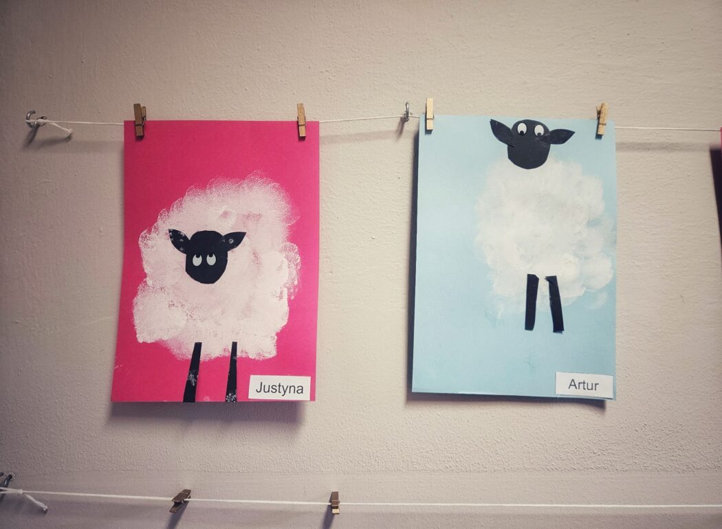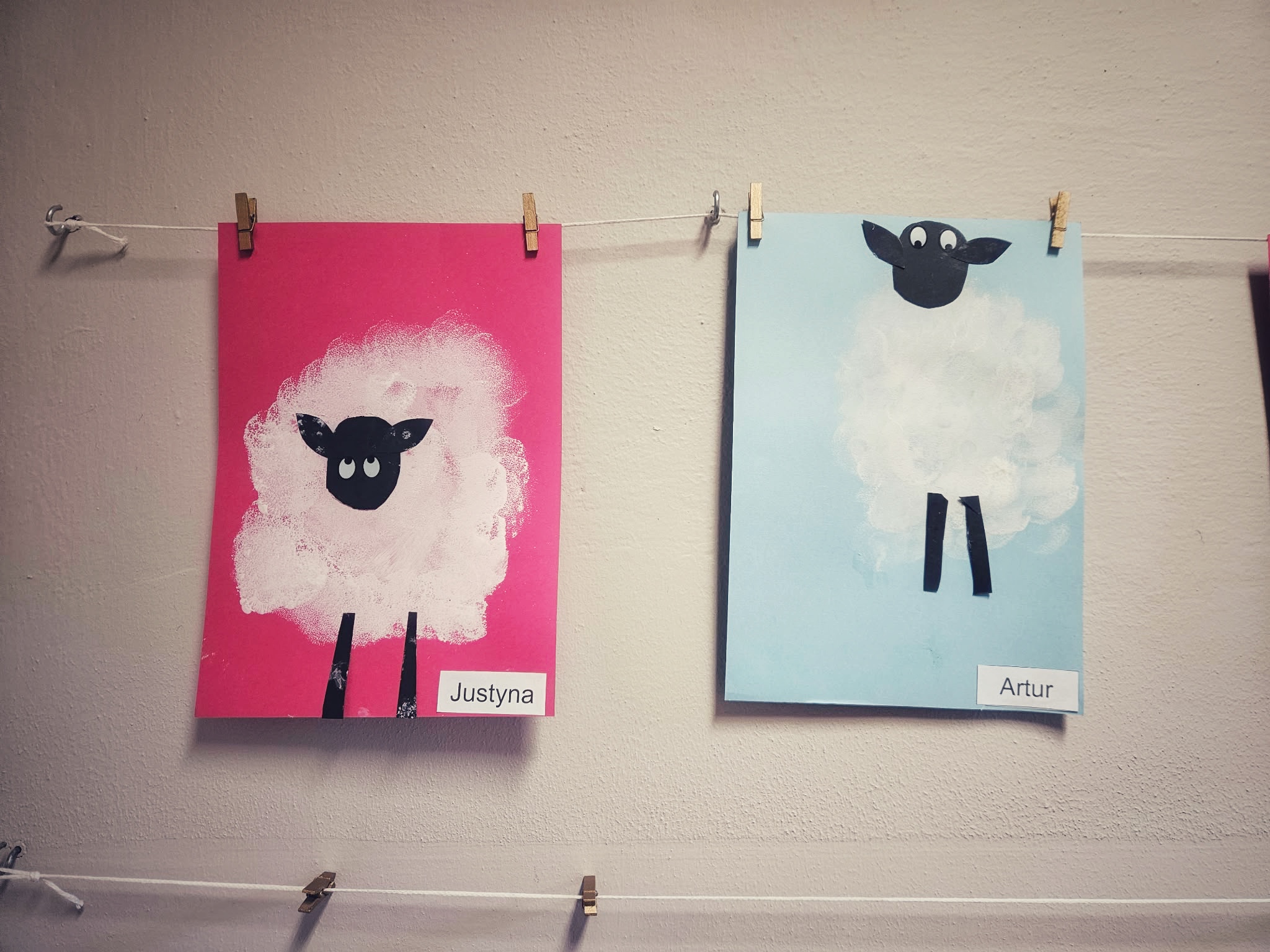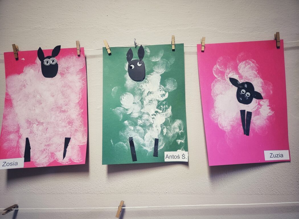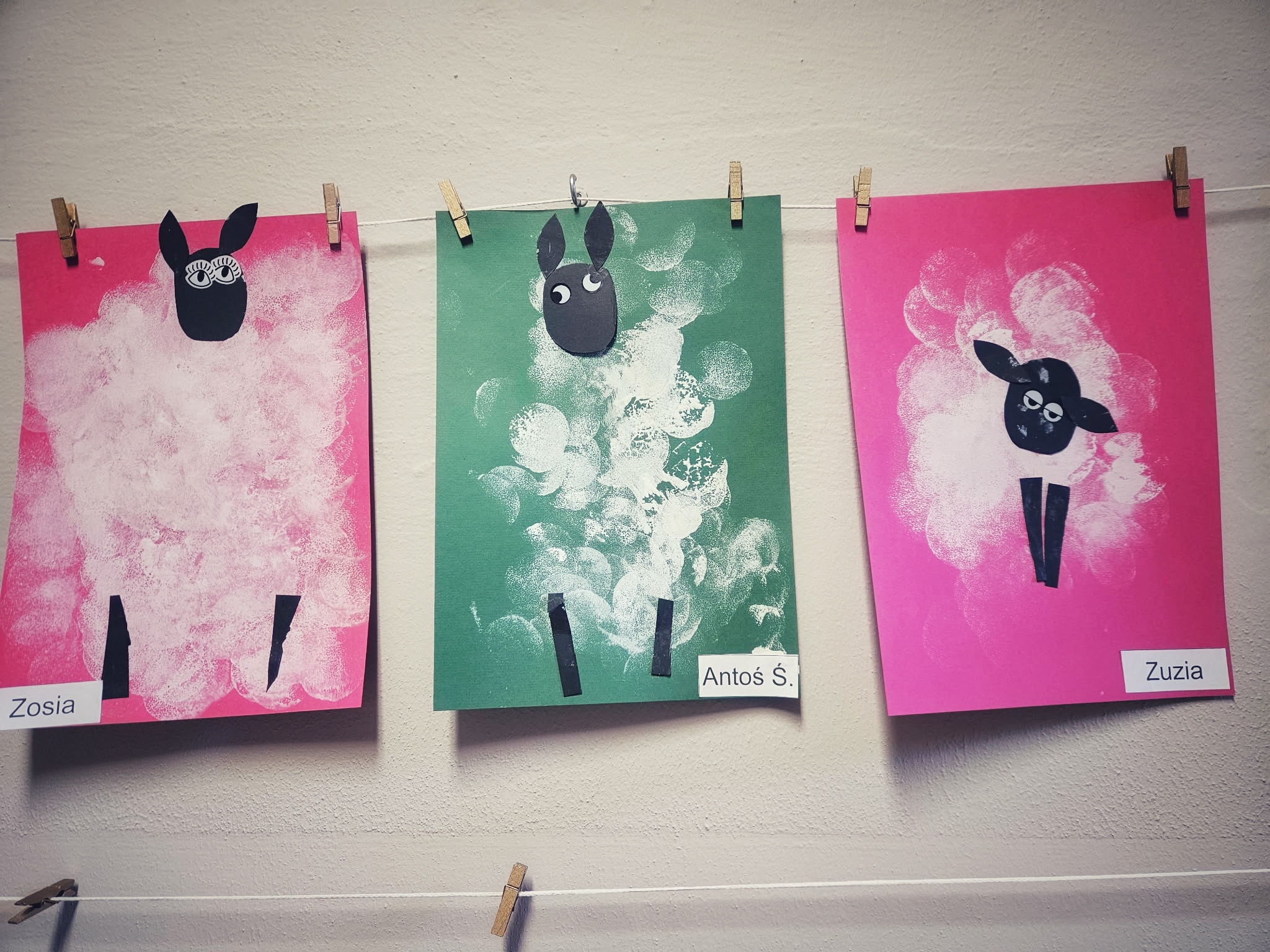 W ramach podsumowania tygodnia o zwierzętach wiejskich stworzyliśmy własne owieczki. Najpierw za pomocą stemplowania pojawiły się puchate chmurki, które dzięki działaniom kompozycyjnym zamieniły się w cudne i niepowtarzalne owce.