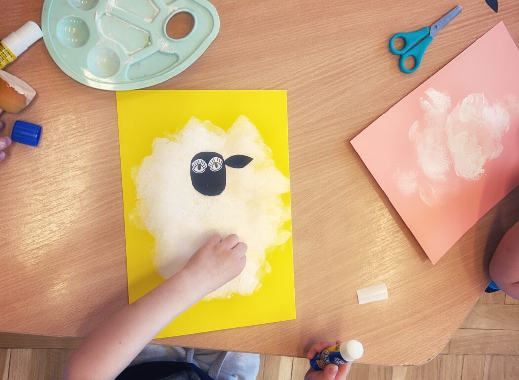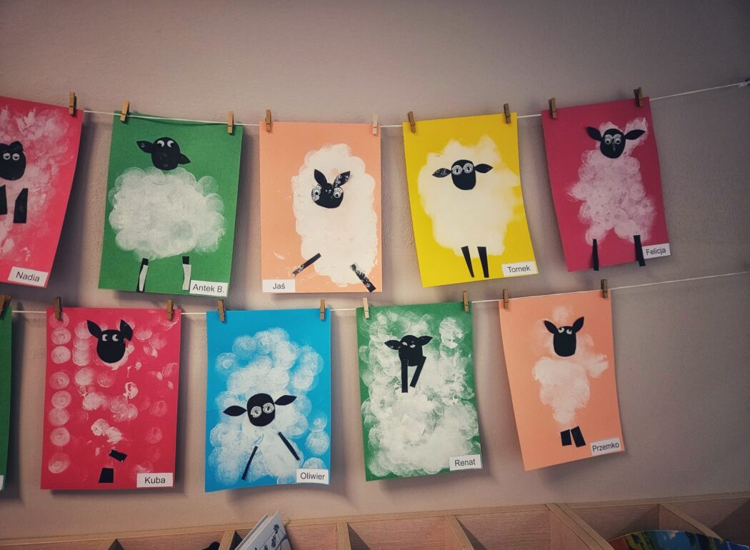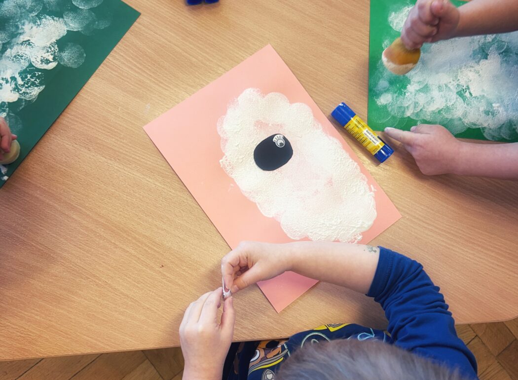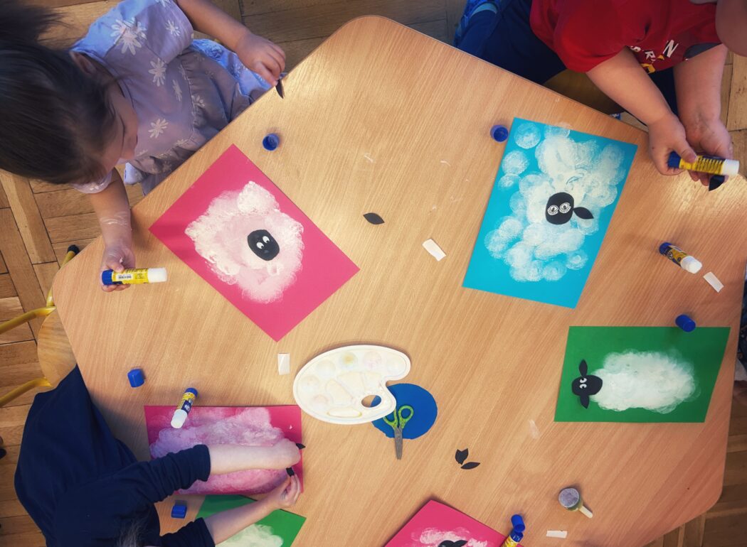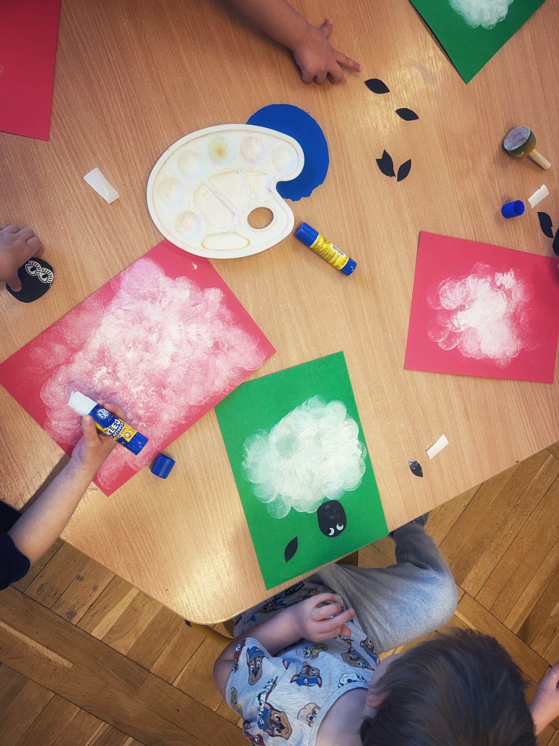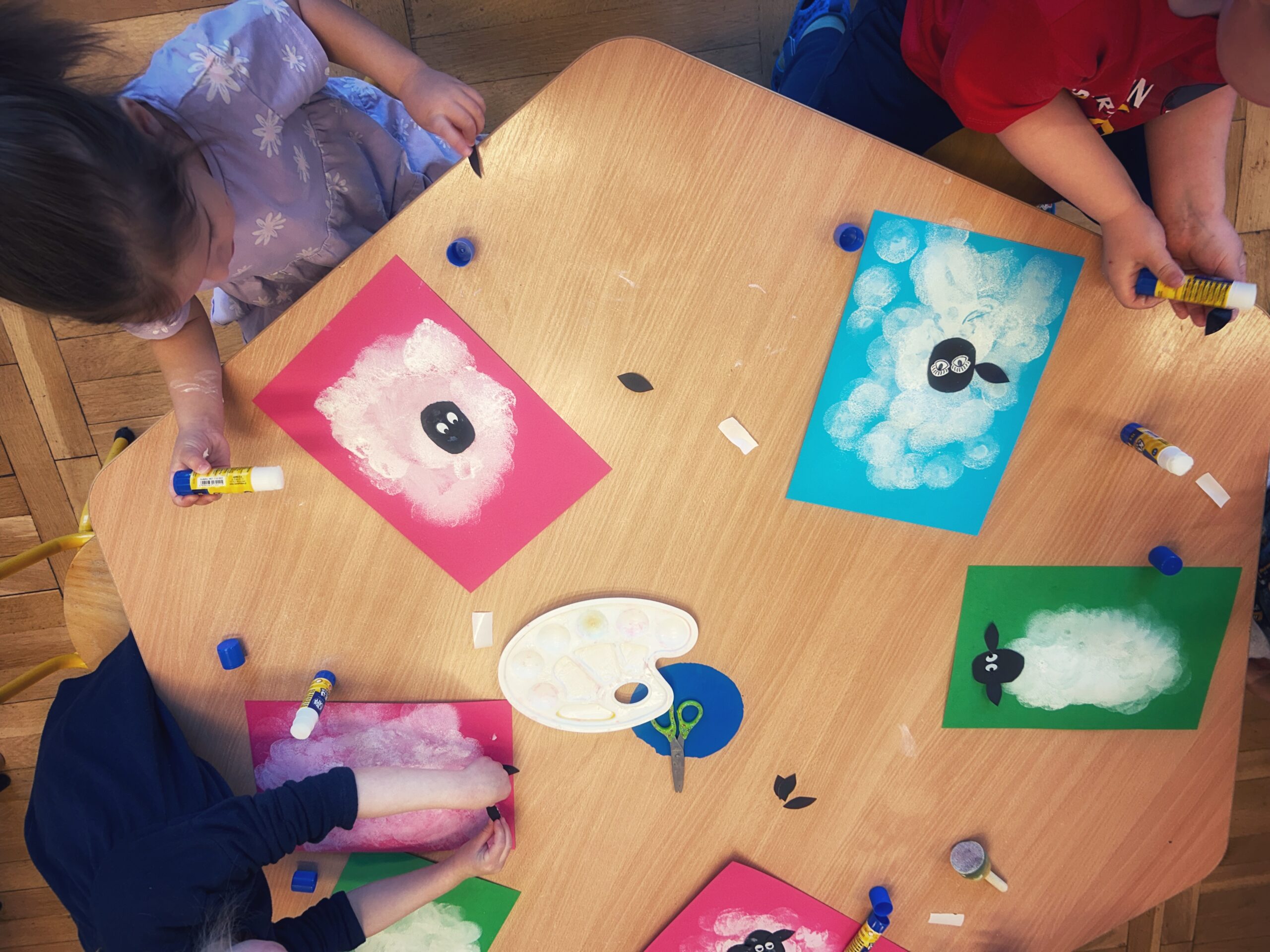 W ramach podsumowania tygodnia o zwierzętach wiejskich stworzyliśmy własne owieczki. Najpierw za pomocą stemplowania pojawiły się puchate chmurki, które dzięki działaniom kompozycyjnym zamieniły się w cudne i niepowtarzalne owce.