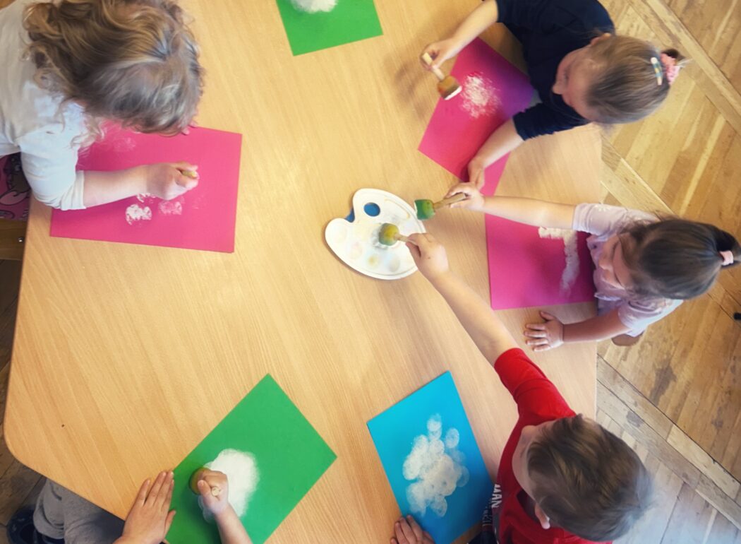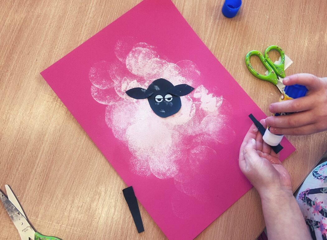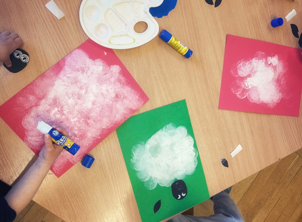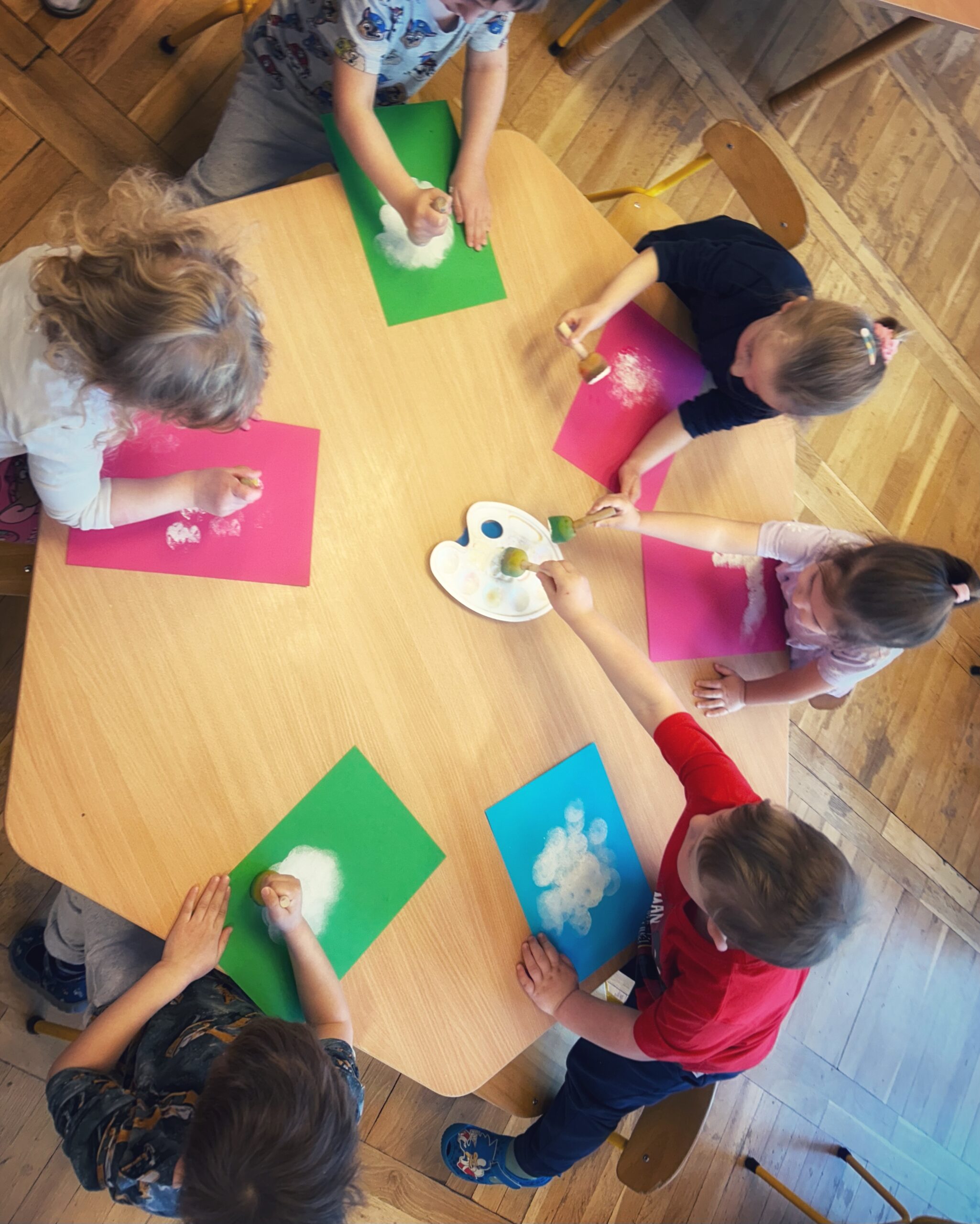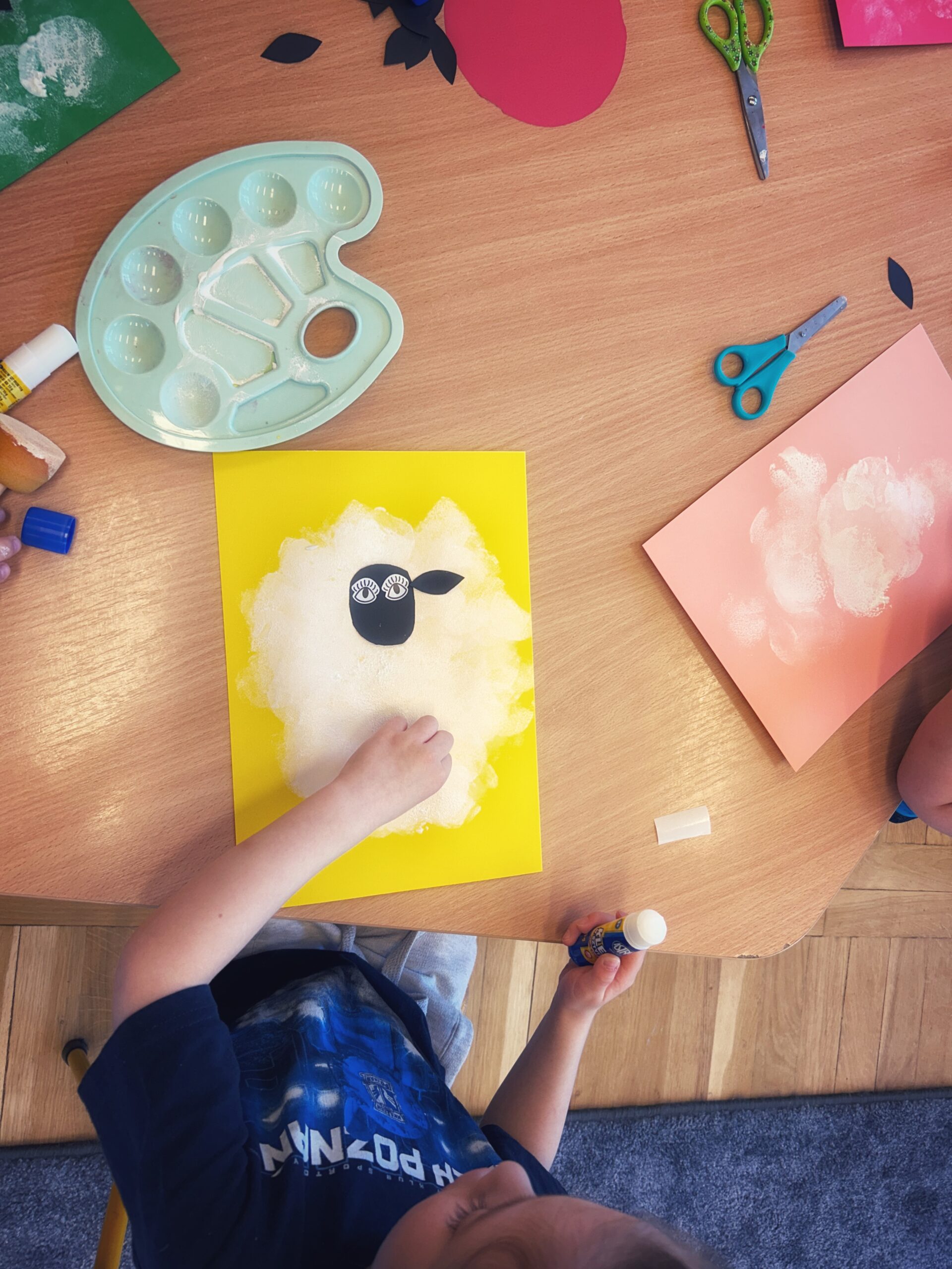 W ramach podsumowania tygodnia o zwierzętach wiejskich stworzyliśmy własne owieczki. Najpierw za pomocą stemplowania pojawiły się puchate chmurki, które dzięki działaniom kompozycyjnym zamieniły się w cudne i niepowtarzalne owce.