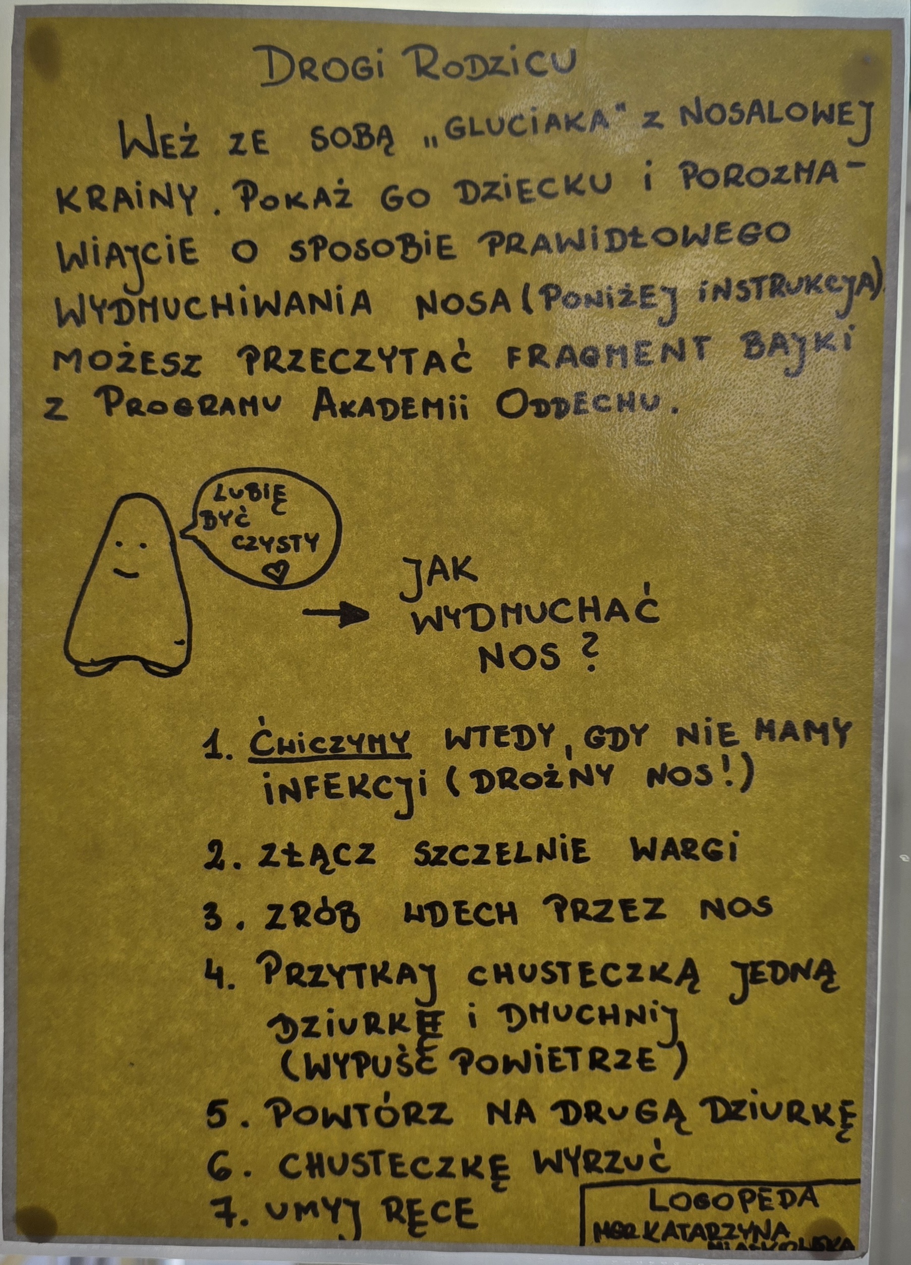 We wtorek odwiedziła nas Pani Katarzyna Miałkowska, nasza logopeda. Przeprowadziła zajęcia dotyczące prawidłowego oczyszczania nosa i przedstawiła nam „glutka”.