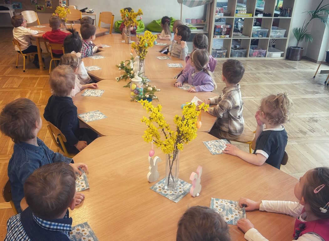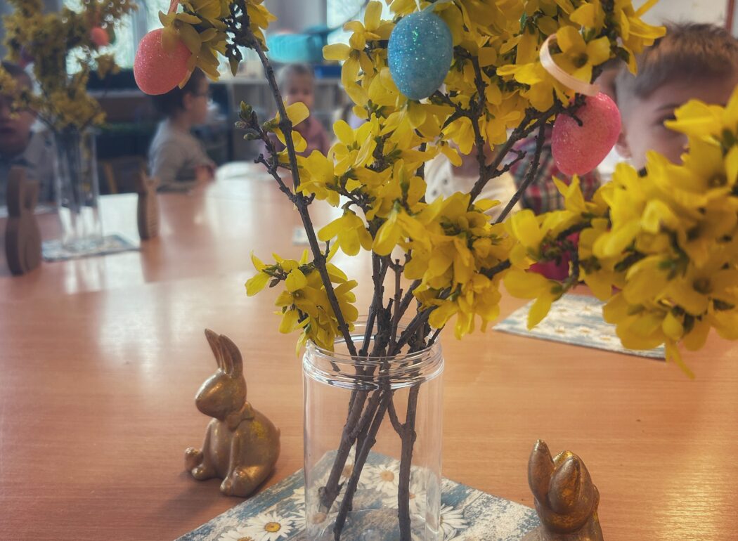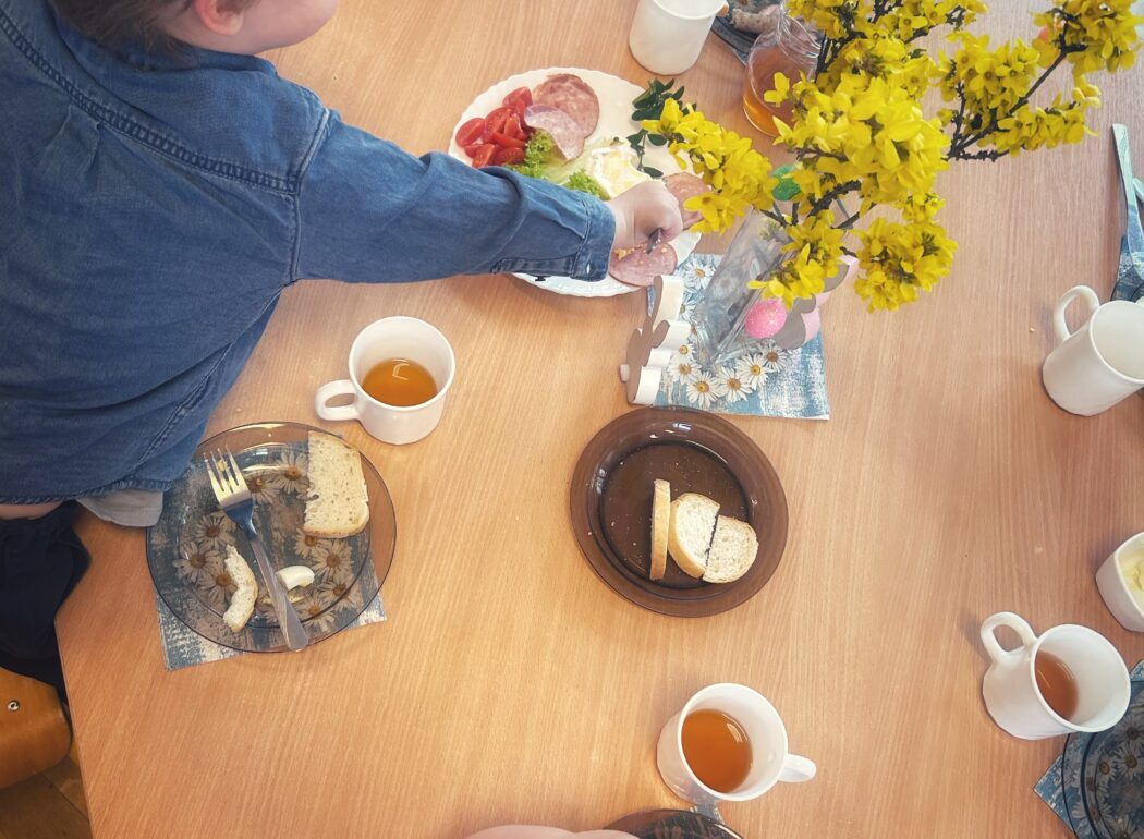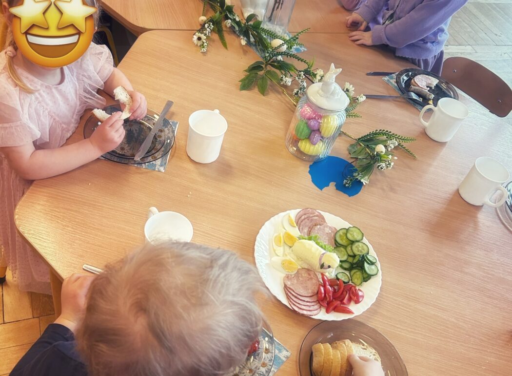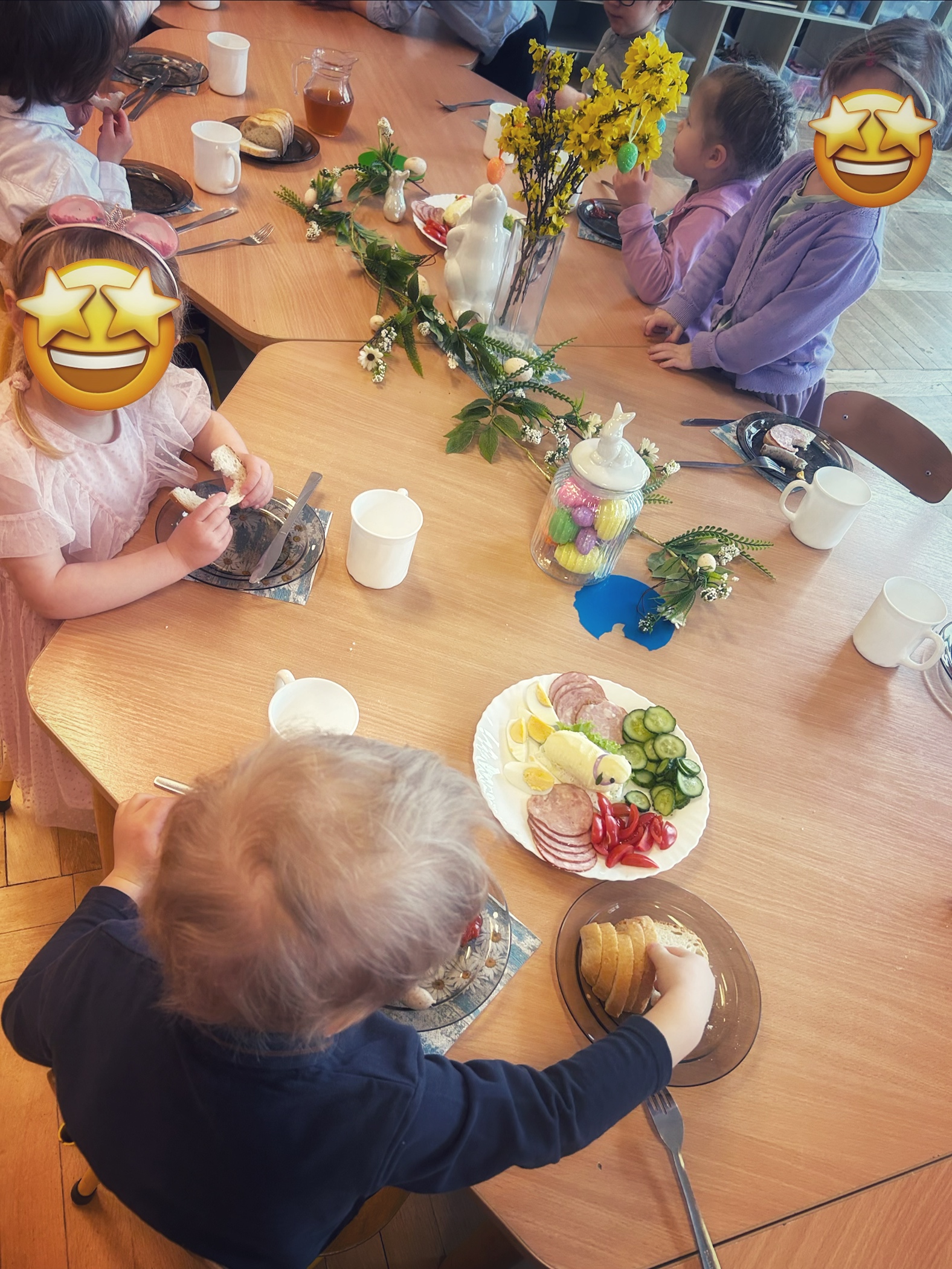 Ten dzień był pełen magii, radości i… niespodzianek! Świętowanie rozpoczęliśmy od uroczystego śniadania wielkanocnego. Zasiedliśmy wspólnie do pięknie ozdobionych stołów na których pojawiły się tradycyjne pyszności.