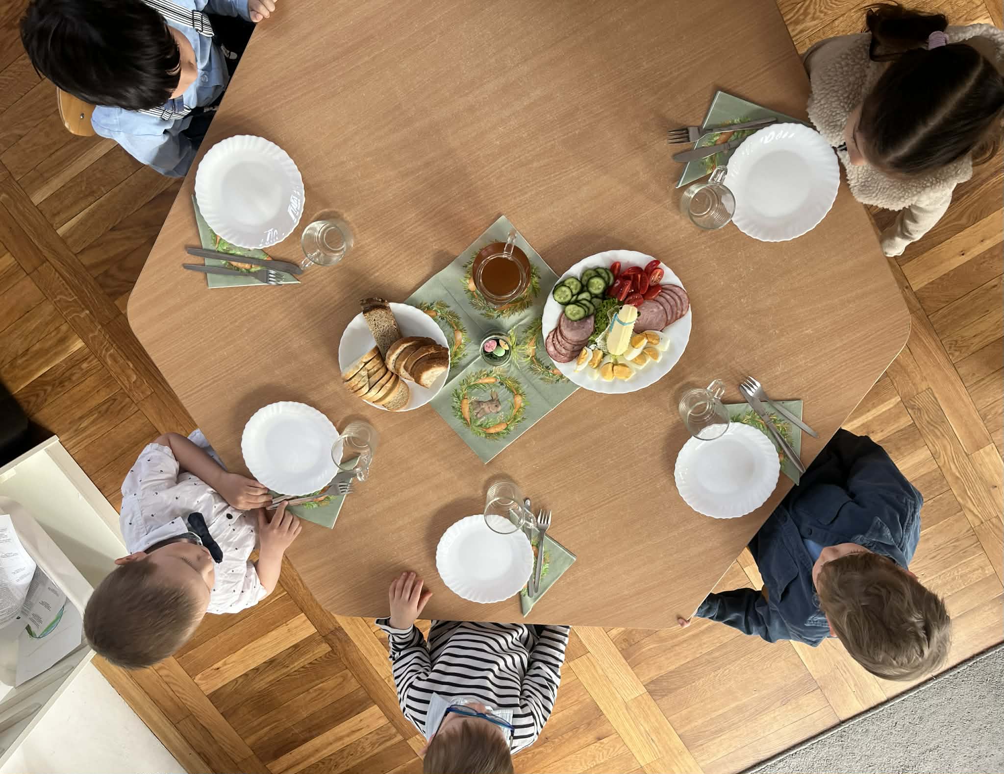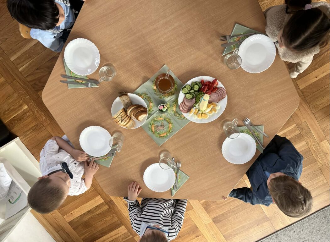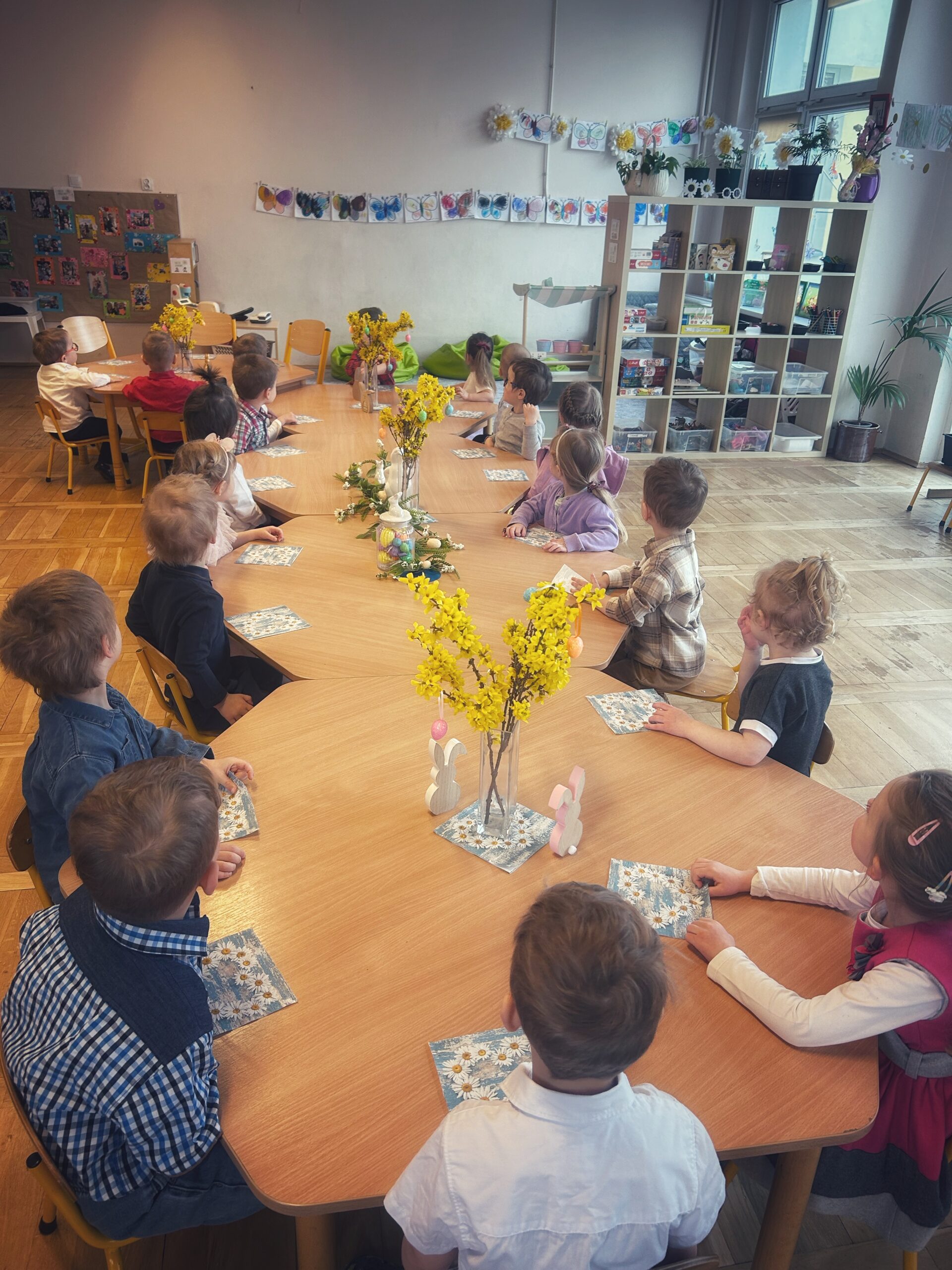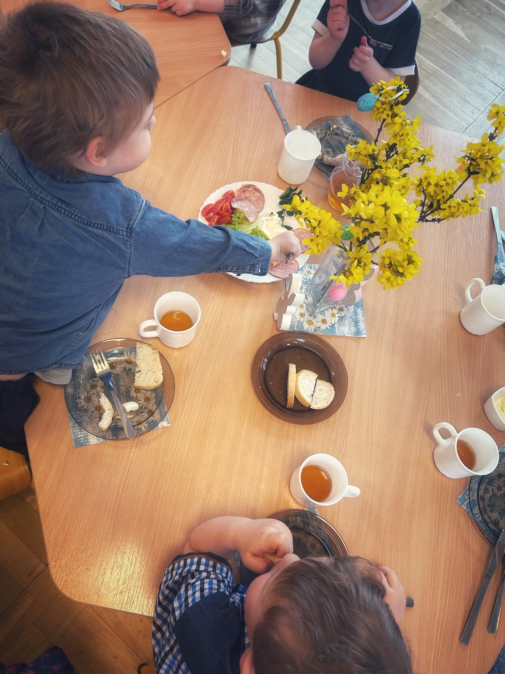 Ten dzień był pełen magii, radości i… niespodzianek! Świętowanie rozpoczęliśmy od uroczystego śniadania wielkanocnego. Zasiedliśmy wspólnie do pięknie ozdobionych stołów na których pojawiły się tradycyjne pyszności.
