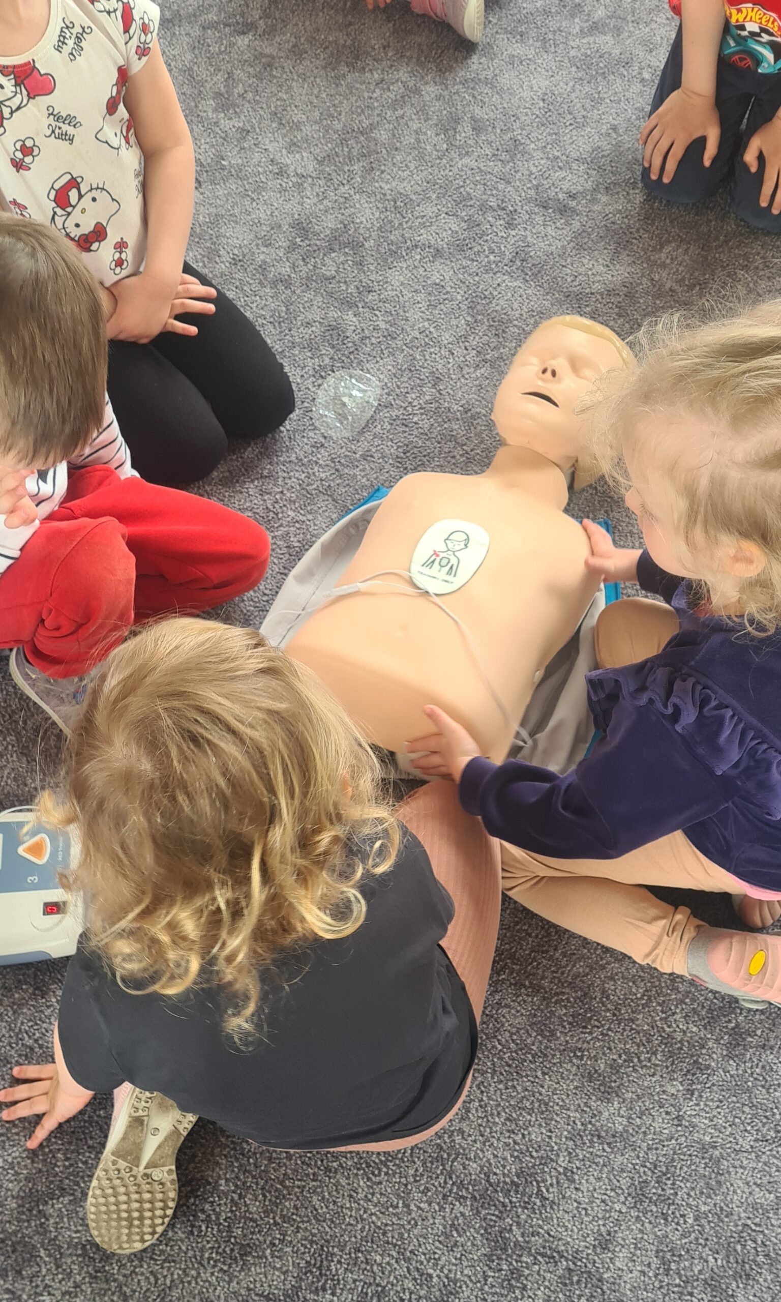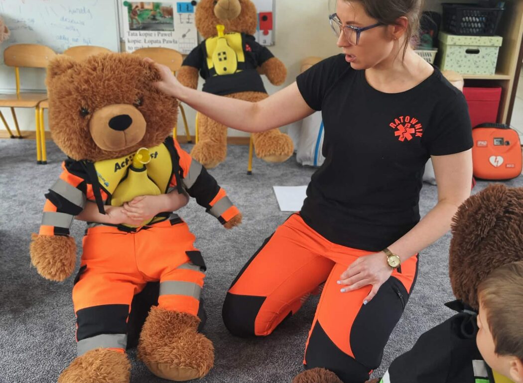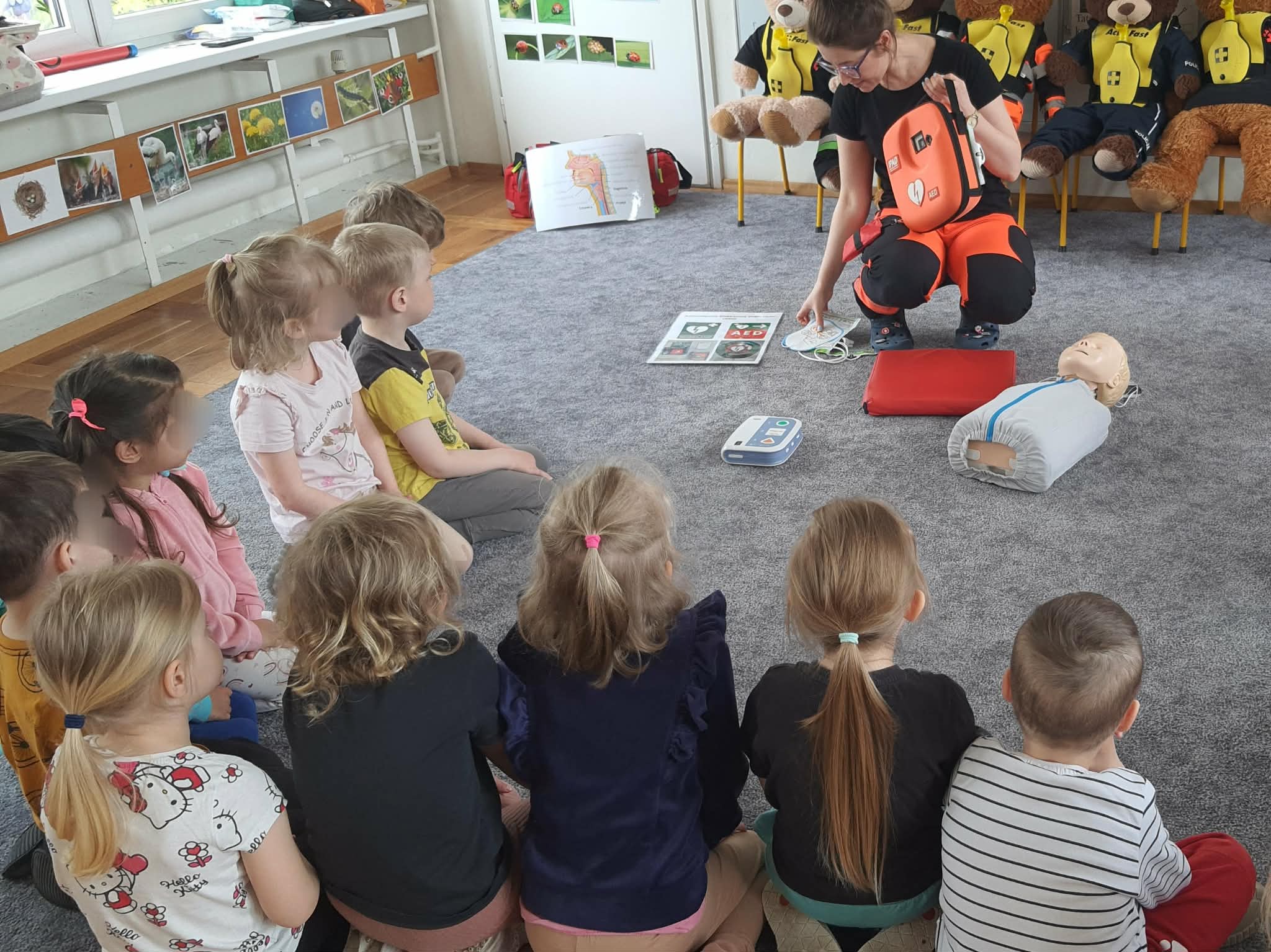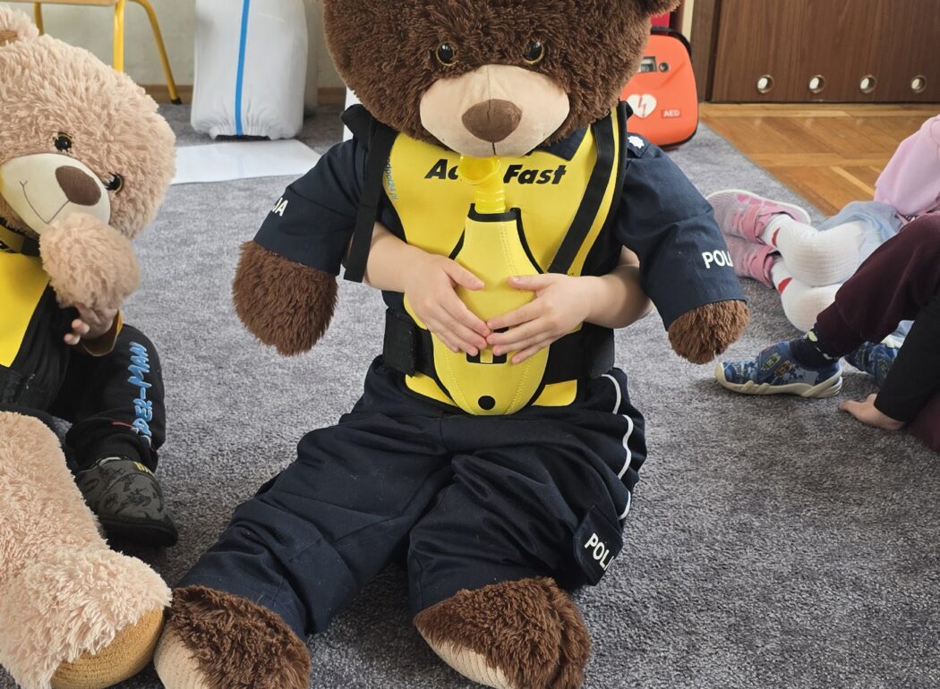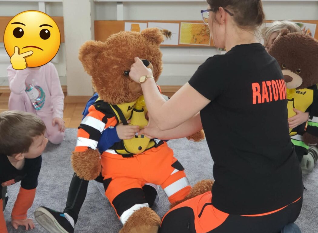 Nasze przedszkole odwiedziła Ekipa Ratownika, która udowodniła, że każdy – niezależnie od wieku – może zostać bohaterem. Przedszkolaki w formie radosnej zabawy uczyły się, jak pomóc przy zadławieniu oraz jak działa „gadające pudełko”, czyli defibrylator AED.Najmłodsze dzieci wzięły udział w specjalnych warsztatach „Uratuj misia”. Maluchy z wielką troską wcieliły się w rolę lekarzy i ratowników: dokładnie badały swoje pluszaki, sprawdzały, czy misie są zdrowe, a na koniec profesjonalnie je opatrywały.Co robili starsi bohaterowie?-