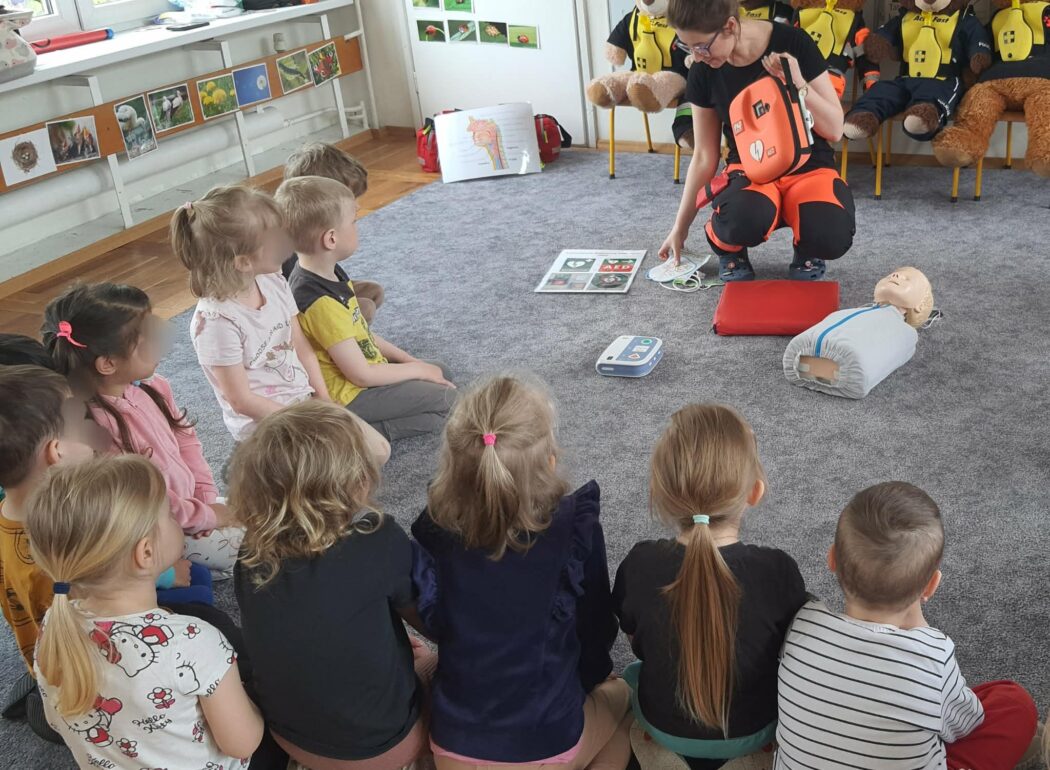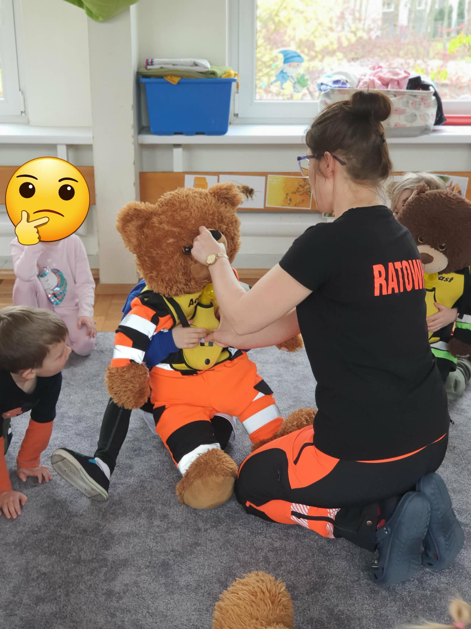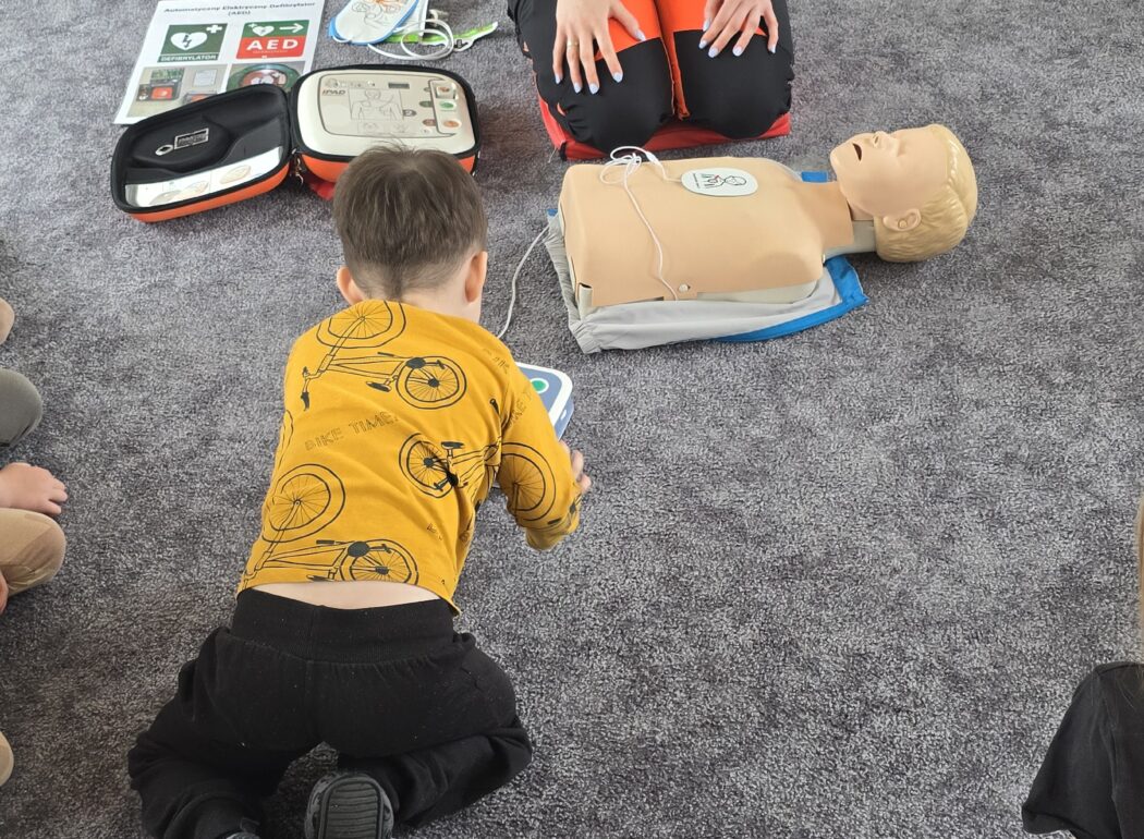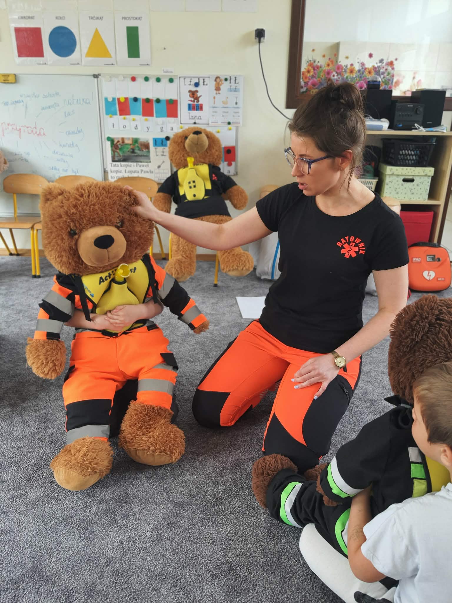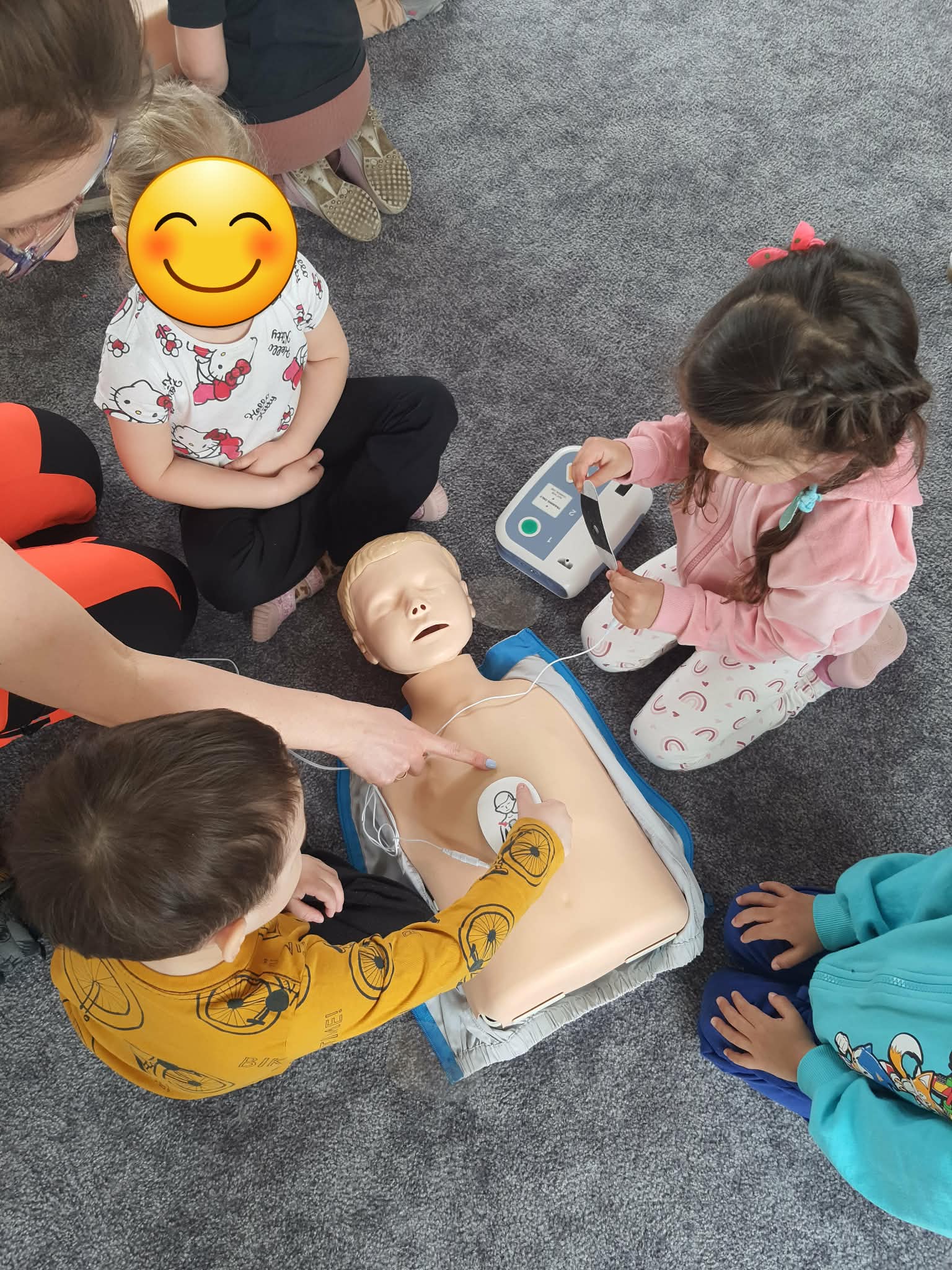 Nasze przedszkole odwiedziła Ekipa Ratownika, która udowodniła, że każdy – niezależnie od wieku – może zostać bohaterem. Przedszkolaki w formie radosnej zabawy uczyły się, jak pomóc przy zadławieniu oraz jak działa „gadające pudełko”, czyli defibrylator AED.Najmłodsze dzieci wzięły udział w specjalnych warsztatach „Uratuj misia”. Maluchy z wielką troską wcieliły się w rolę lekarzy i ratowników: dokładnie badały swoje pluszaki, sprawdzały, czy misie są zdrowe, a na koniec profesjonalnie je opatrywały.Co robili starsi bohaterowie?-