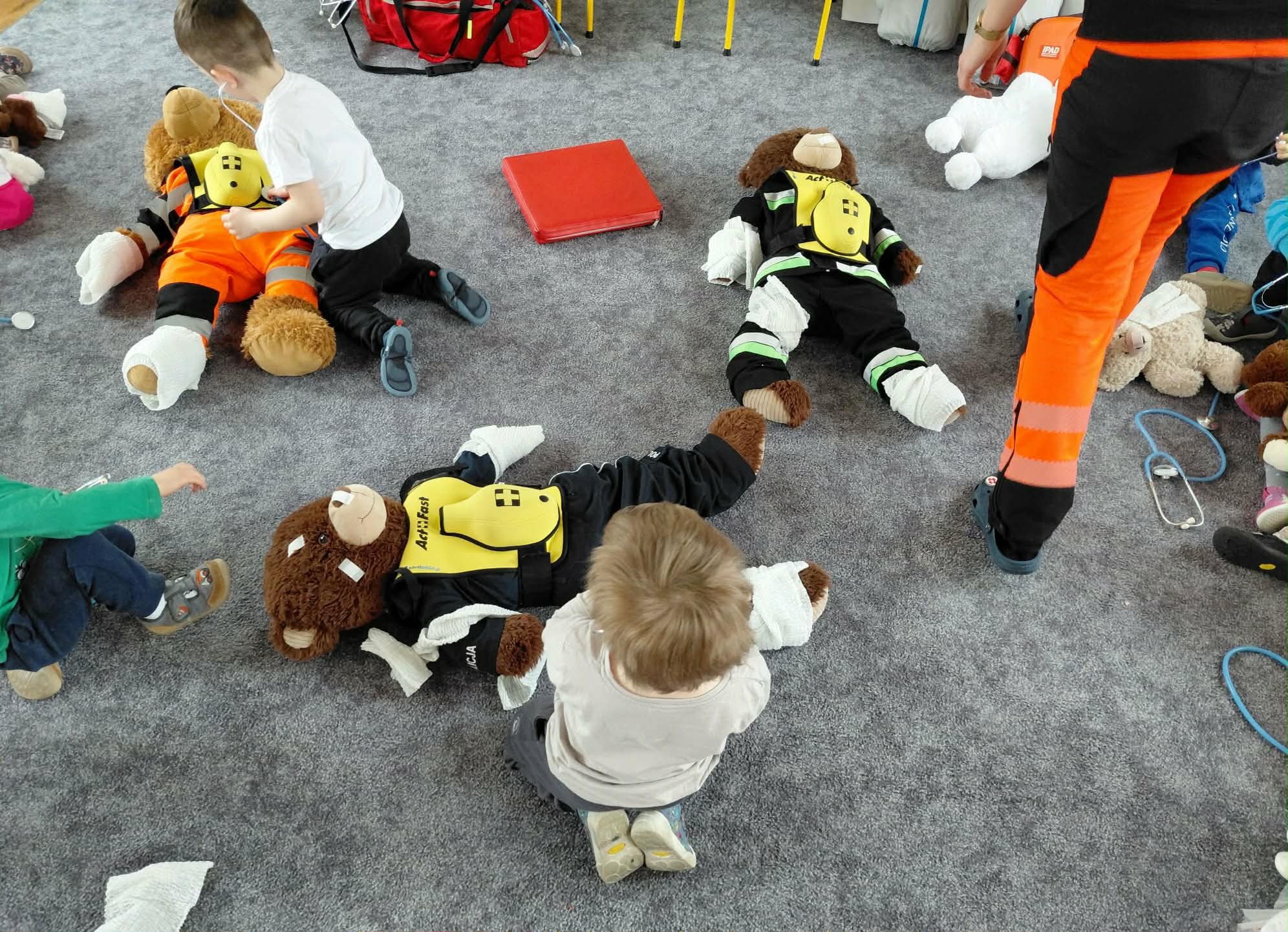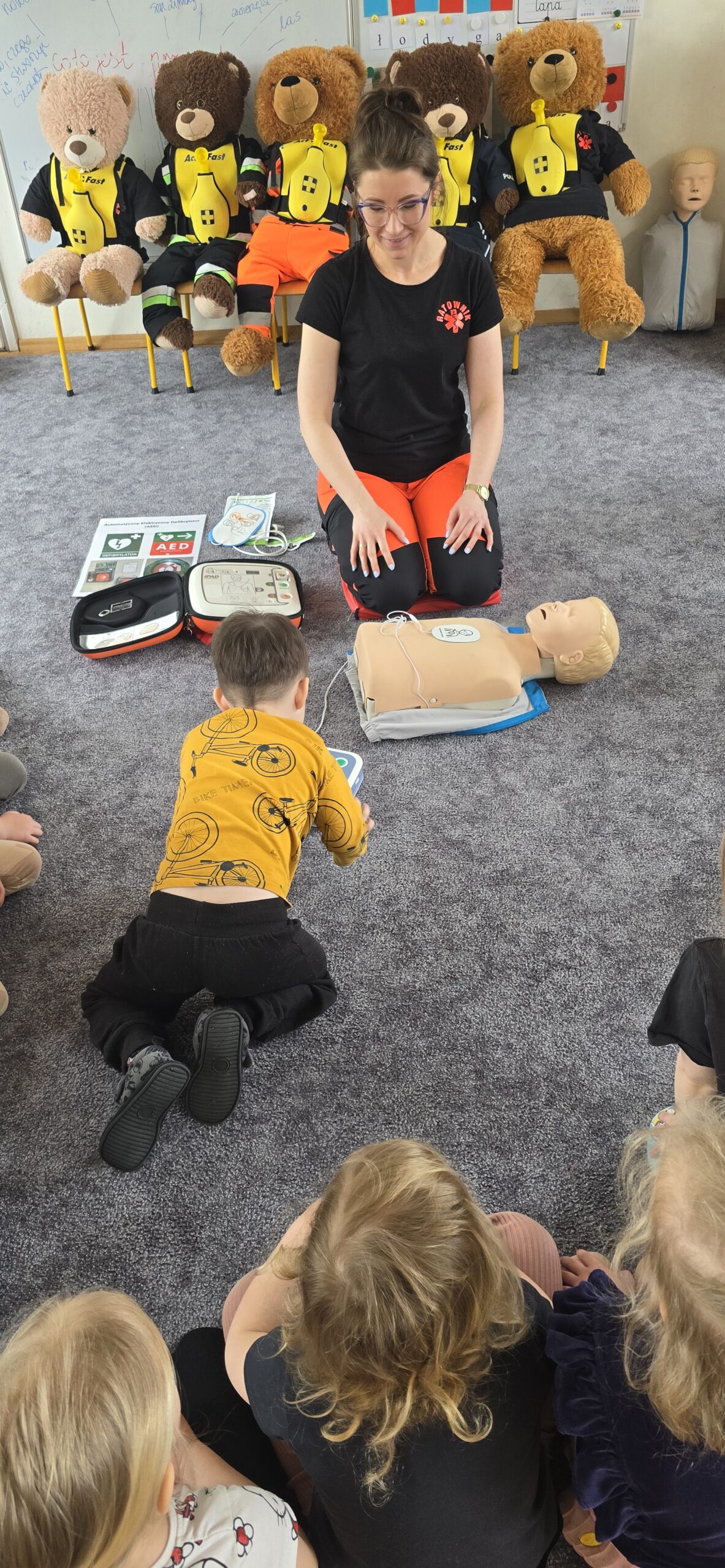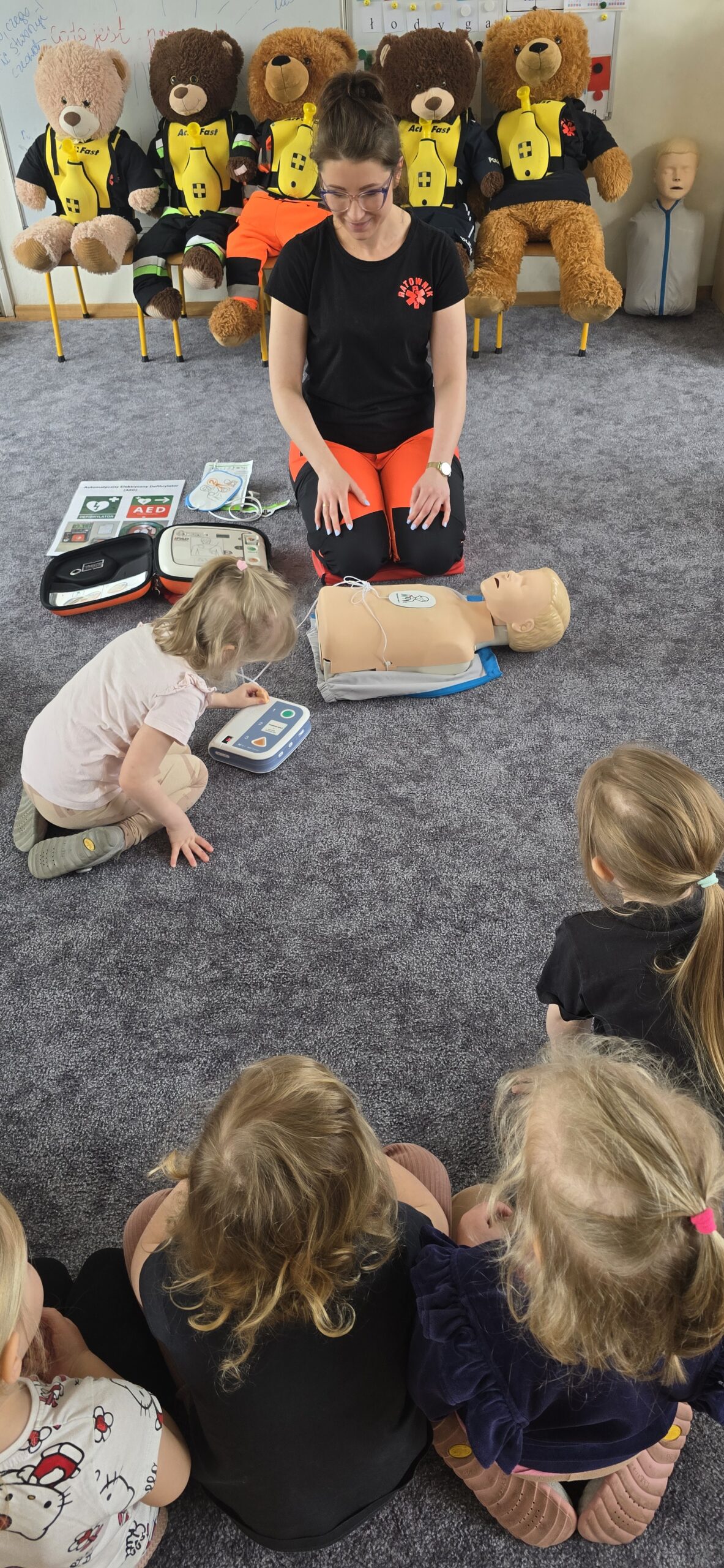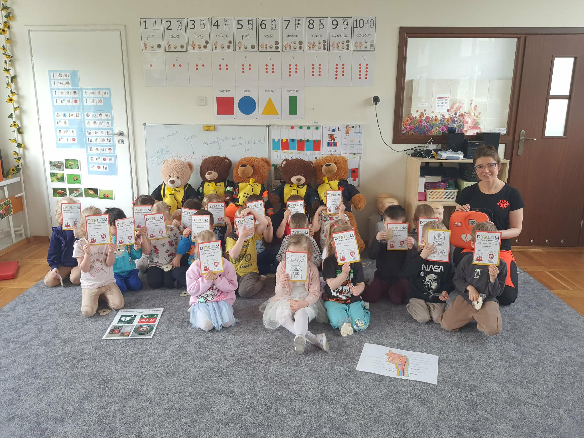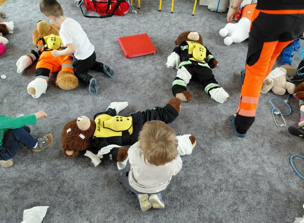 Nasze przedszkole odwiedziła Ekipa Ratownika, która udowodniła, że każdy – niezależnie od wieku – może zostać bohaterem. Przedszkolaki w formie radosnej zabawy uczyły się, jak pomóc przy zadławieniu oraz jak działa „gadające pudełko”, czyli defibrylator AED.Najmłodsze dzieci wzięły udział w specjalnych warsztatach „Uratuj misia”. Maluchy z wielką troską wcieliły się w rolę lekarzy i ratowników: dokładnie badały swoje pluszaki, sprawdzały, czy misie są zdrowe, a na koniec profesjonalnie je opatrywały.Co robili starsi bohaterowie?-