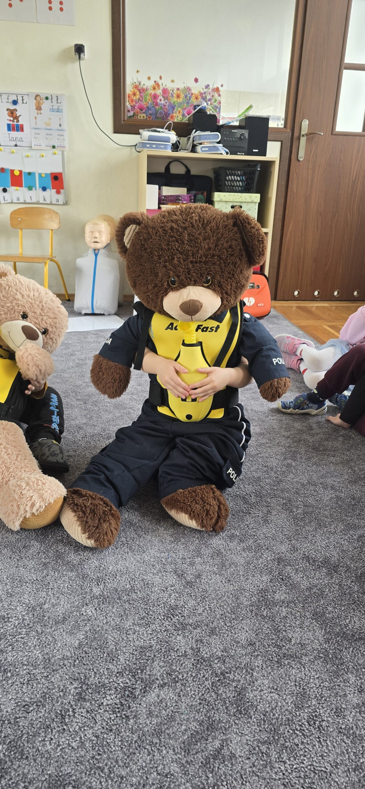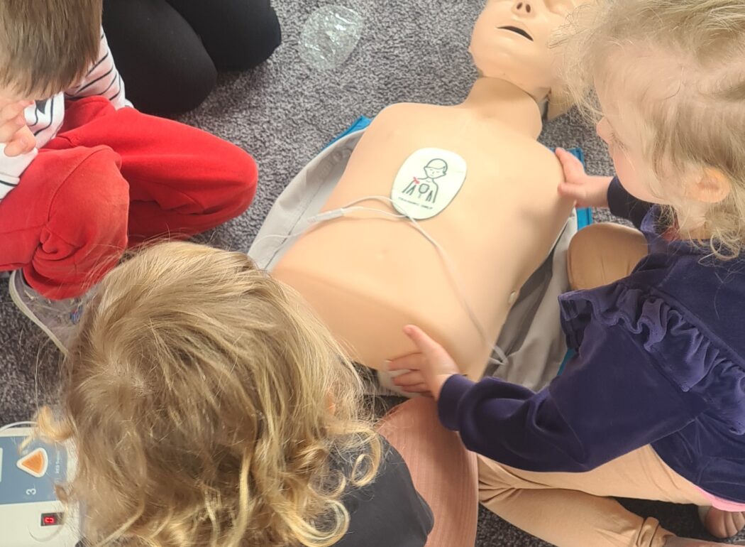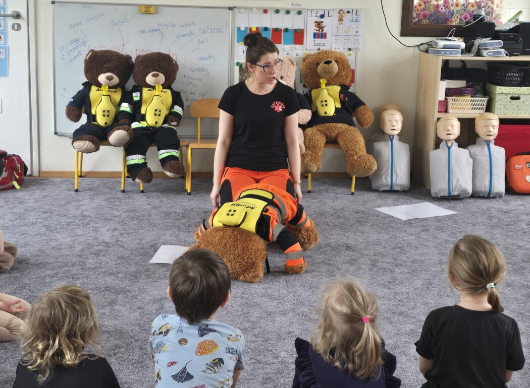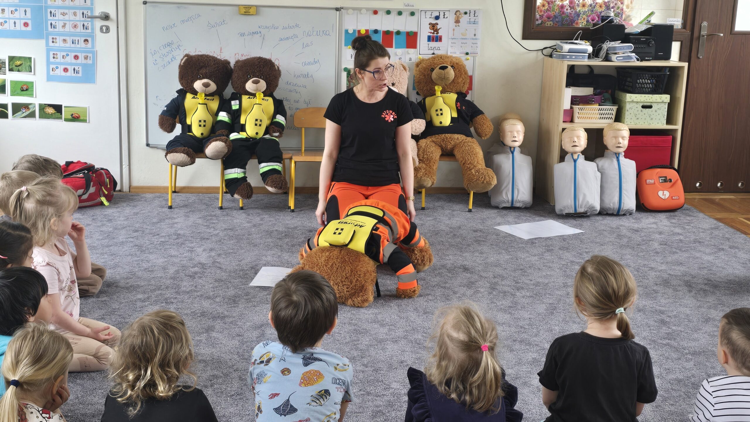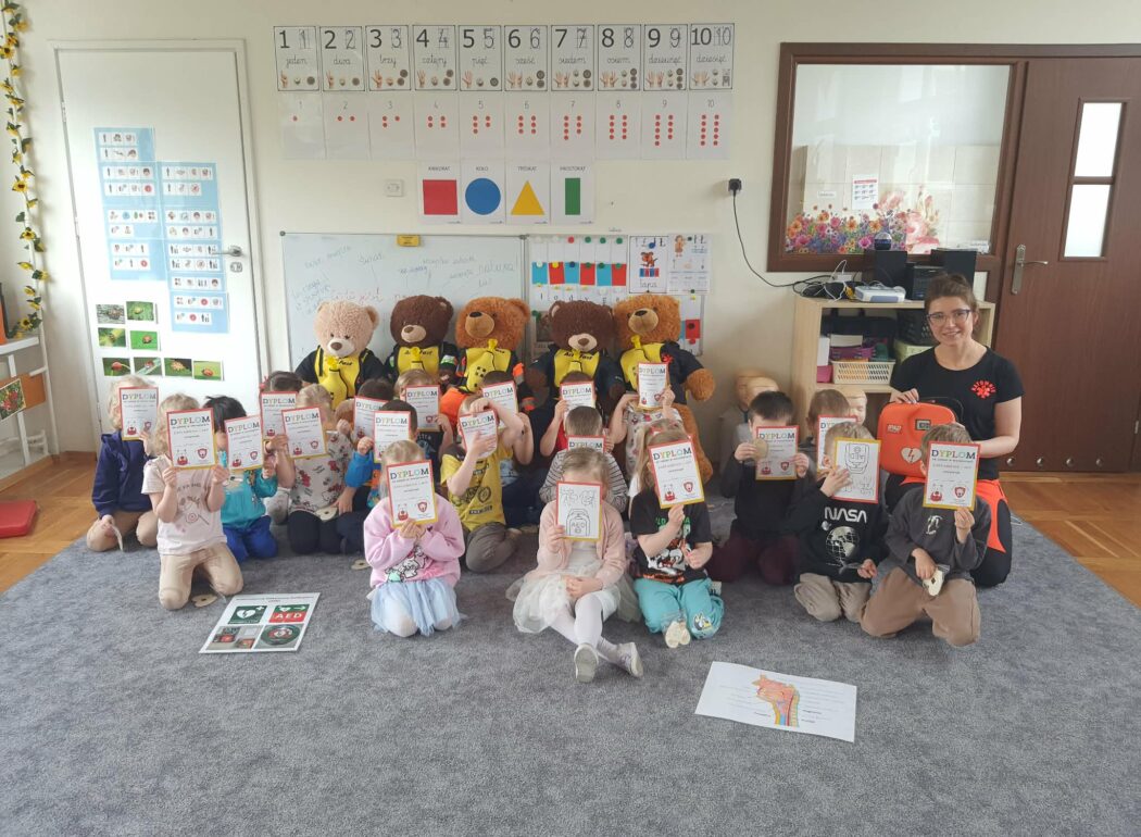 Nasze przedszkole odwiedziła Ekipa Ratownika, która udowodniła, że każdy – niezależnie od wieku – może zostać bohaterem. Przedszkolaki w formie radosnej zabawy uczyły się, jak pomóc przy zadławieniu oraz jak działa „gadające pudełko”, czyli defibrylator AED.Najmłodsze dzieci wzięły udział w specjalnych warsztatach „Uratuj misia”. Maluchy z wielką troską wcieliły się w rolę lekarzy i ratowników: dokładnie badały swoje pluszaki, sprawdzały, czy misie są zdrowe, a na koniec profesjonalnie je opatrywały.Co robili starsi bohaterowie?-