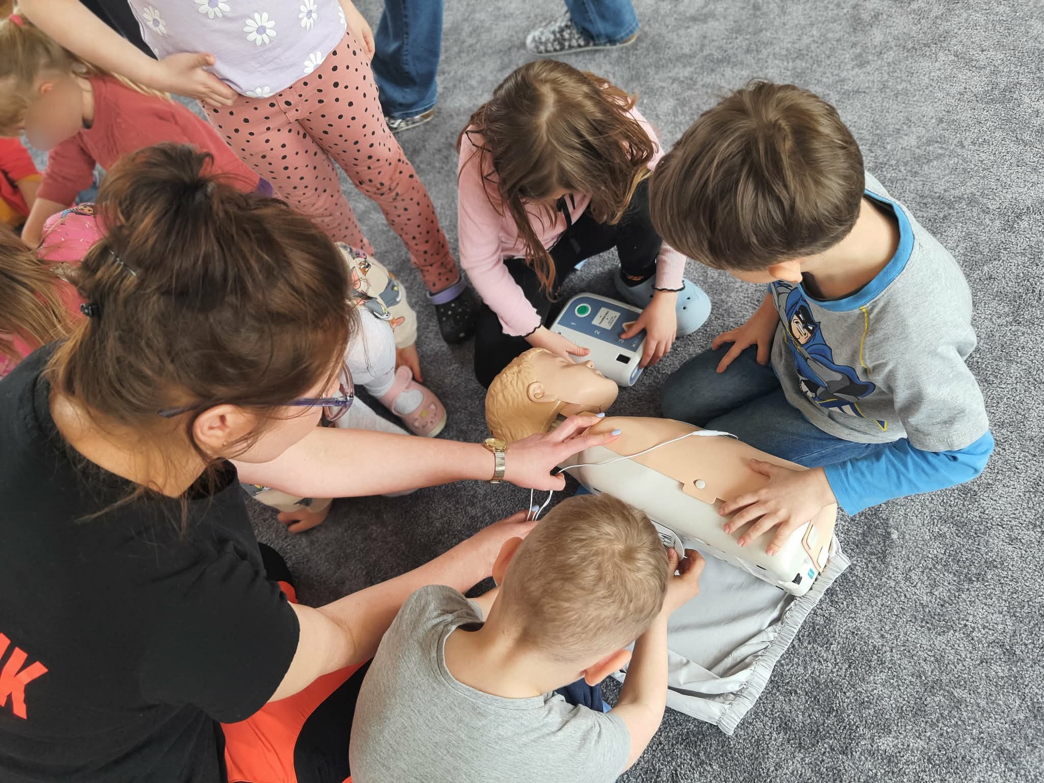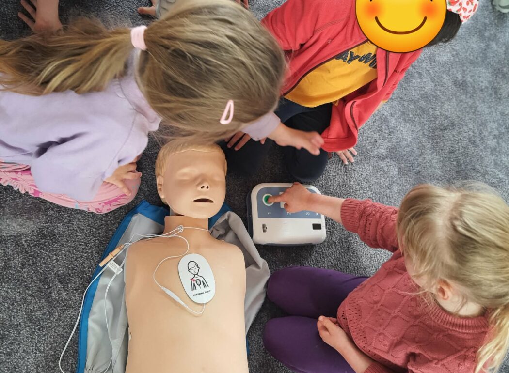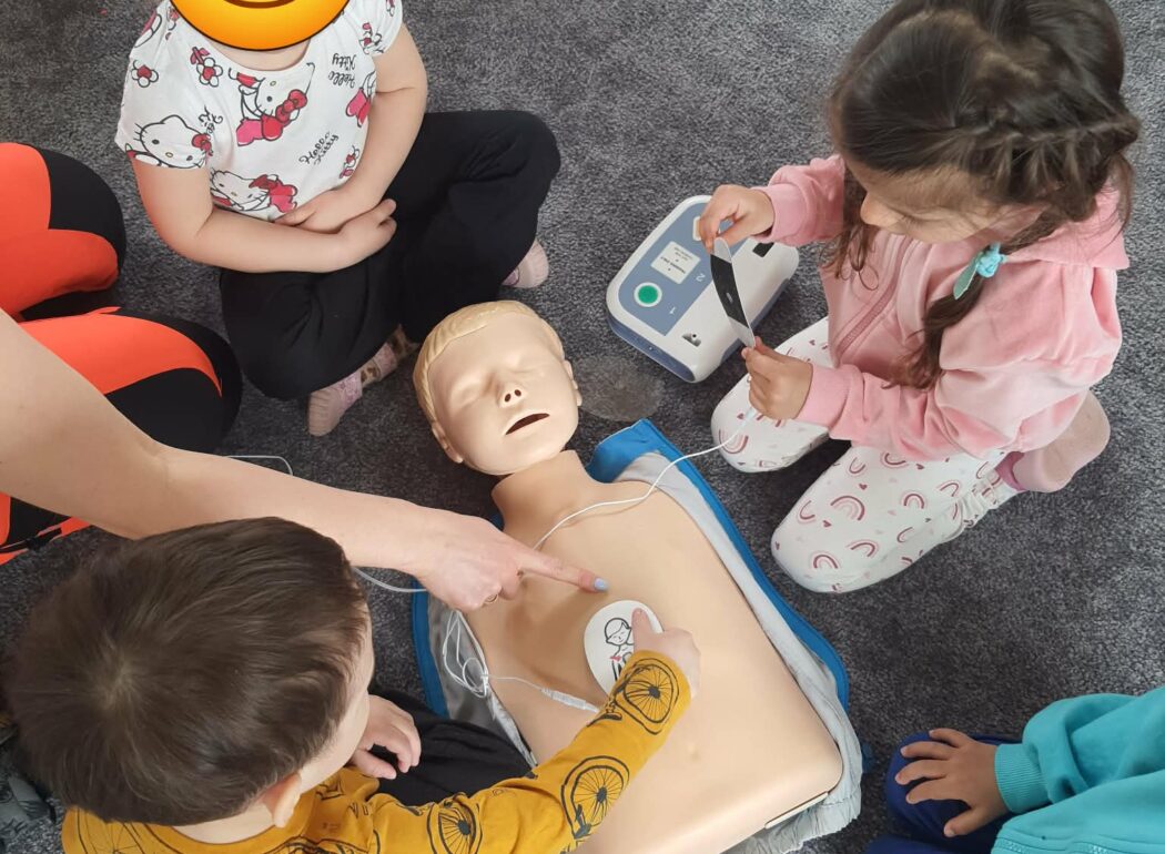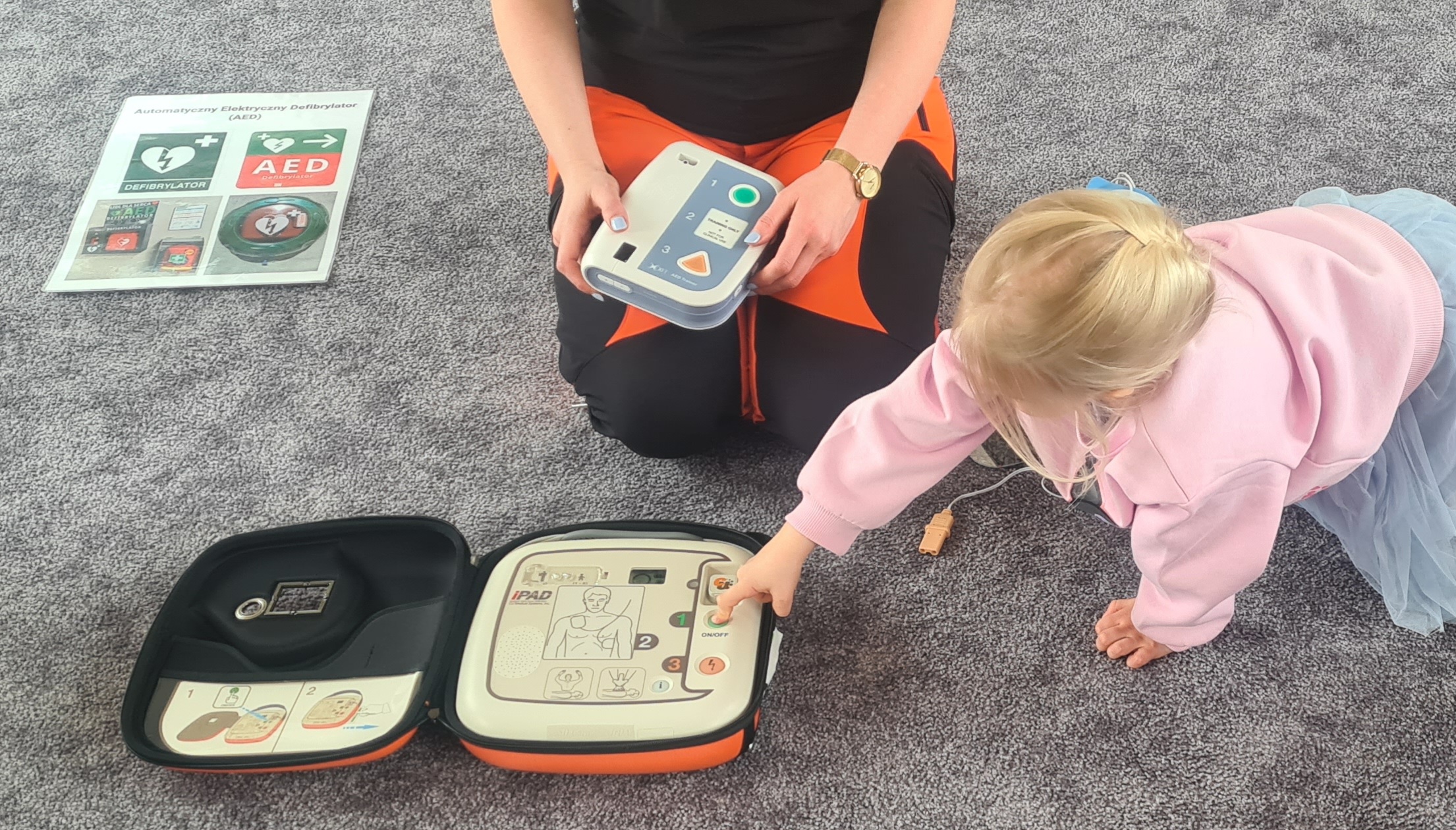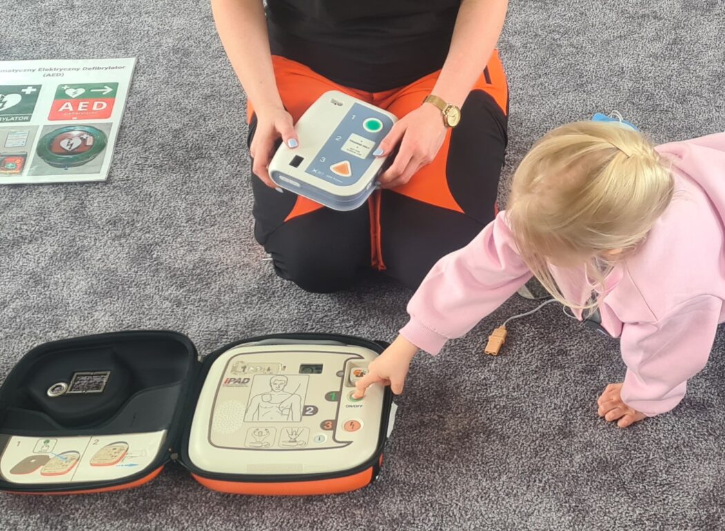 Obsługa AED: Dzieci sprawdziły, jak defibrylator wydaje jasne polecenia i pomaga prowadzić akcję ratunkową krok po kroku.