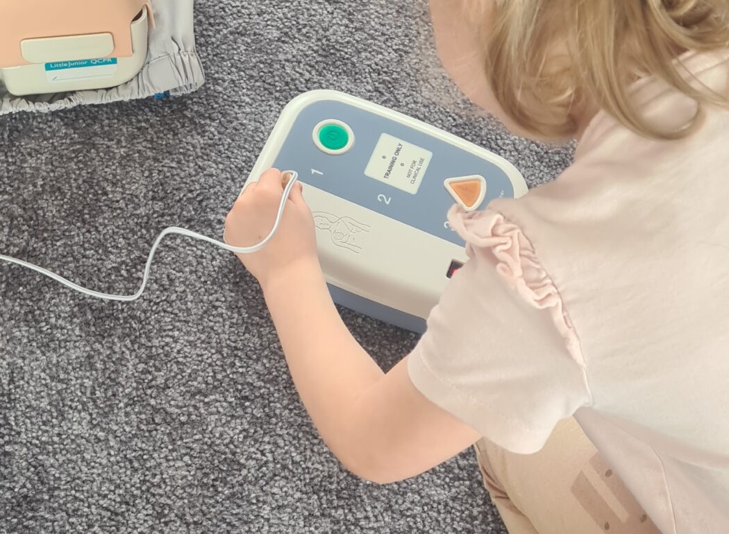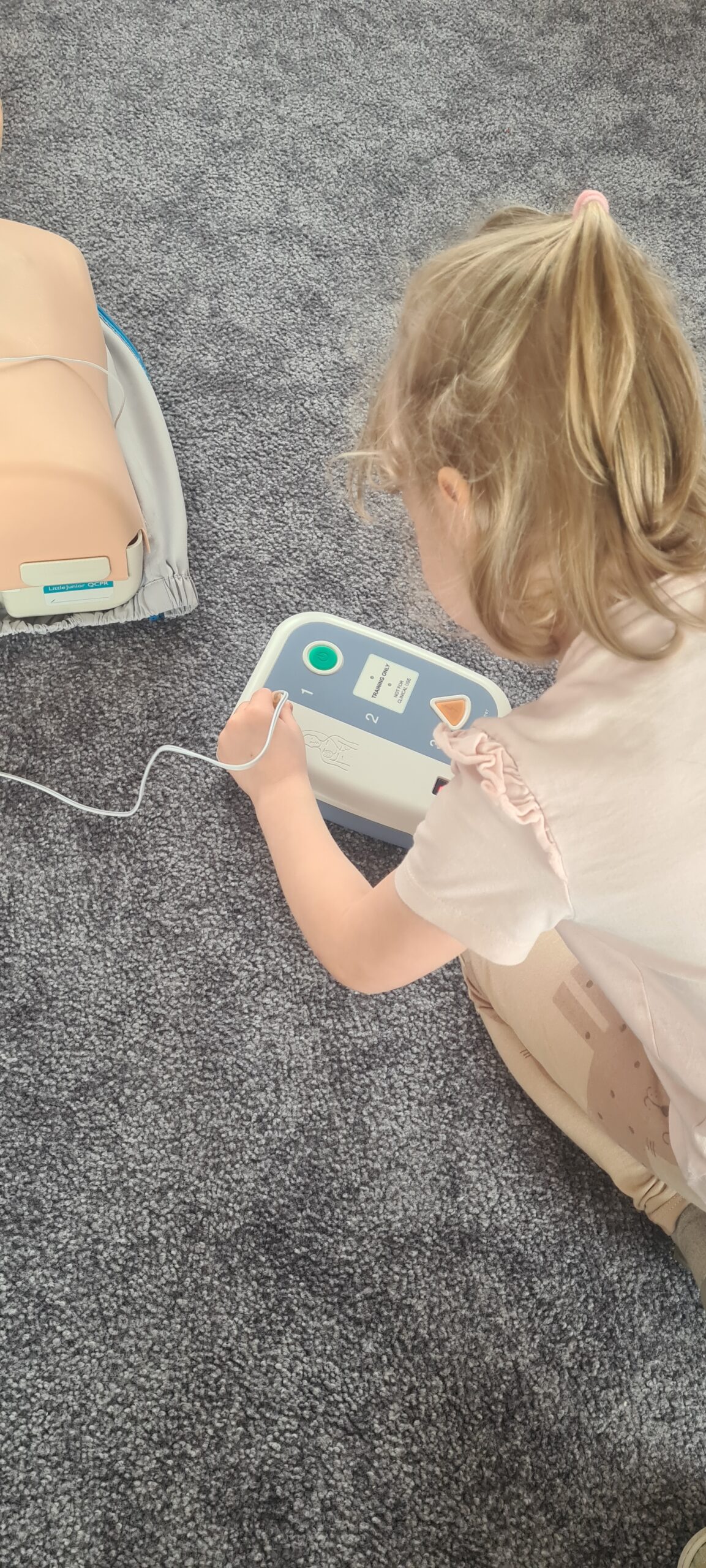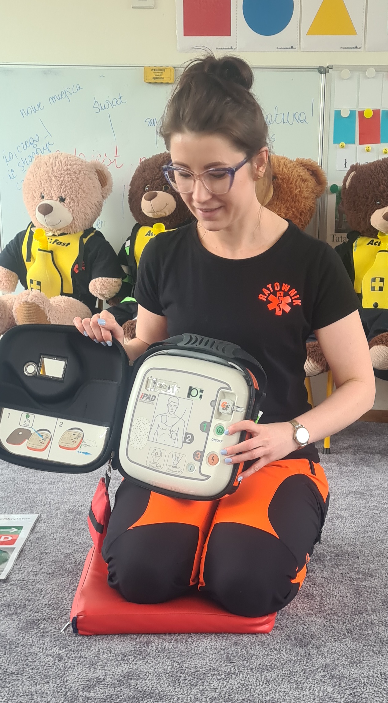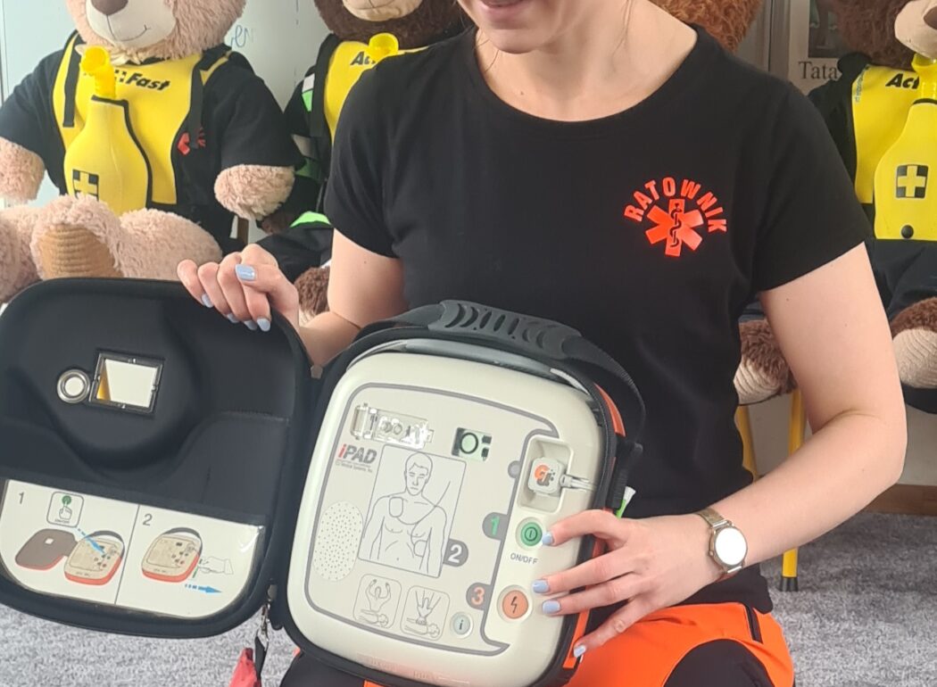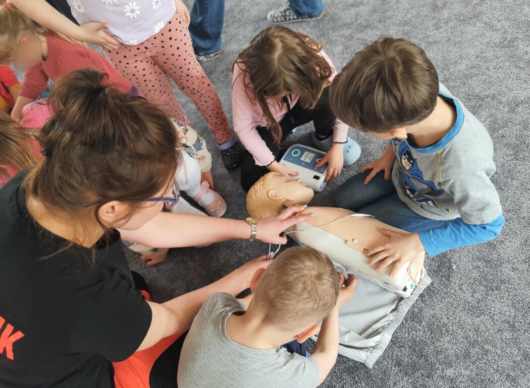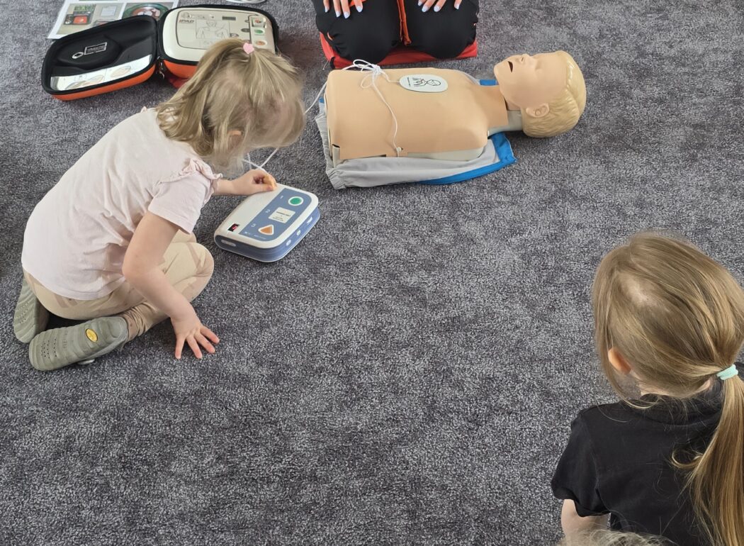 Obsługa AED: Dzieci sprawdziły, jak defibrylator wydaje jasne polecenia i pomaga prowadzić akcję ratunkową krok po kroku.