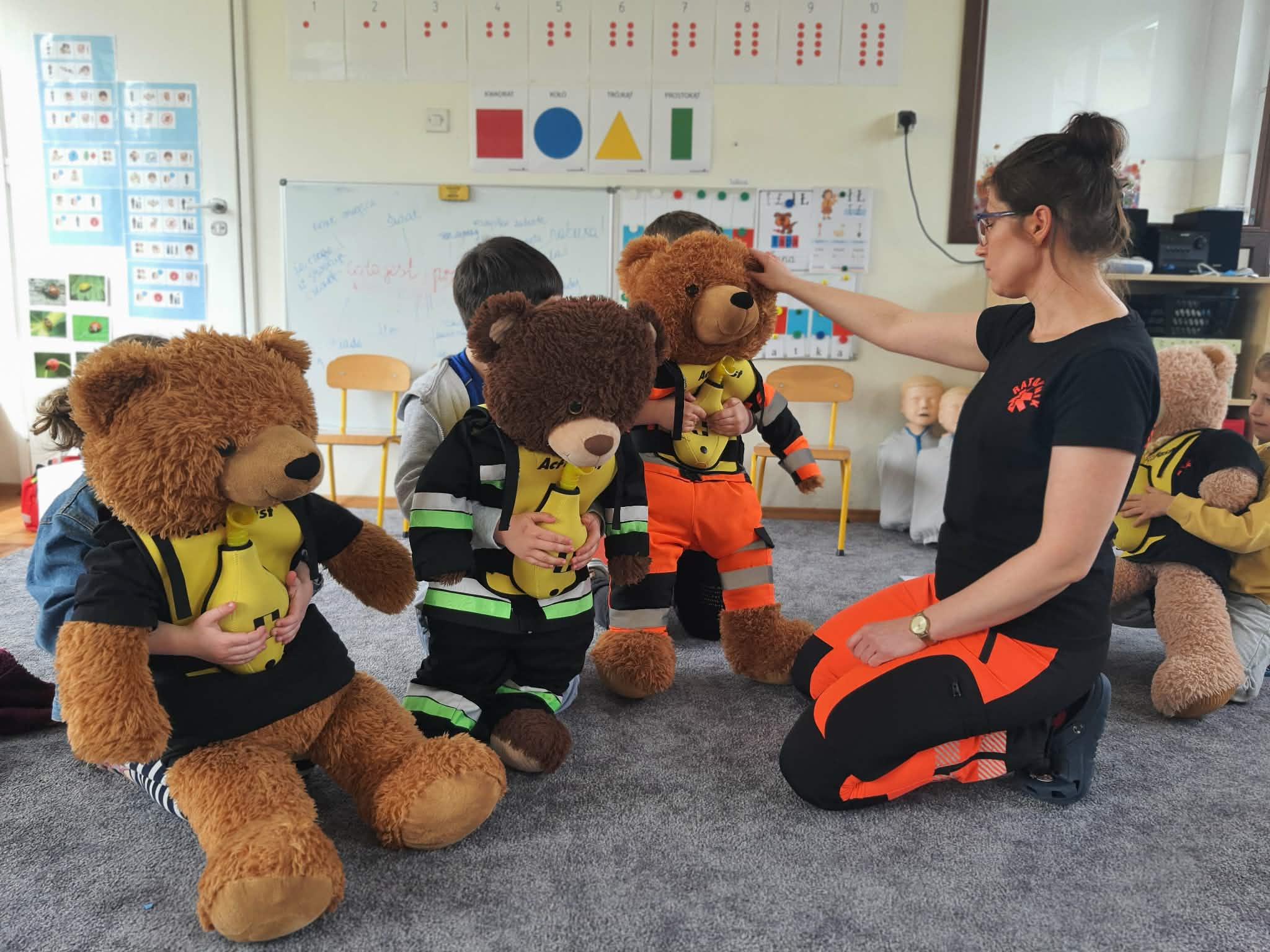 Ratowanie misiów przy zadławieniu: Starszaki z wielkim przejęciem ćwiczyły jak postępować przy zadławieniu na pluszowych pacjentach, ucząc się odpowiednich ruchów.